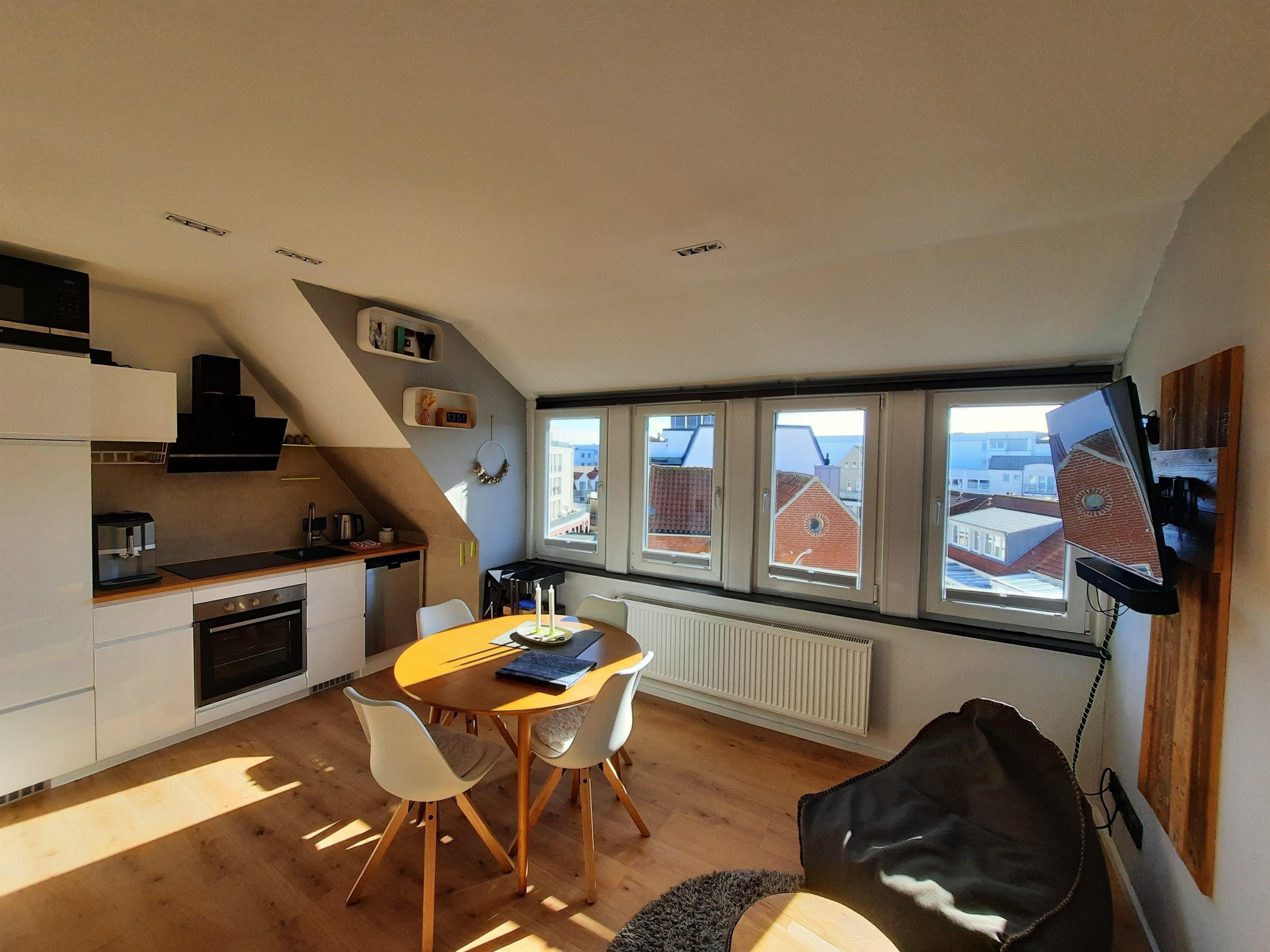Die Küche ist mit allen nötigen Utensilien wie Kühlschrank inklusive Gefrierfach, Wasserkocher, Mikrowelle mit Grillfunktion, elektrischer Stabmixer, Toaster, Kaffeevollautomat, Backofen, Induktionskochfeld, Spülmaschine etc. ausgestattet (Geräte überwiegend von Siemens). Vom angrenzenden Essplatz aus hat man einen schönen Ausblick über die Dächer Norderneys.