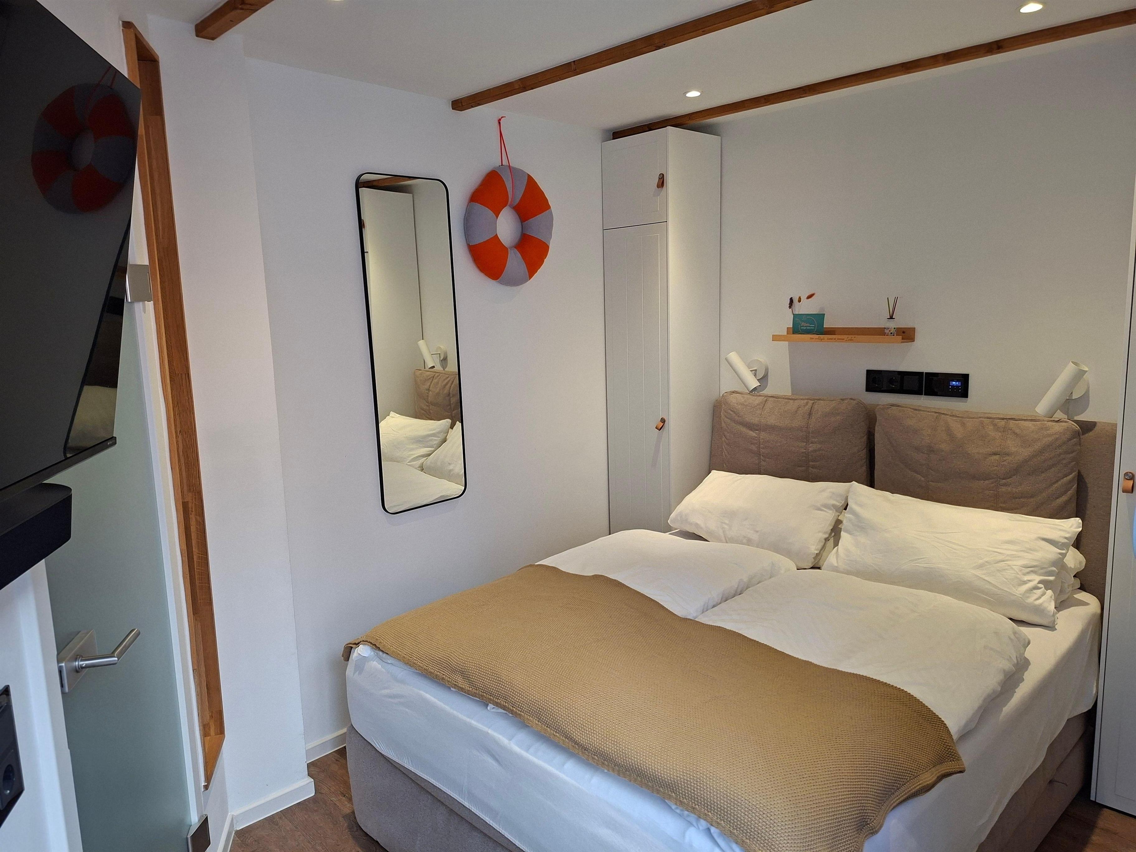 Das Schlafzimmer verfügt über ein Boxspringbrett in der Größe 1,60 m x 2,00 m und zwei Kleiderschränken. Vom Bett aus kann man bequem den Flachbild-TV inkl. Sonos Soundbar an der gegenüberliegenden Wand nutzen. Das bodentiefe Fenster lässt sich komplett öffnen und führt zur Terrasse.
