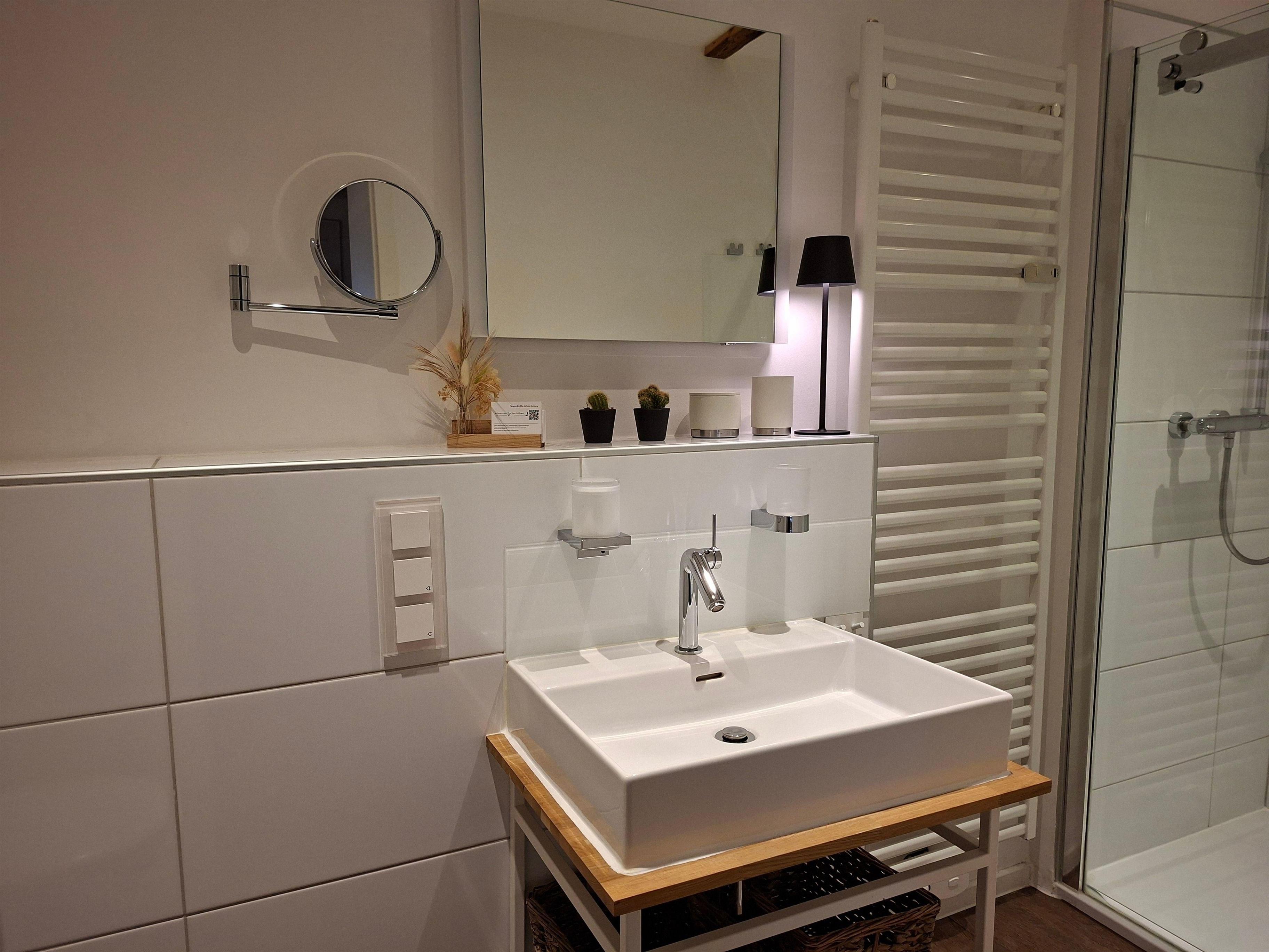 Das Bad mit seiner bodentiefen Dusche wurde mit Gegenständen von Keuco ausgestattet. Der hochwertige Wandspiegel lässt sich beleuchten (und dimmen).