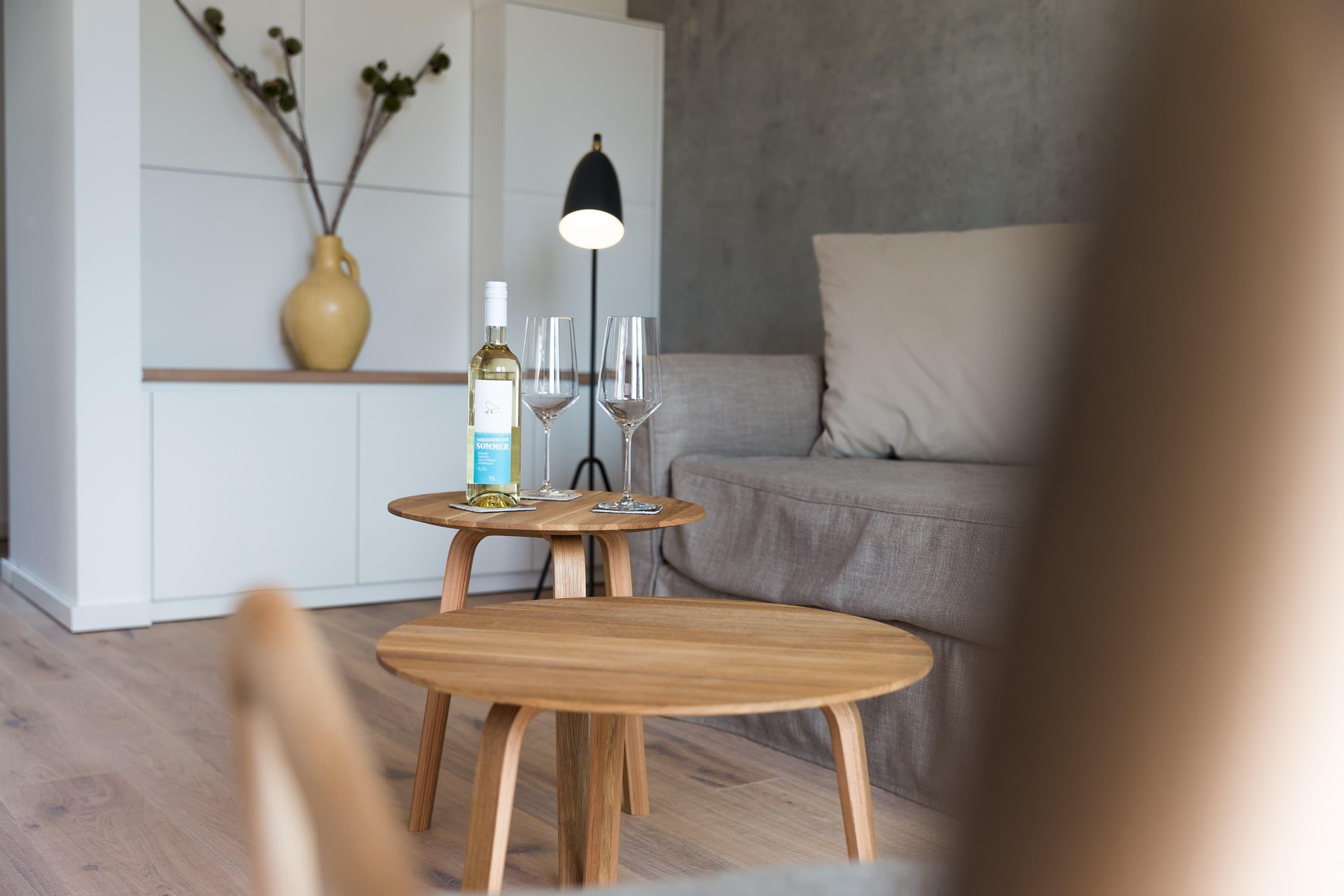 Die Ferienwohnung „dünenBlick“ ist eine exklusiv ausgestattete Wohnung mit 55qm für zwei Personen. Ausgestattet mit einem großzügigen Wohn- und Essbereich inkl. Gas-Kamin und gemütlichem Sofa, offener Küche, einem Südbalkon zum Garten, Schlafzimmer mit Doppelbett, Badezimmer und Gäste-WC.