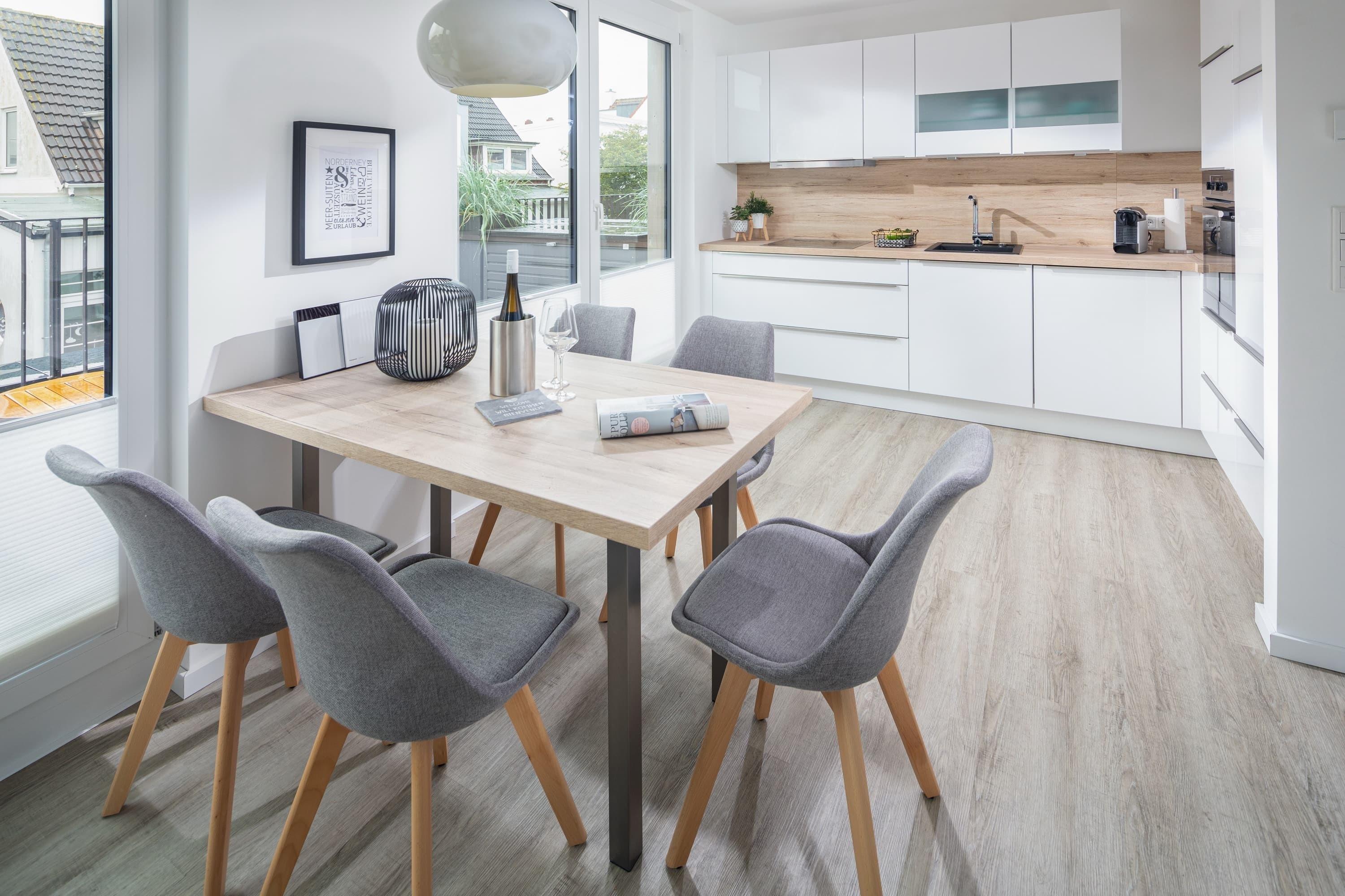 Im Haus gibt es insgesamt 7 Wohneinheiten. Die Meersuite N°4 liegt im 01. OG (Fahrstuhl) und verfügt über 2 Schlafzimmer mit Boxspringbetten, 2 Badezimmer (ebenerdige Dusche), ein separates WC und einen gemütlichen Wohnraum mit Eckcouch, Esstisch, offener Küche und Zugang zum geräumigen Balkon. Im Haus stehen Waschmaschine und Trockner gegen Gebühr zur Nutzung bereit. Fahrräder können hinter dem Haus abgestellt werden.