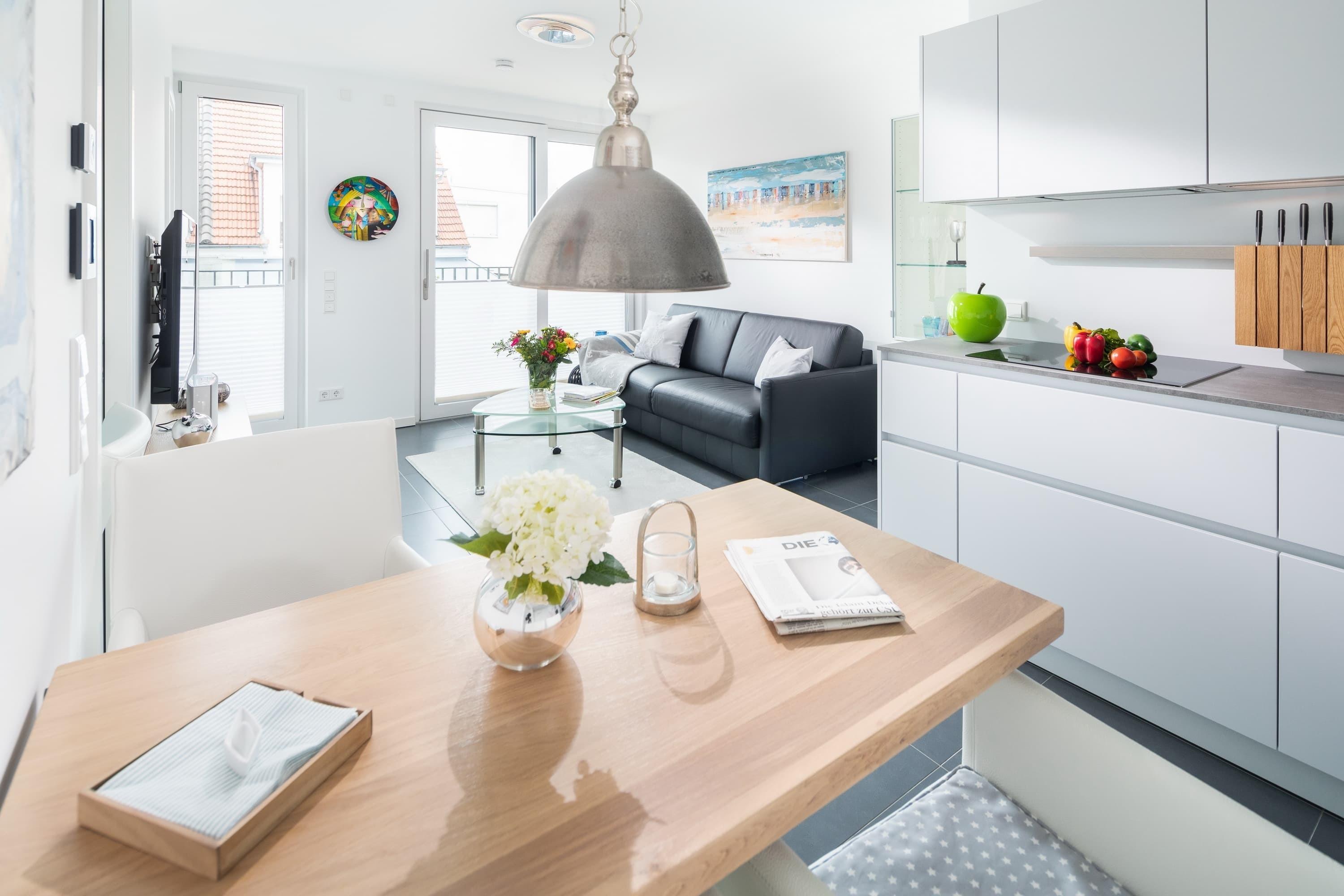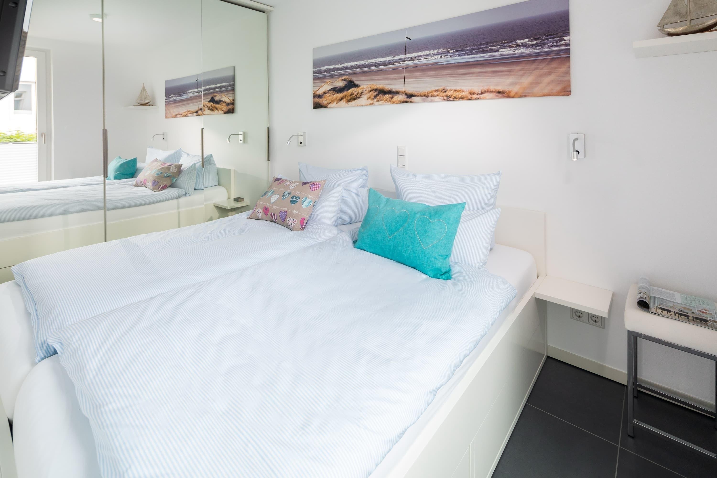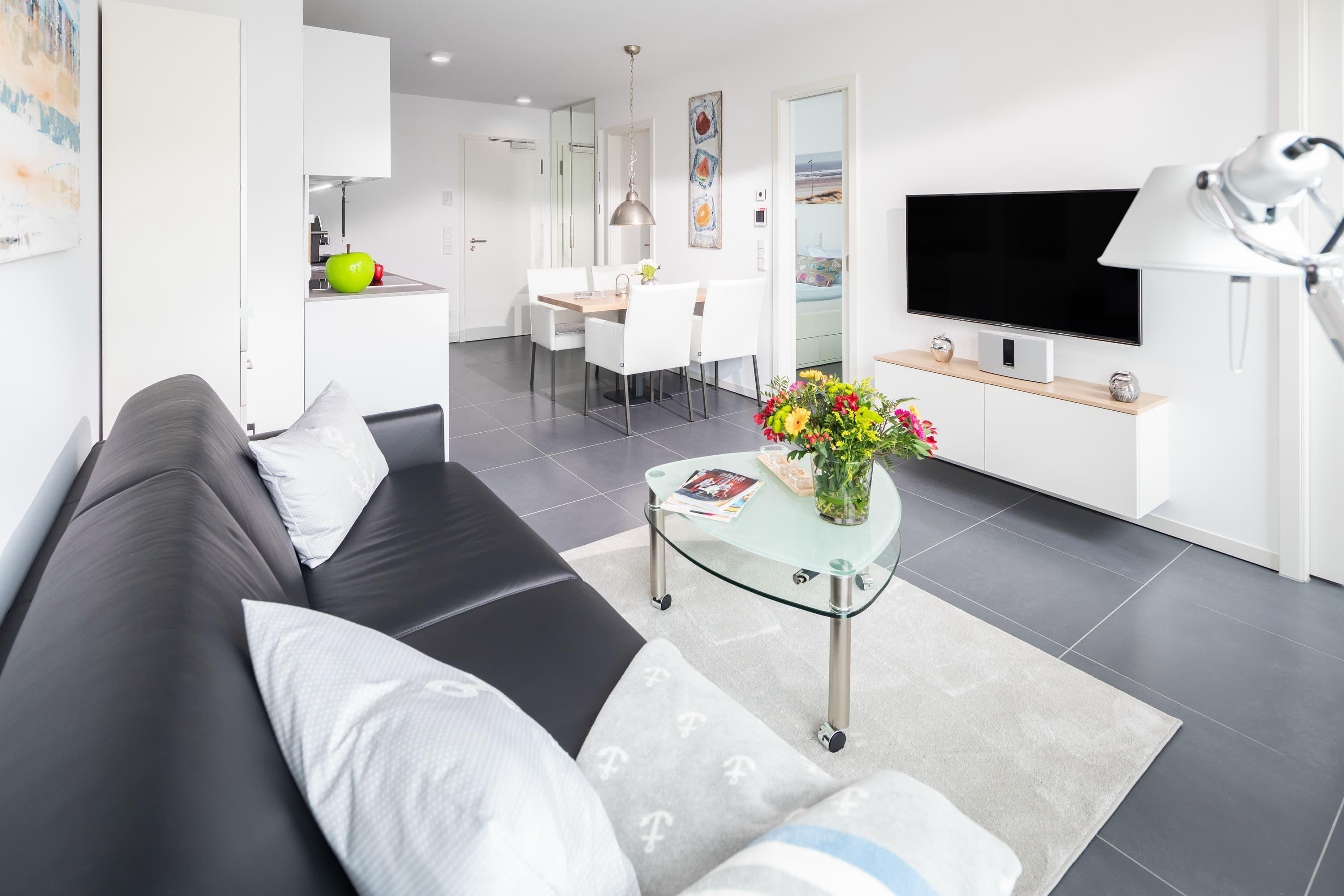 Die Wohnung liegt im ersten Stock eines im Mai 2018 fertig gestellten Neubaus. Sie besticht durch ihre Helligkeit und ihren großzügigen Schnitt. Alles wurde detailverliebt und mit besonderem Blick auf Hochwertigkeit für Sie gestaltet. Im Wohnbereich finden Sie neben der Einbauküche mit Jura-Kaffeevollautomaten einen Esstisch mit 4 Stühlen, eine Garderobe, ein Sofa (das sich mit weniger Handgriffen zu einem vollwertigen Bett mit Lattenrost ausziehen lässt) den Zugang zum geräumigen Südbalkon. Das „Norderneyer Schlafzimmer“ bietet neben dem 1,80m breiten Bett einen geräumigen Kleiderschrank. Das komfortable Duschbad mit Regendusche ist mit Fön, Kosmetikspiegel, Handtuchwärmer etc ausgestattet. Waschmaschine und Trockner stehen gegen Gebühr zu Verfügung. Fahrräder können hinter dem Haus abgestellt werden.