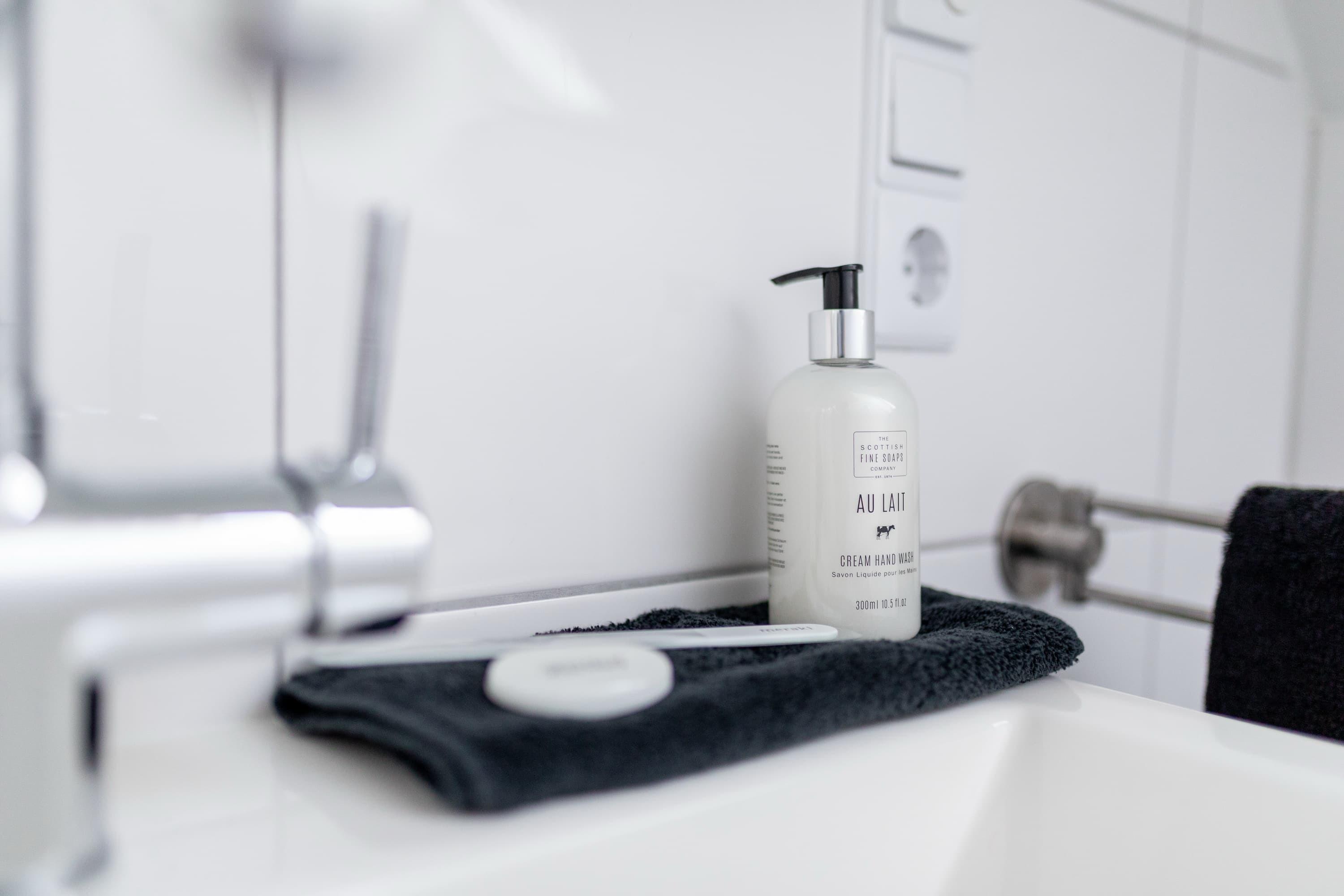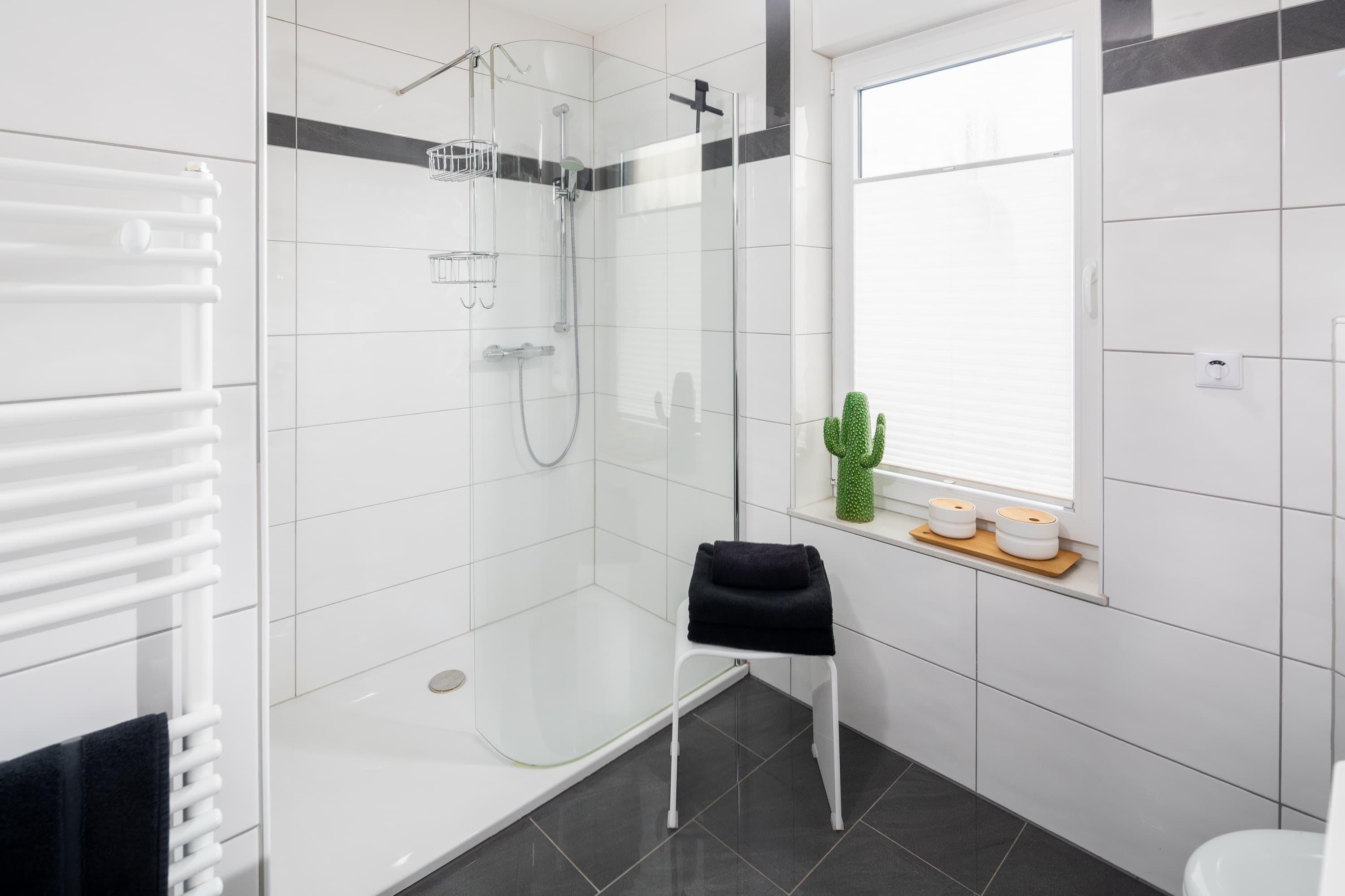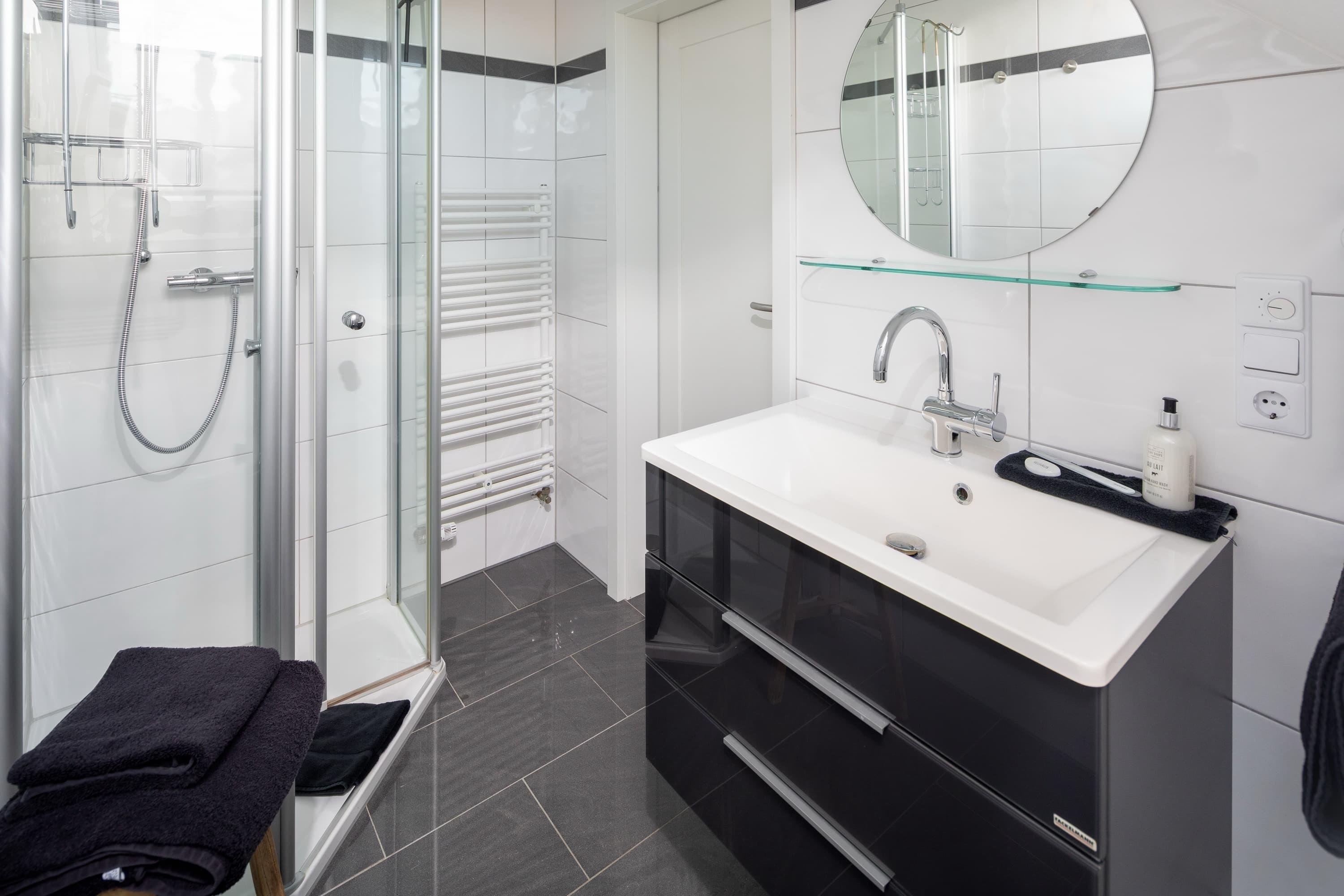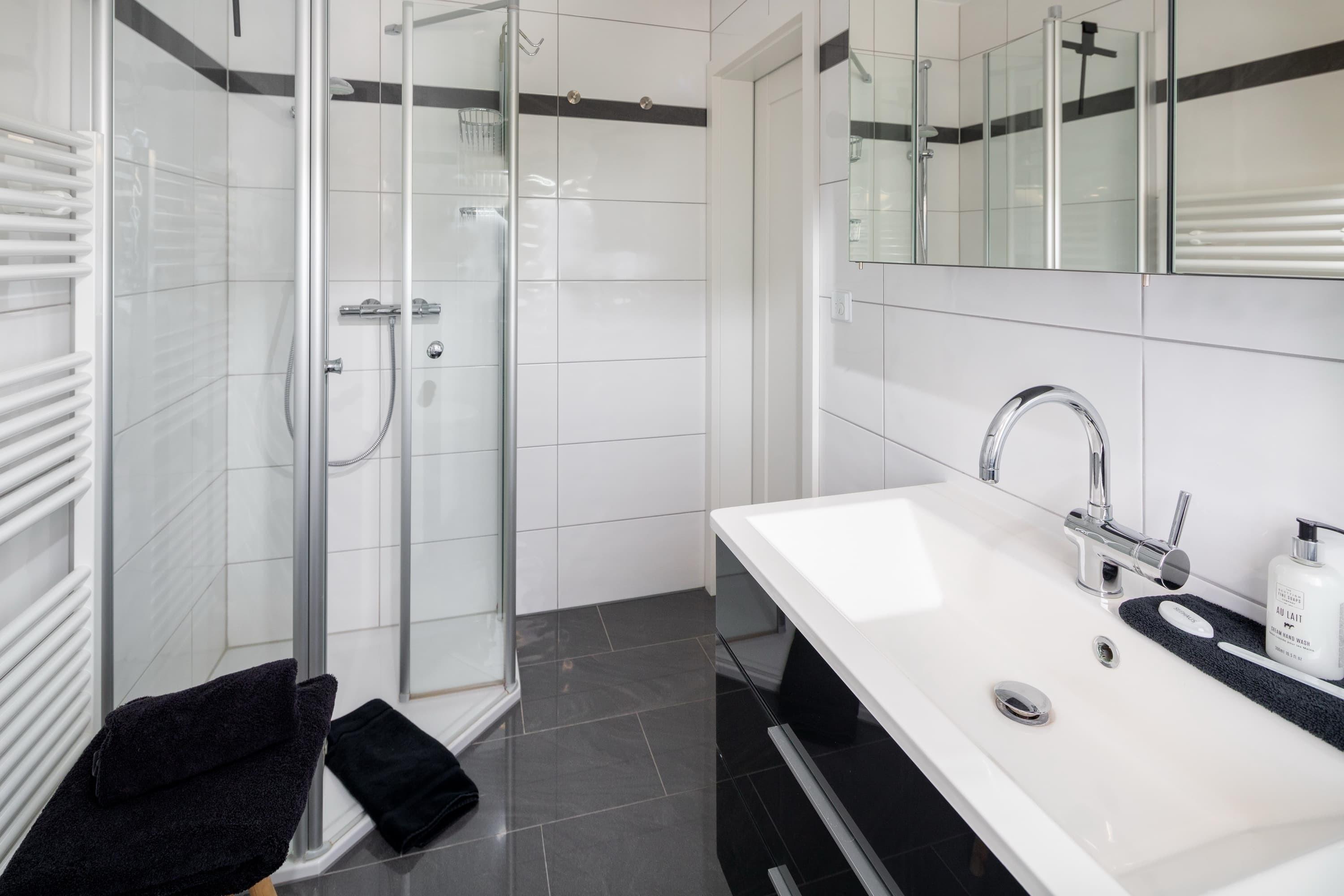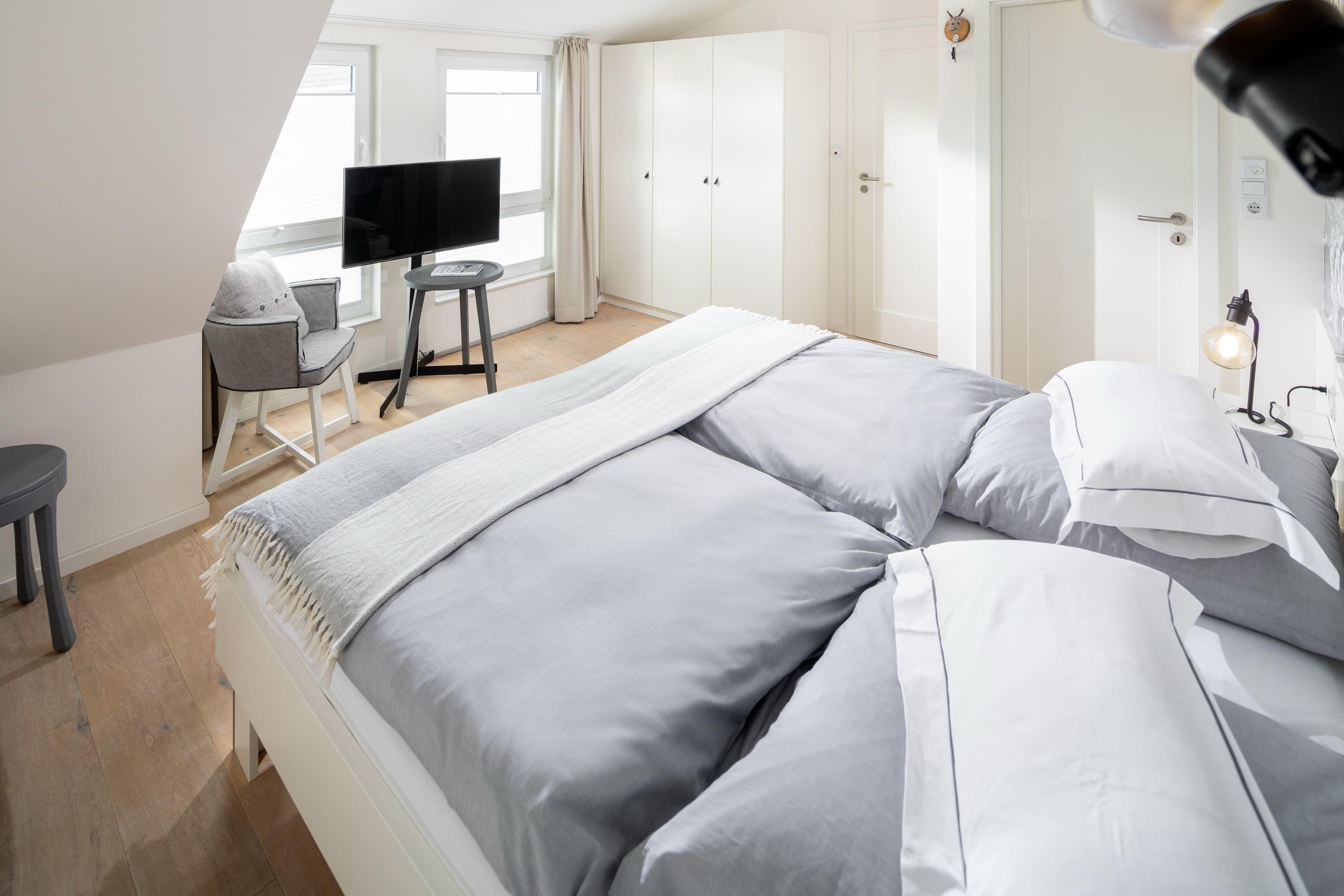Im unteren Bereich befindet sich eines der 3 Schlafzimmer (Doppelbett, 1,80m) mit angrenzendem Badezimmer (ebenerdig). Im oberen Stockwerk befinden sich zwei weitere Schlafzimmer mit Doppelbetten (1,80m breit) – jeweils mit einem Bad en suite. Alle Schlafzimmer verfügen über einen Fernseher. Für kleine Gäste stellen wir gern ein Reisebett zur Verfügung und haben natürlich auch auch eine Treppensicherung im Haus.