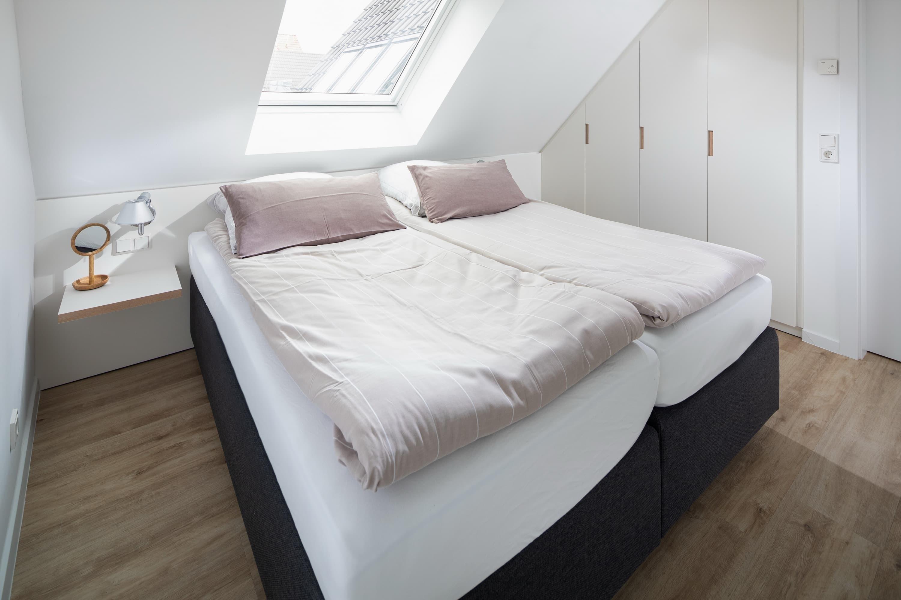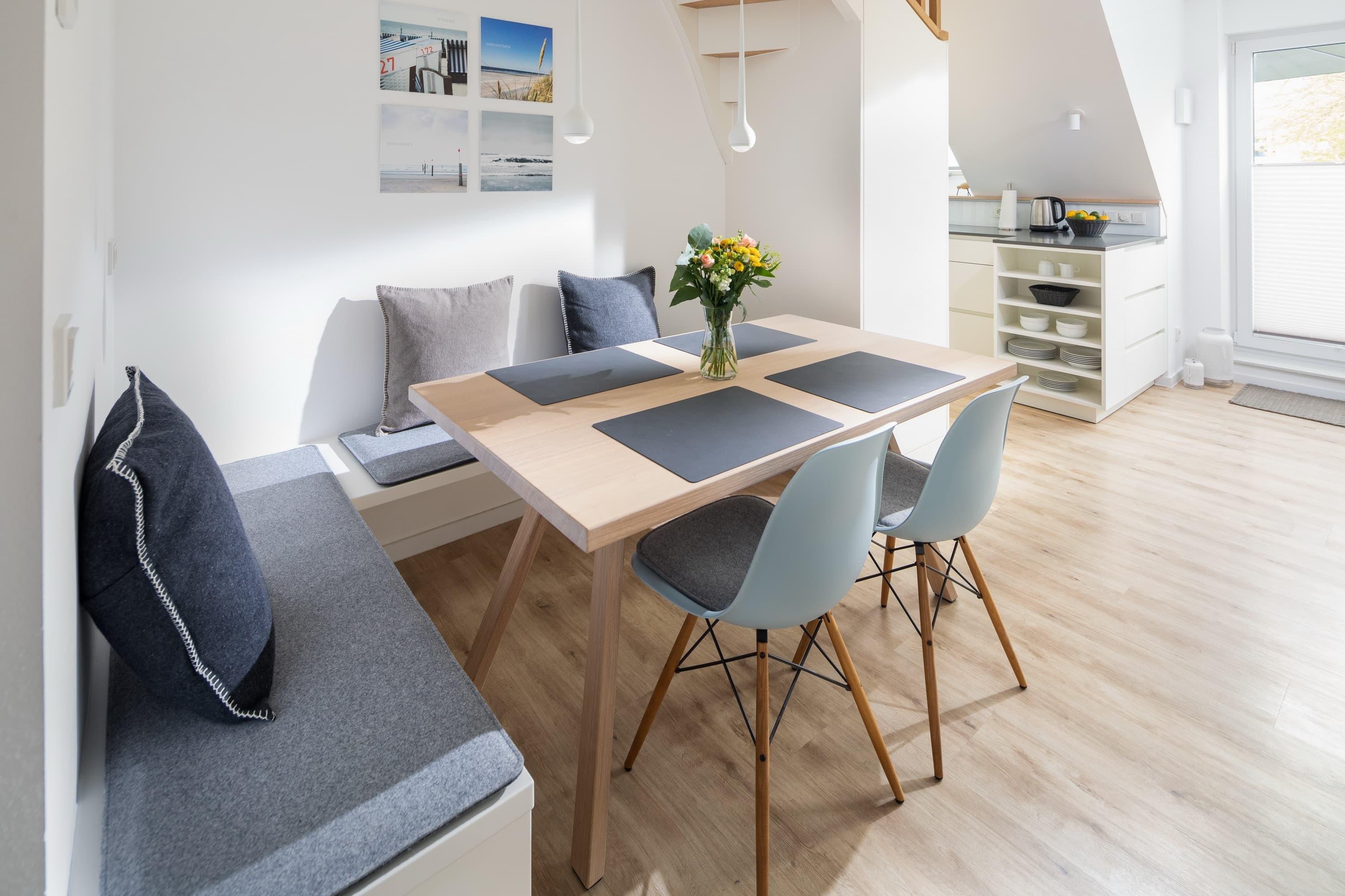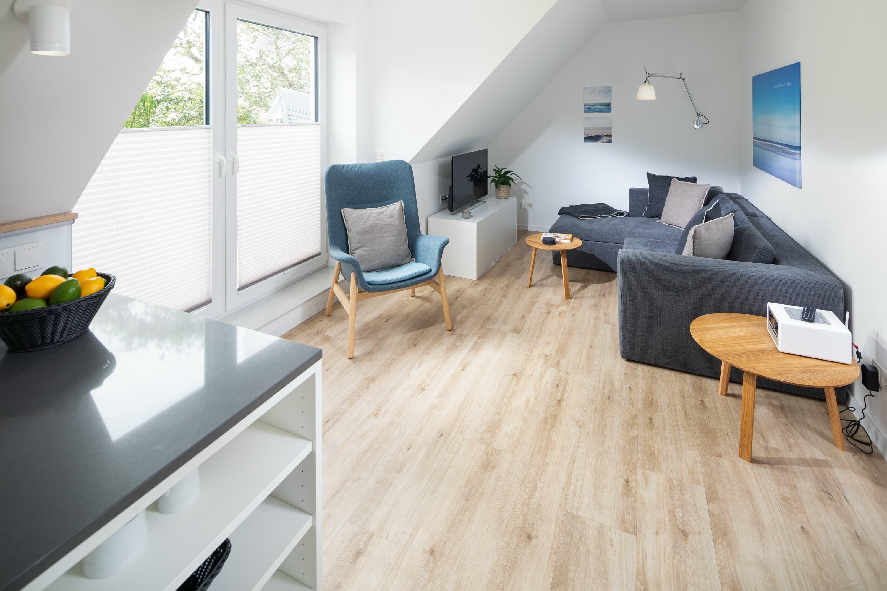 Die großzügige Maisonette-Wohnung im 1. Obergeschoss bietet auf zwei Ebenen ausreichend Platz für bis zu fünf Personen. Im unteren Bereich erwartet Sie ein elegantes Schlafzimmer mit gemütlichem Boxspringbett, ein modernes Duschbad sowie ein separates WC. Der offen gestaltete Wohnbereich begeistert mit einer hochwertigen Küche, einem Esstisch mit einladender Eckbank und einer bequemen Sofaecke – perfekt für entspannte Abende. Für den perfekten Soundtrack im Urlaub sorgt die exklusive Sonoro-Hifianlage. Eine Waschmaschinen-Trockner-Kombination steht Ihnen selbstverständlich zur alleinigen Nutzung zur Verfügung.