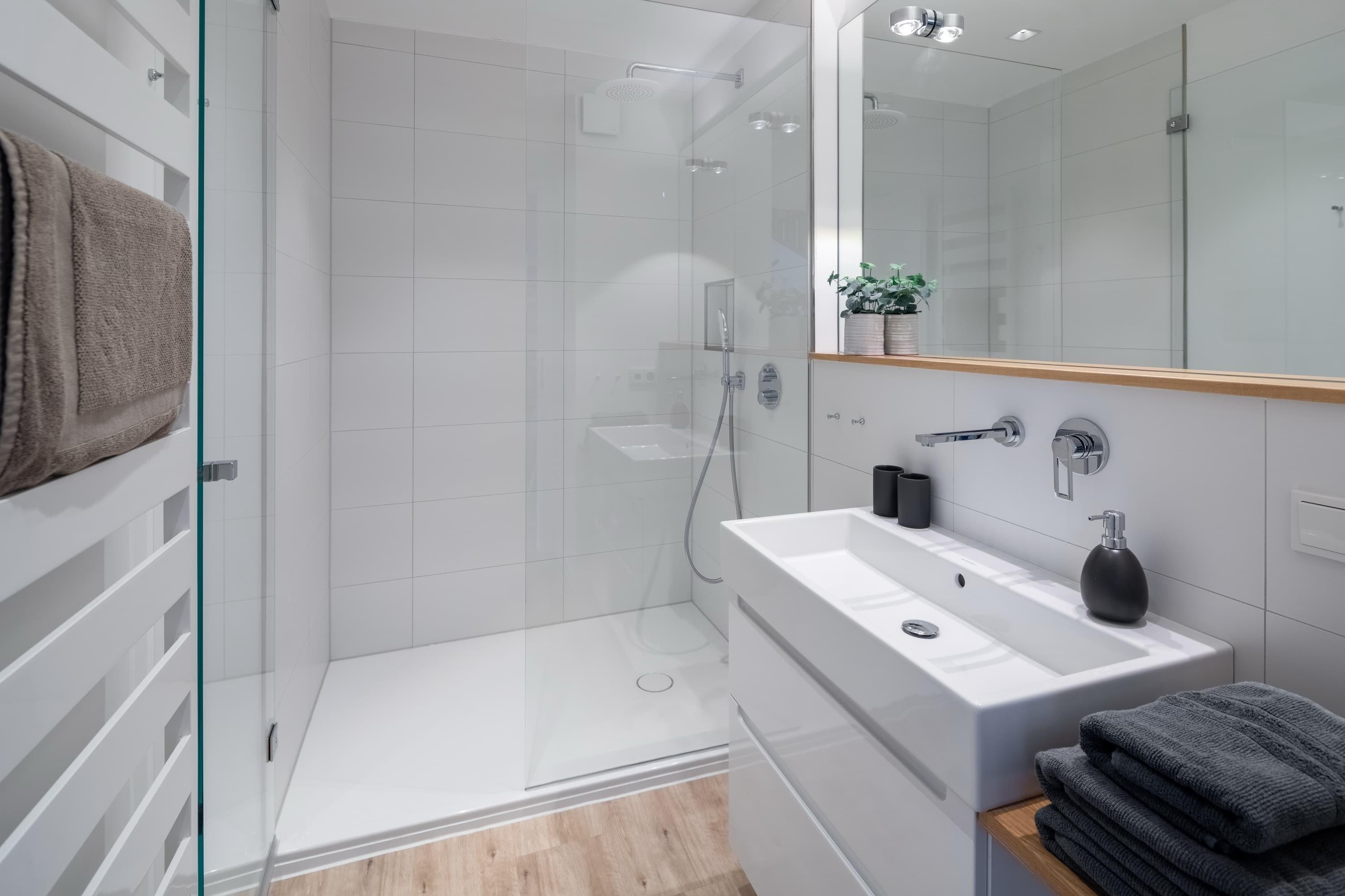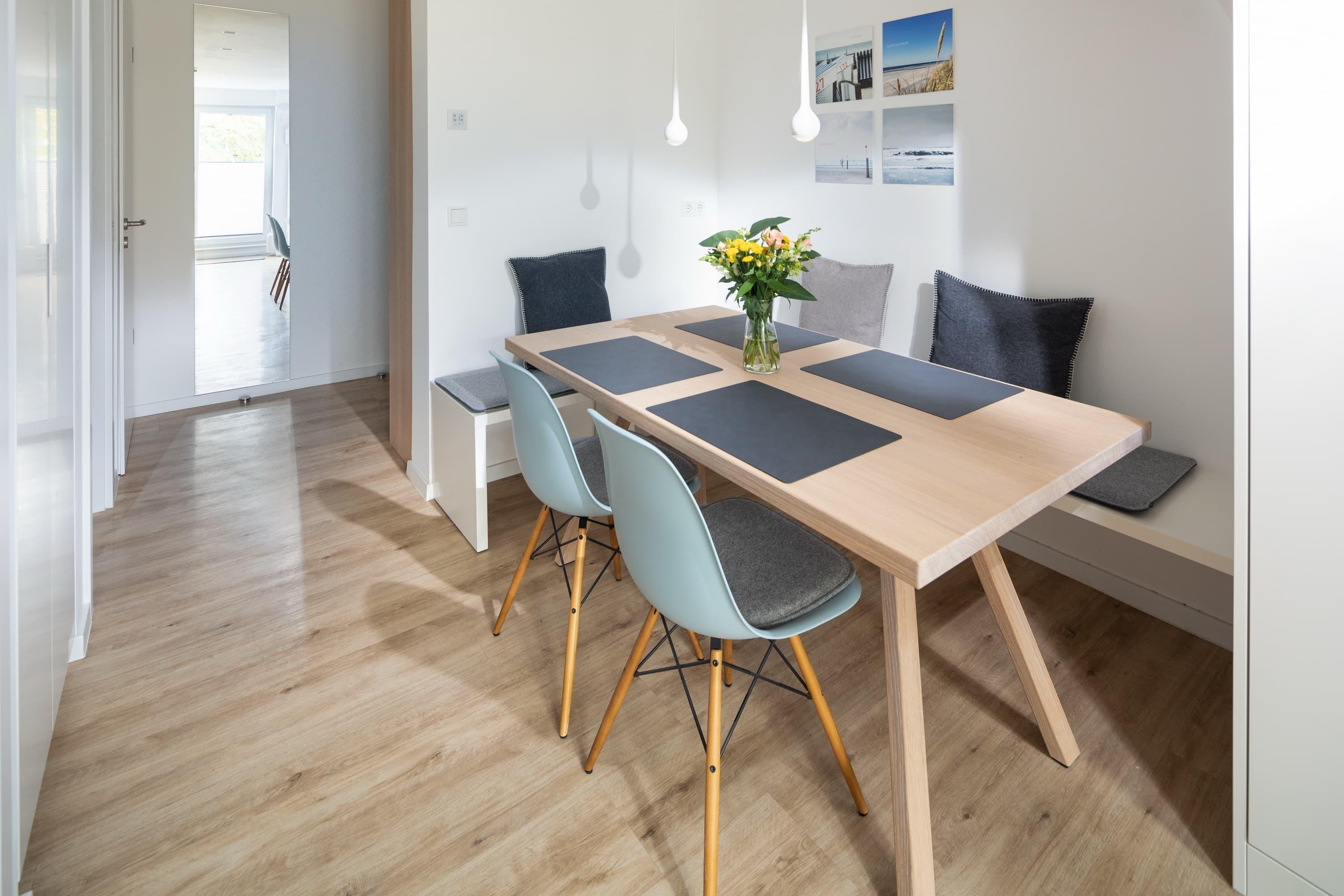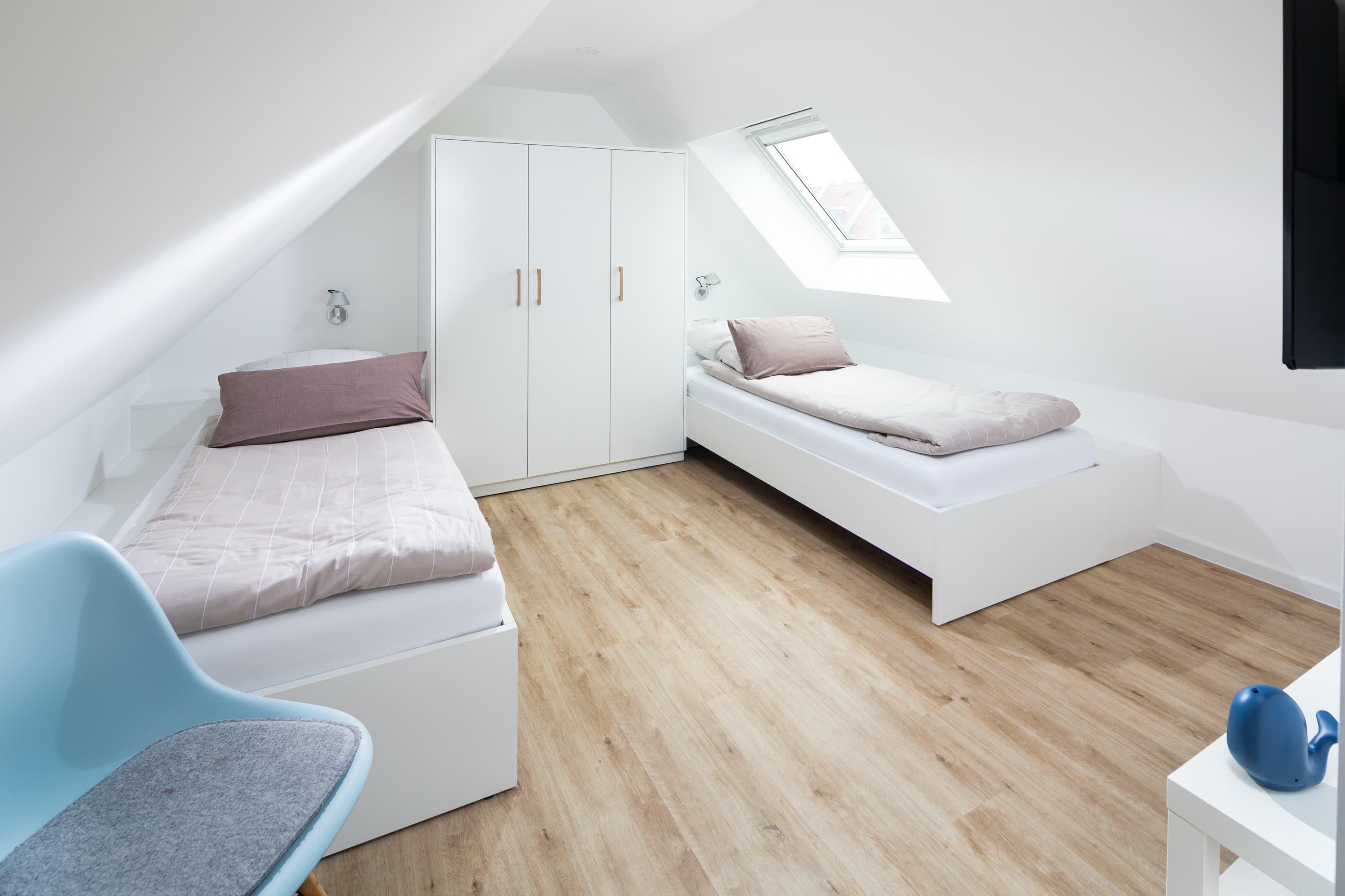 Die großzügige Maisonette-Wohnung im 1. Obergeschoss bietet auf zwei Ebenen ausreichend Platz für bis zu fünf Personen. Im unteren Bereich erwartet Sie ein elegantes Schlafzimmer mit gemütlichem Boxspringbett, ein modernes Duschbad sowie ein separates WC. Der offen gestaltete Wohnbereich begeistert mit einer hochwertigen Küche, einem Esstisch mit einladender Eckbank und einer bequemen Sofaecke – perfekt für entspannte Abende. Für den perfekten Soundtrack im Urlaub sorgt die exklusive Sonoro-Hifianlage. Eine Waschmaschinen-Trockner-Kombination steht Ihnen selbstverständlich zur alleinigen Nutzung zur Verfügung.