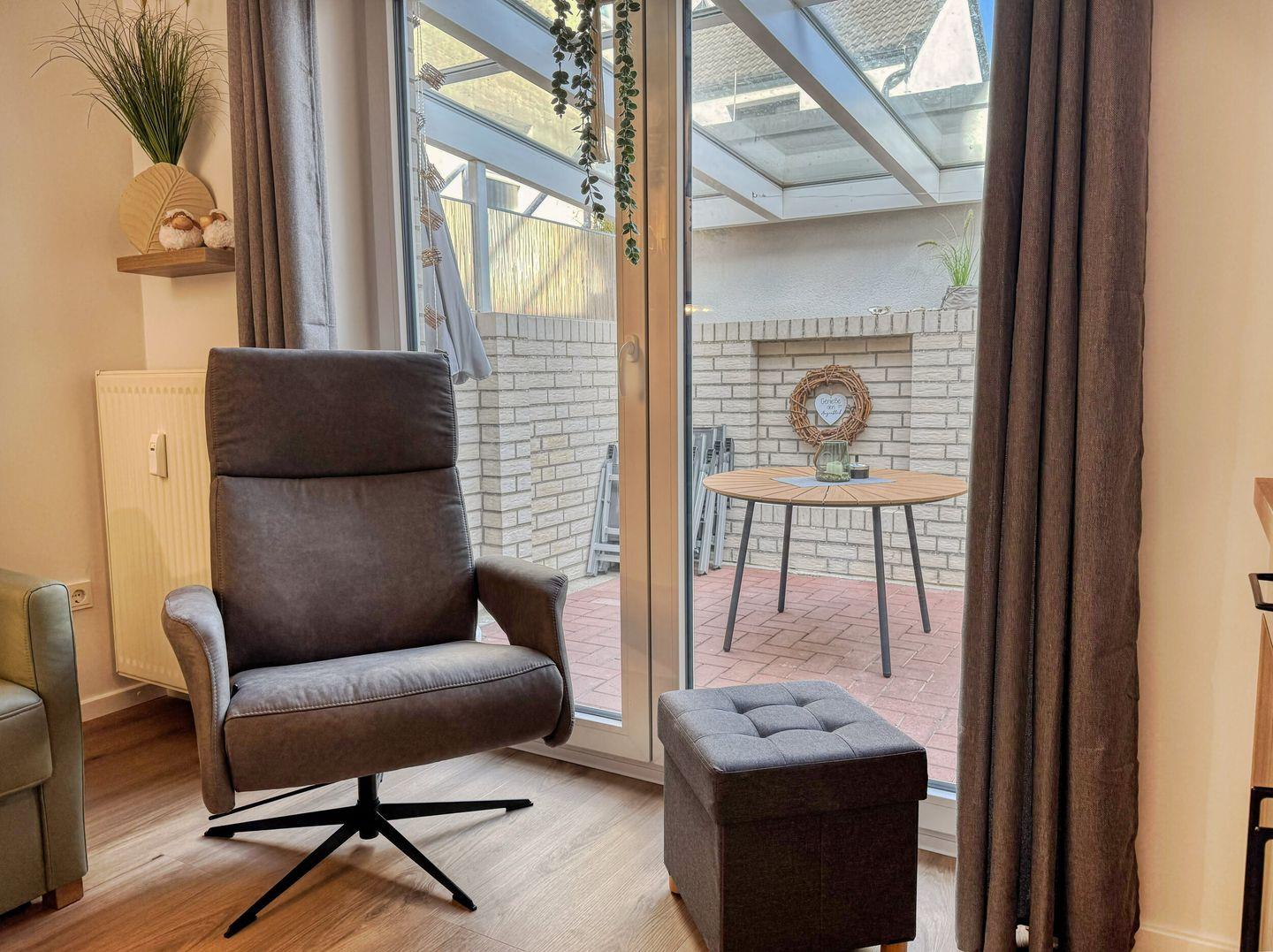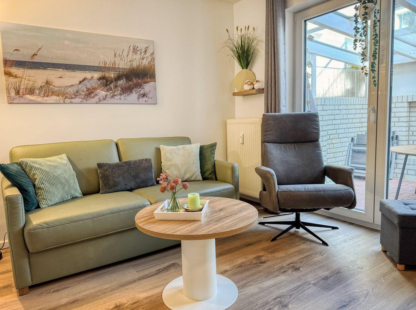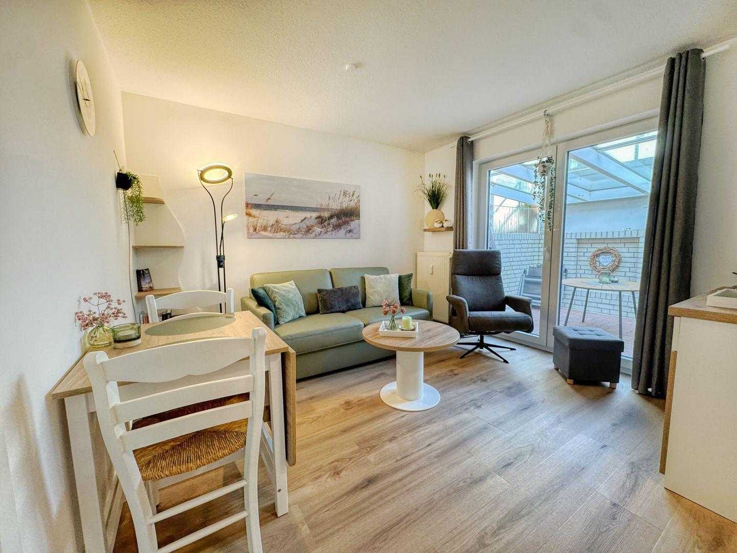 der separate Eingang hinter dem Haus führt über die überdachte Terrasse. Im Wohnbereich befinden sich Pantryküche sowie Sofa und Essecke für zwei Personen. Das Bad hat Dusche/WC. Separates Schlafzimmer mit zwei Einzelbetten(90x200). Kein Wlan. Bäcker, Lebensmittelgeschäfte in der Strandstraße und die Strandpromenade sind um zwei Straßenecken fußläufig zu erreichen.