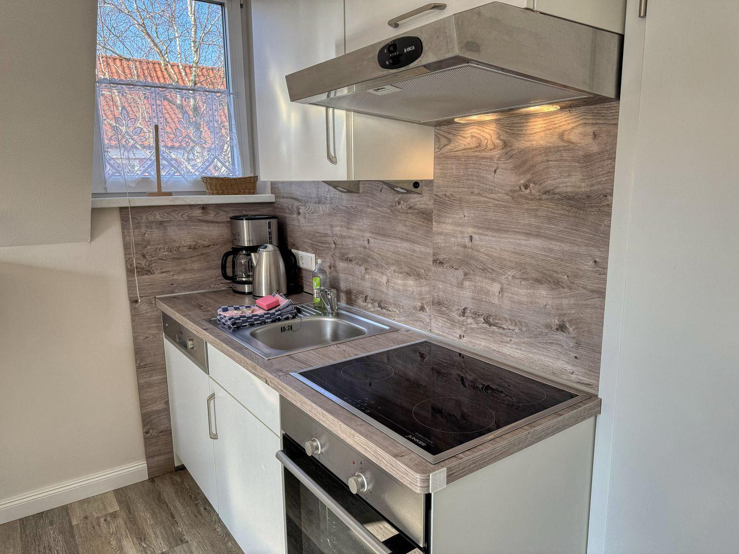 die Ferienwohnung im 1. OG verfügt über ein separates Schlafzimmer mit Doppelbett, Wohnraum mit vollausgestatteter Küchenzeile und Essecke sowie über ein Tageslichtbad mit Dusche/WC. Der wohnungseigene Parkplatz ist in Hausnähe im Kiefernweg. Im Haus befinden sich 2 Ferienwohnungen, Lebensmittelgeschäfte mit Bäcker in 350m Entfernung.