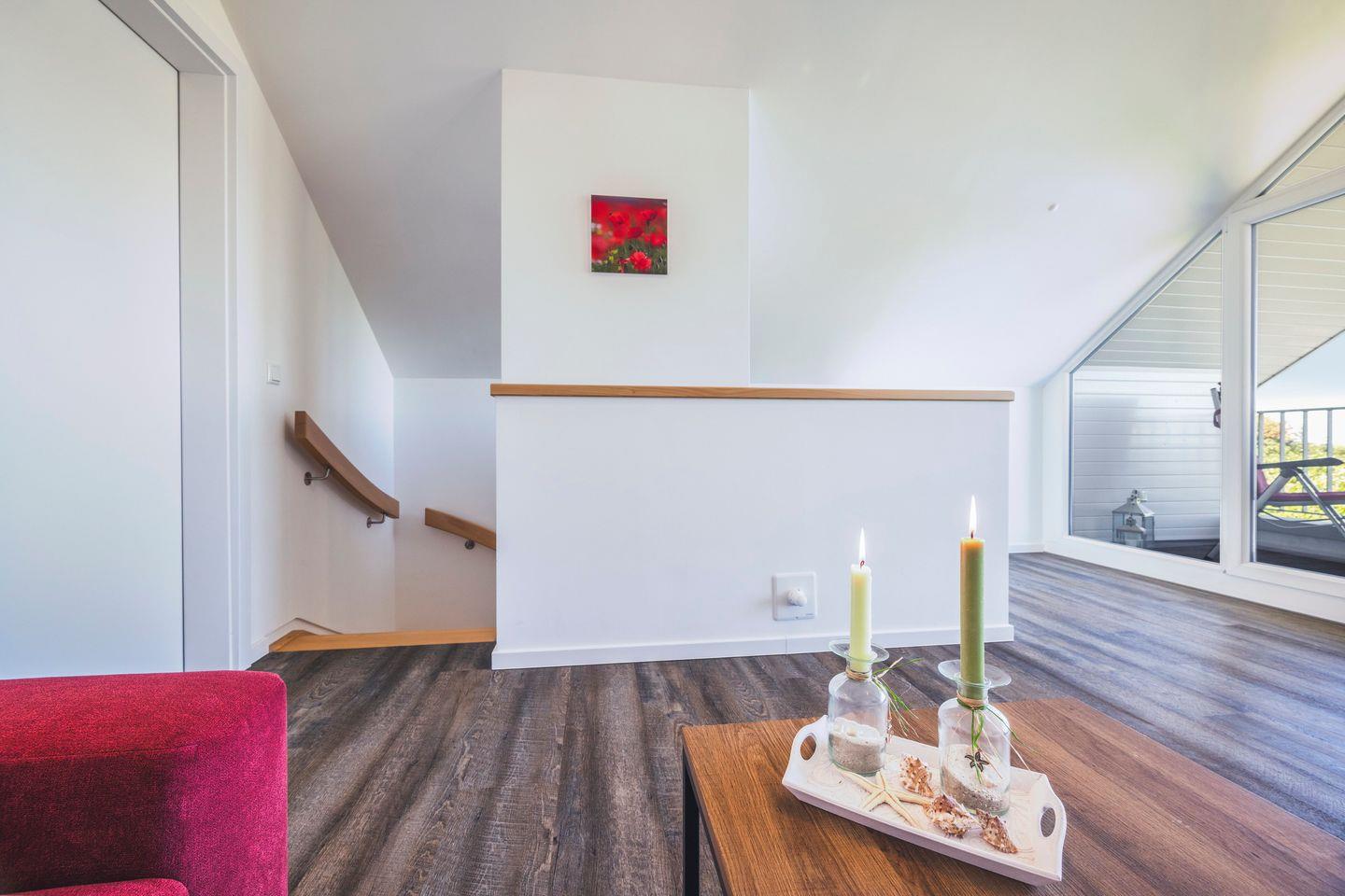 Das Dachgeschoss schließlich bietet ein weiteres Wohnzimmer mit Galerie und Zugang zur Loggia, von der man einen beeindruckenden Blick über das Wattenmeer genießen kann. Eine gemütliche Sofaecke, eine Relax-Liege sowie ein Fernseher laden hier zum Entspannen ein. Direkt angrenzend befindet sich der dritte Schlafraum mit Doppelbett.