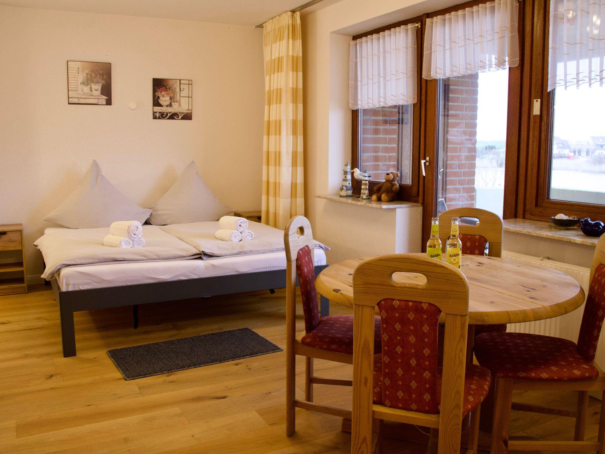 Das frisch renovierte Ein-Zimmer-Appartement Captn Cook 2 bietet eine ruhige und entspannte Wohnatmosphäre und eignet sich ideal für erholsame Tage zu zweit auf Nordstrand. Der Blick auf den angrenzenden Angelsee sowie den Deich unterstreicht die besondere Lage und sorgt für ein Gefühl von Weite und Ruhe.