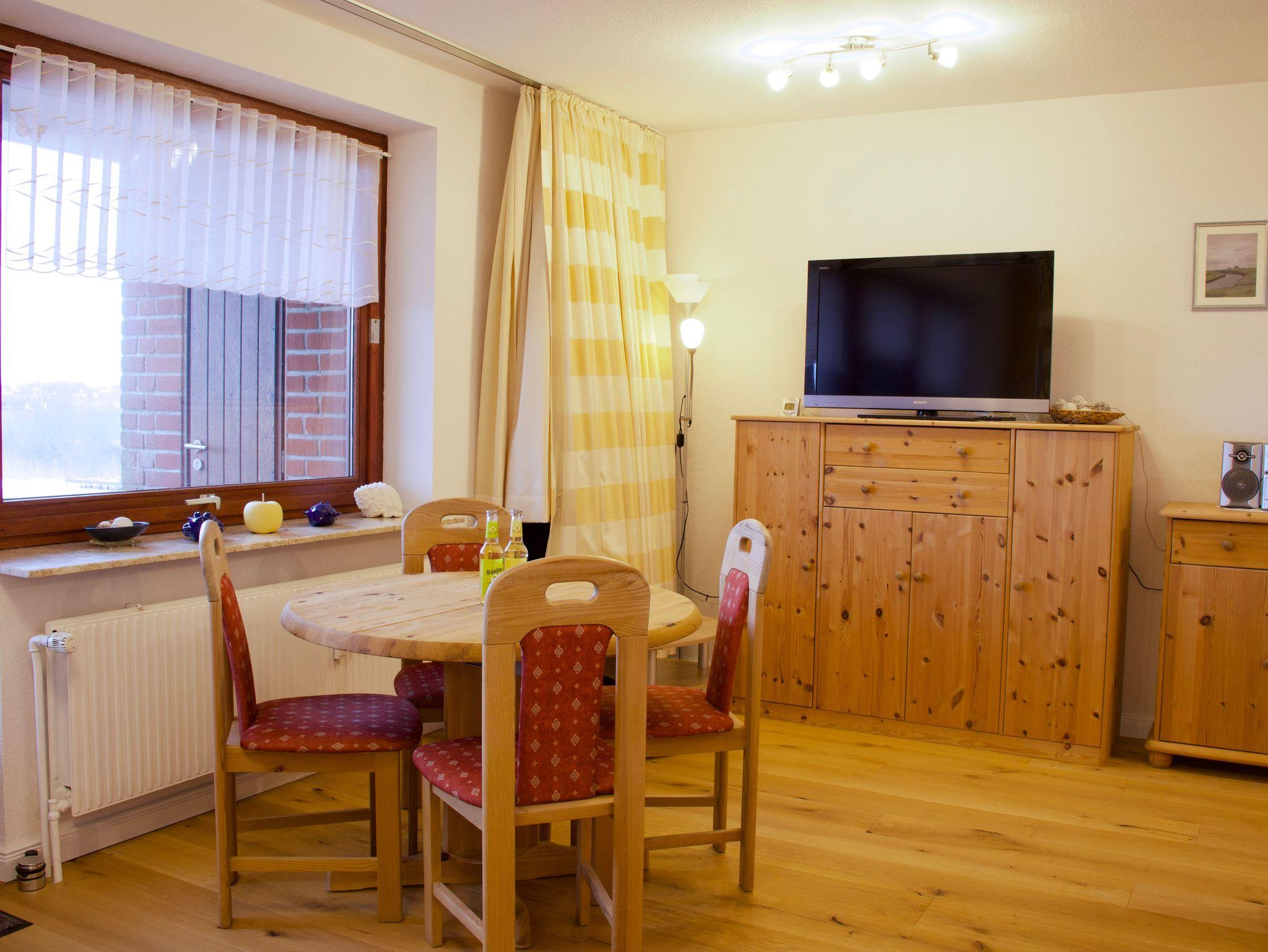 Vom Wohnbereich aus gelangen Sie direkt auf den möblierten Balkon. Mit Sitzgelegenheit und Tisch lädt er dazu ein, den Tag bei einem gemeinsamen Essen ausklingen zu lassen und dabei den Blick über den Deich, den See und die ruhige Landschaft Nordstrands zu genießen.