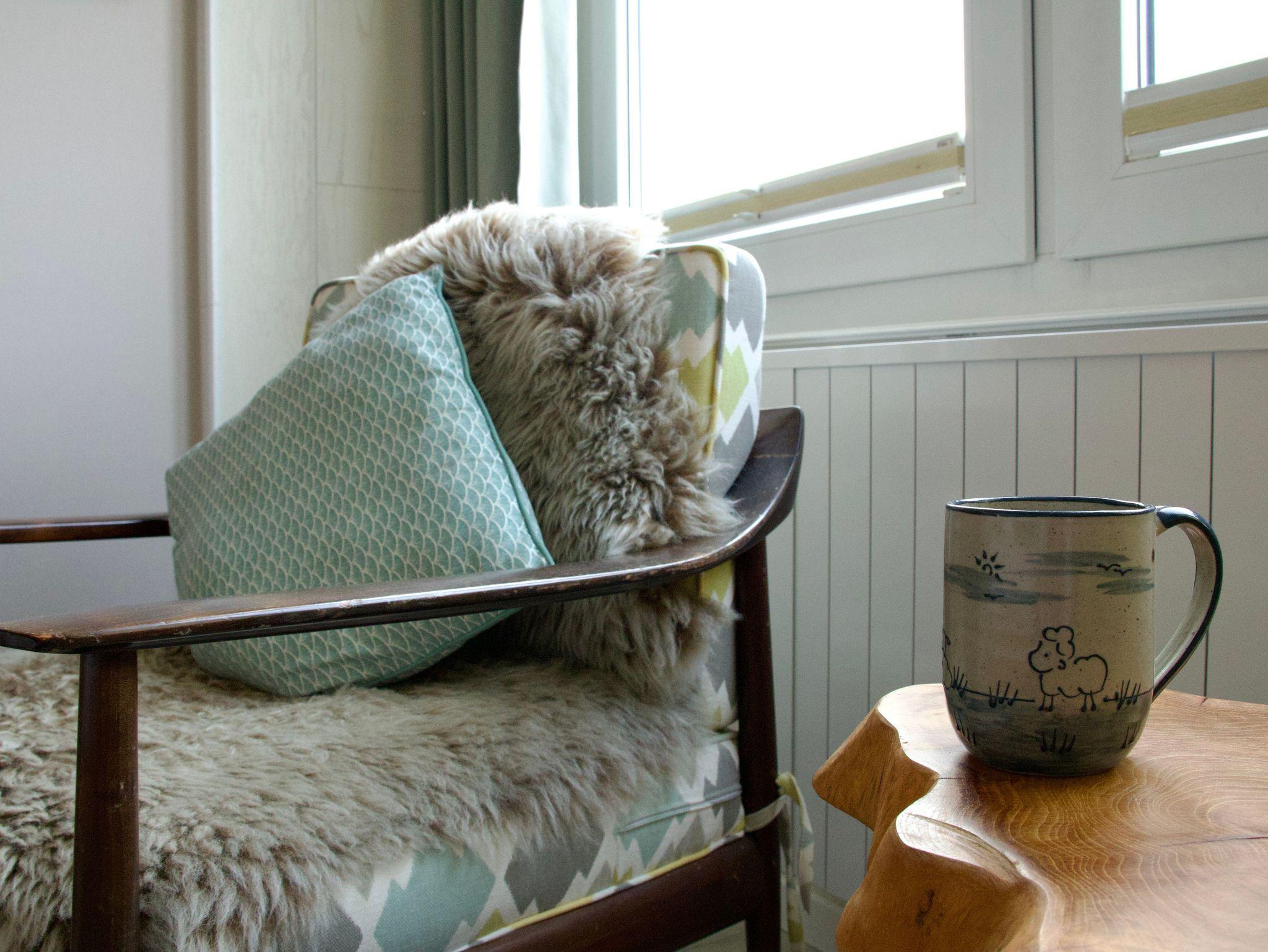 Die helle und freundlich gestaltete Wohnung wirkt offen und entspannt und fügt sich harmonisch in die Umgebung der nordfriesischen Küstenlandschaft ein. Große Fenster lassen viel Tageslicht in die Räume und schaffen ein angenehmes Wohngefühl.
