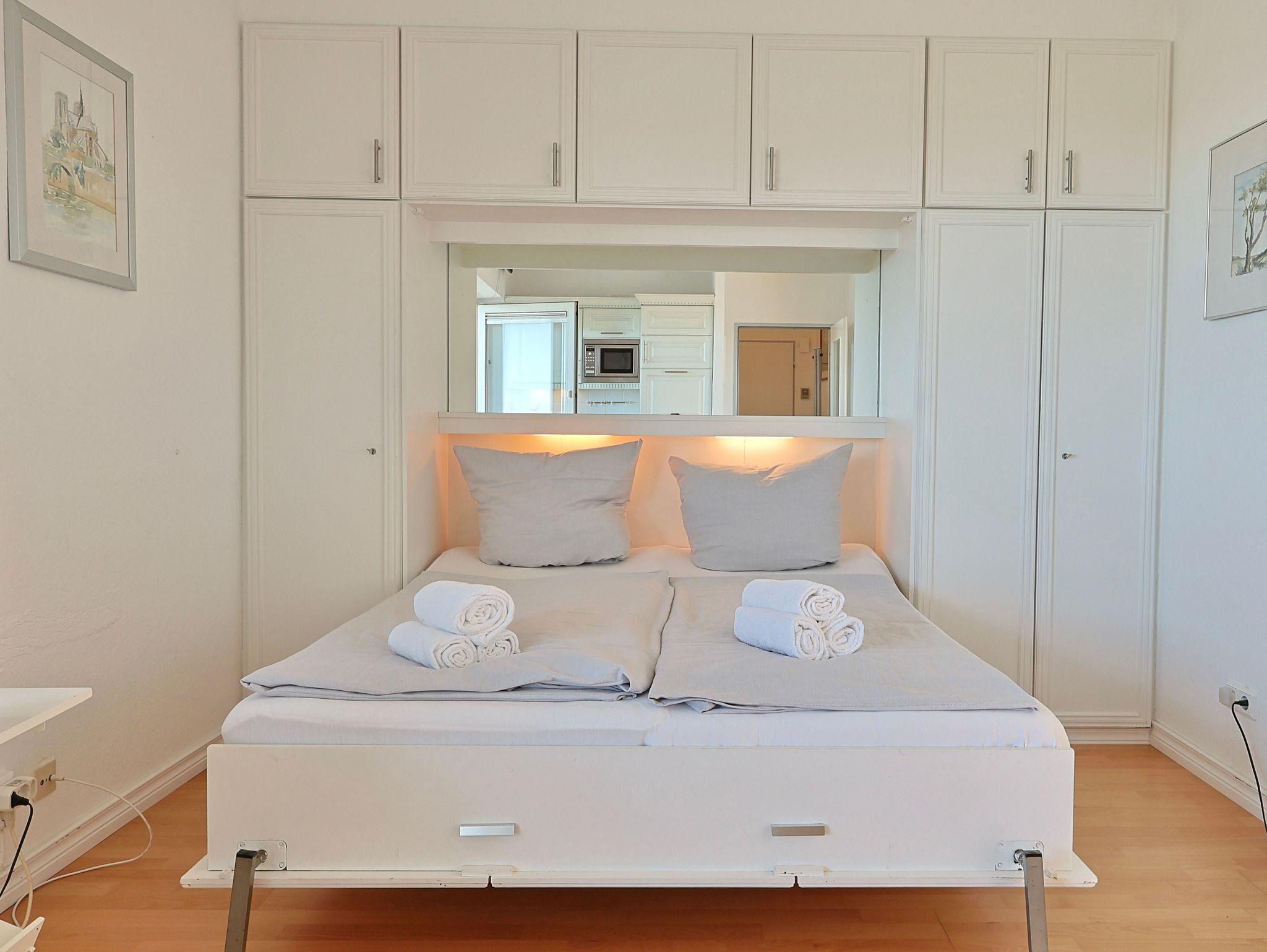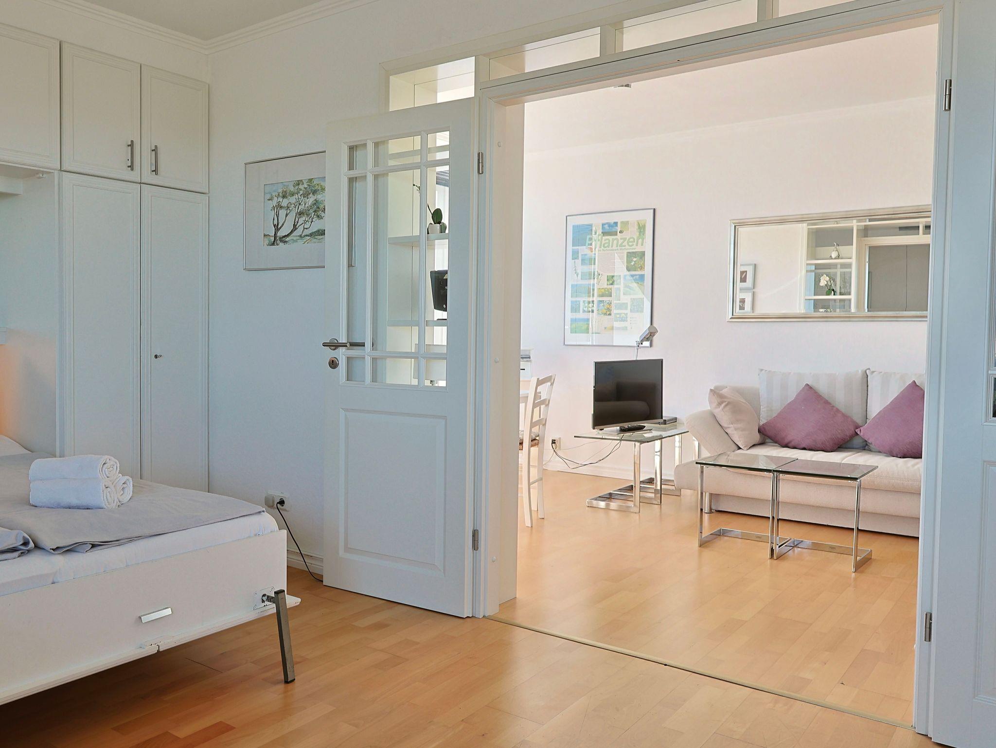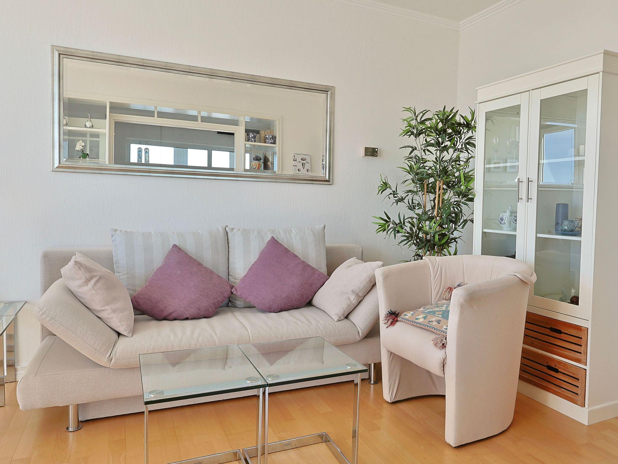 Schon beim Betreten fällt das helle, freundliche Raumgefühl auf. Große Panoramafenster lassen viel Tageslicht herein und geben den Blick frei über die Umgebung. Der Wohn- und Schlafraum ist modern, klar und bewusst zurückhaltend eingerichtet und schafft eine entspannte Atmosphäre. Ergänzt wird die Wohnung durch ein separates Wohnzimmer, das Raum für ruhige Stunden bietet. Ein Smart-TV sowie WLAN stehen hier zur Verfügung.