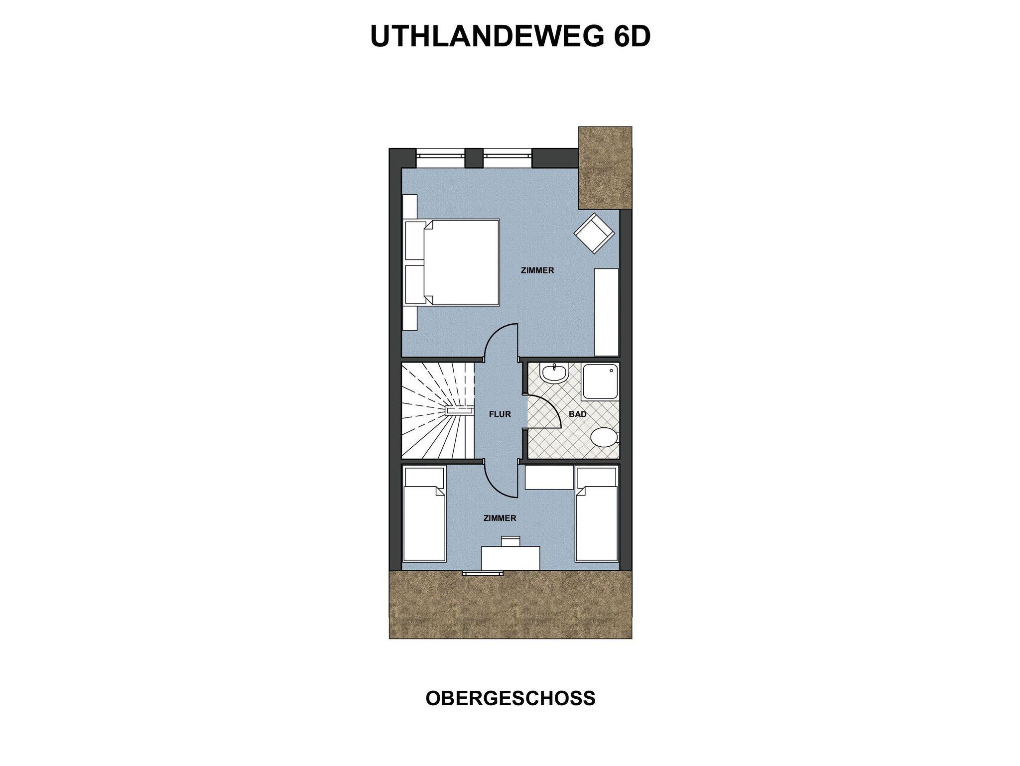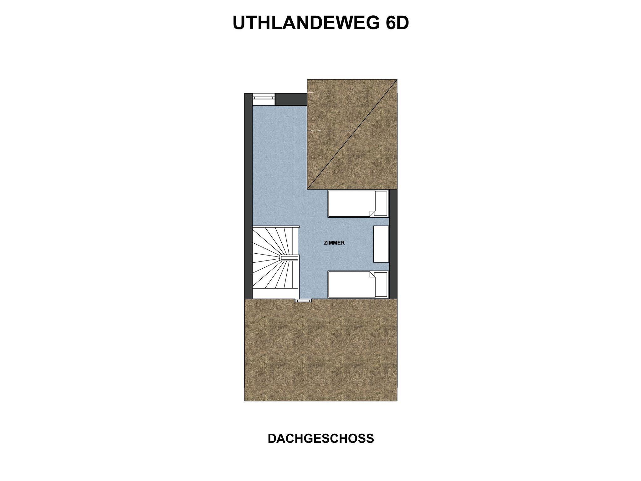 Im Obergeschoss befinden sich zwei gemütliche Schlafzimmer: eines mit Doppelbett und eines mit zwei Einzelbetten. Ebenfalls auf dieser Etage liegt das Badezimmer mit Dusche und WC. Ein weiteres Highlight ist das offene Giebelzimmer im Dachgeschoss, das als Galerie ausgebaut wurde und zwei weitere Einzelbetten bietet.