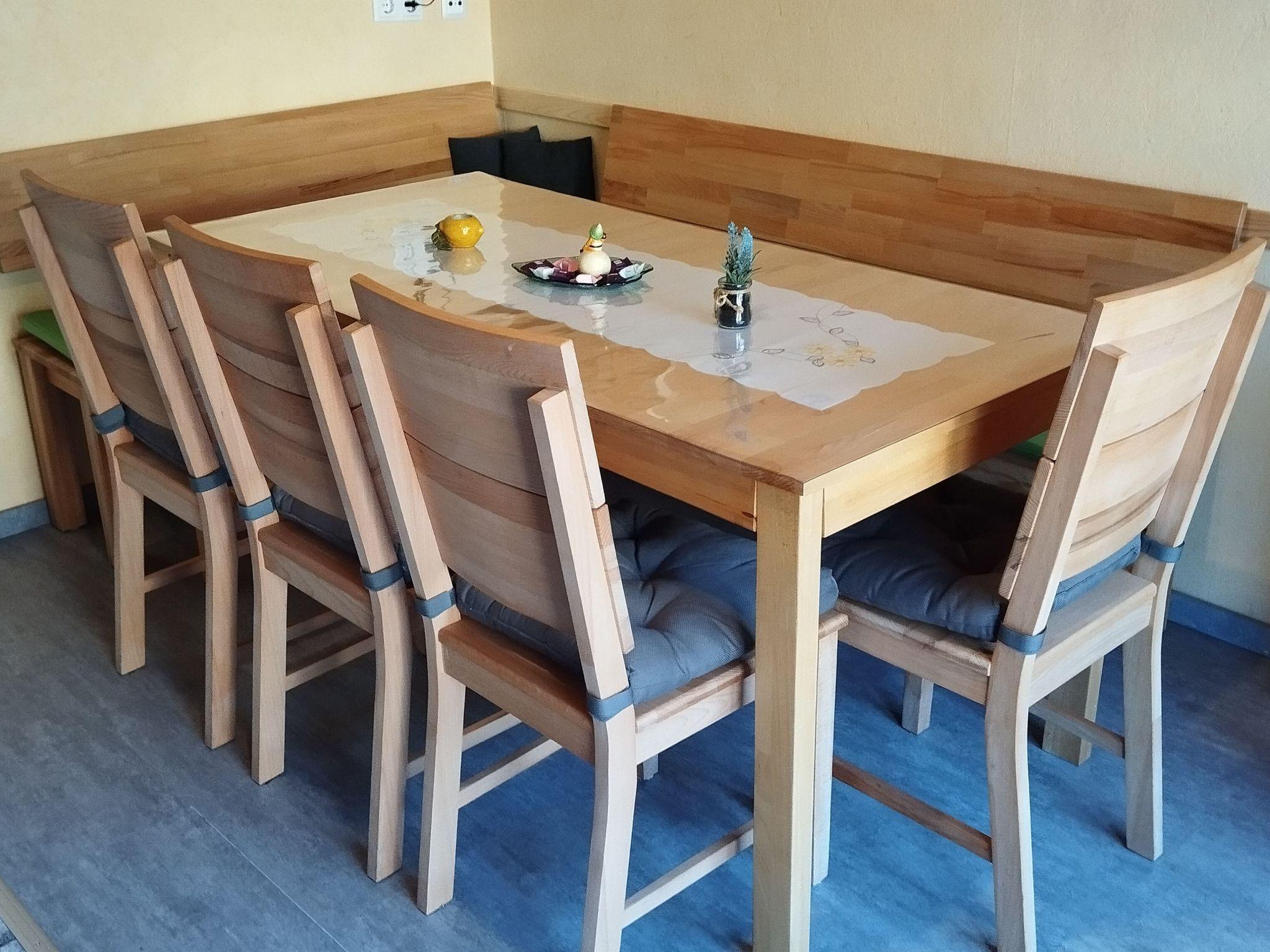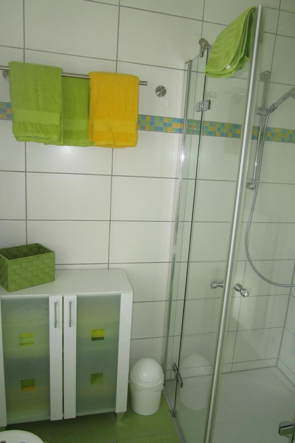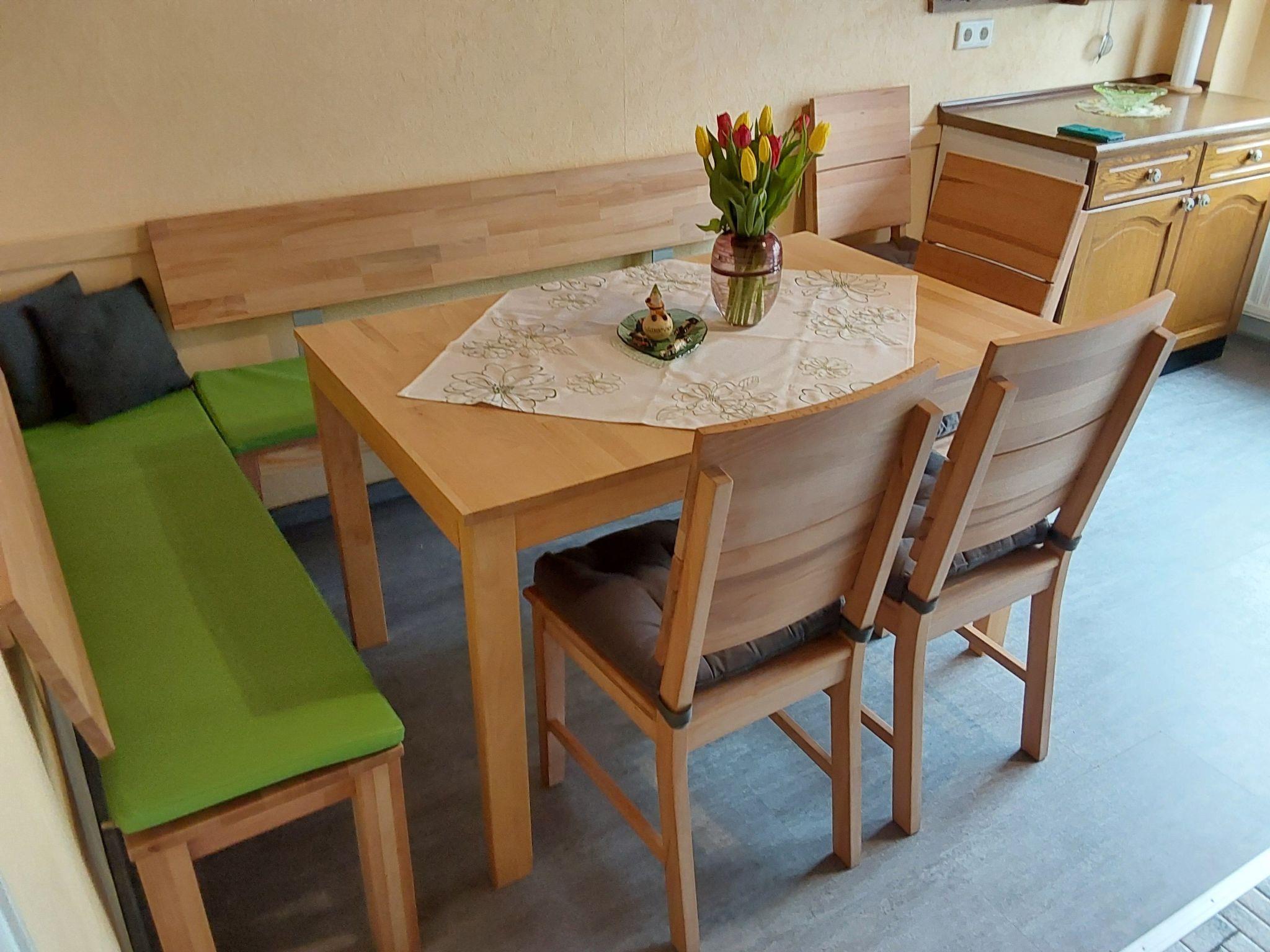 Bedroom 1 (red): Double bed with 2 bedside cabinets, 1 single bed with bedside cabinet, wardrobe with mirror, cosy seating area, wall-mounted wardrobe, TV. Bedroom 2 (purple): Double bed with bedside cabinets, wardrobe, frieze chest of drawers with mirror, cosy seating area, wall-mounted wardrobe, TV.Bedroom 3 (green): Futon bed (140x200) wardrobe with mirror, wall wardrobe, 1 small wall table with chair, 1 chair (valet stand),.Bedroom 4 (yellow): single bed with bedside cabinet, extra bed 1.80x80 possible, wardrobe, seating group with 2 chairs, wardrobe with mirror.Bathroom 1: urinal, 2 wall cupboards, 2 small cupboards, washbasin base cabinet, stool, hairdryer, bath and hand towels, cosmetic tissues, toilet paper. Bathroom 2: Vanity unit, mirror cabinet, stool, 2x hairdryer, bath towels, hand towels, toilet paper, cosmetic tissues. Kitchen: Fully equipped kitchen with crockery, cutlery, cooking pots, pans, fully automatic coffee machine, coffee machine, egg cooker, kettle, toaster, blender, electric knife, blender, can opener, cosy dining area with corner bench and chairs, kitchen buffet and kitchen unit. Dish towels, washing-up liquid, dishcloths, sponges, dishwasher tabs, bin liners and Zewa are provided. A small selection of spices such as salt, pepper, paprika, curry, sugar and tea is available.