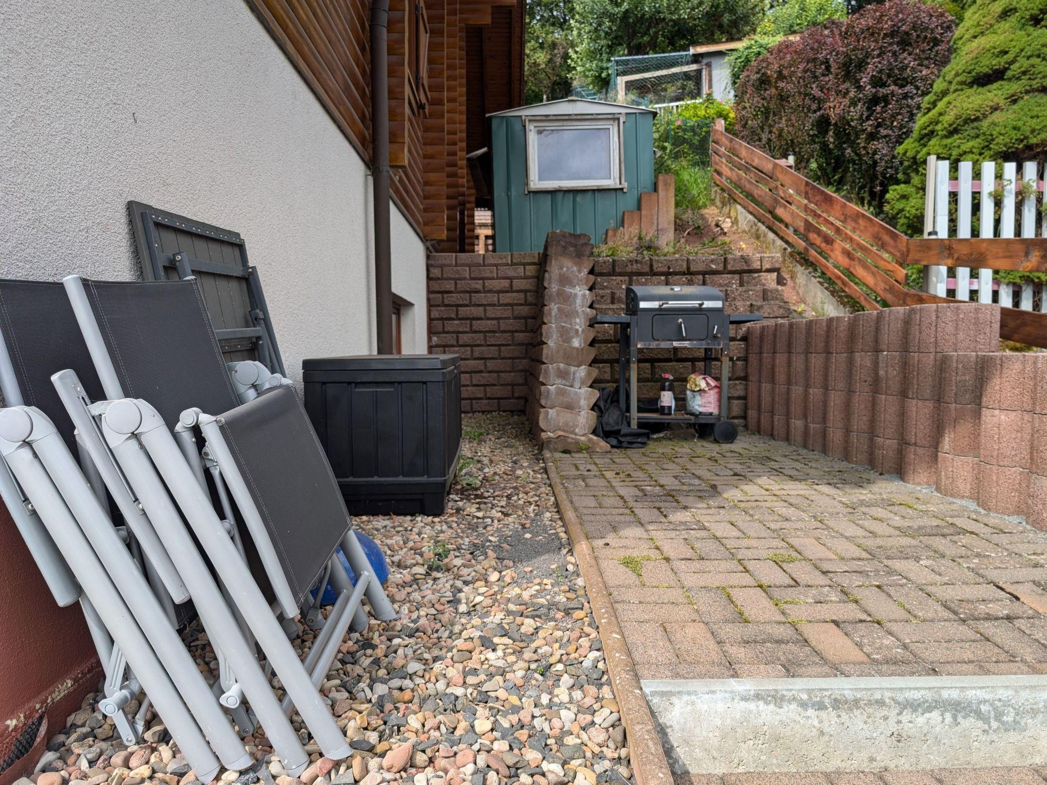 In the outdoor area to the right of the house, a terrace with seating area and barbecue was built for the holiday flat. The outdoor area does not have its own access but is accessible through the common front door.