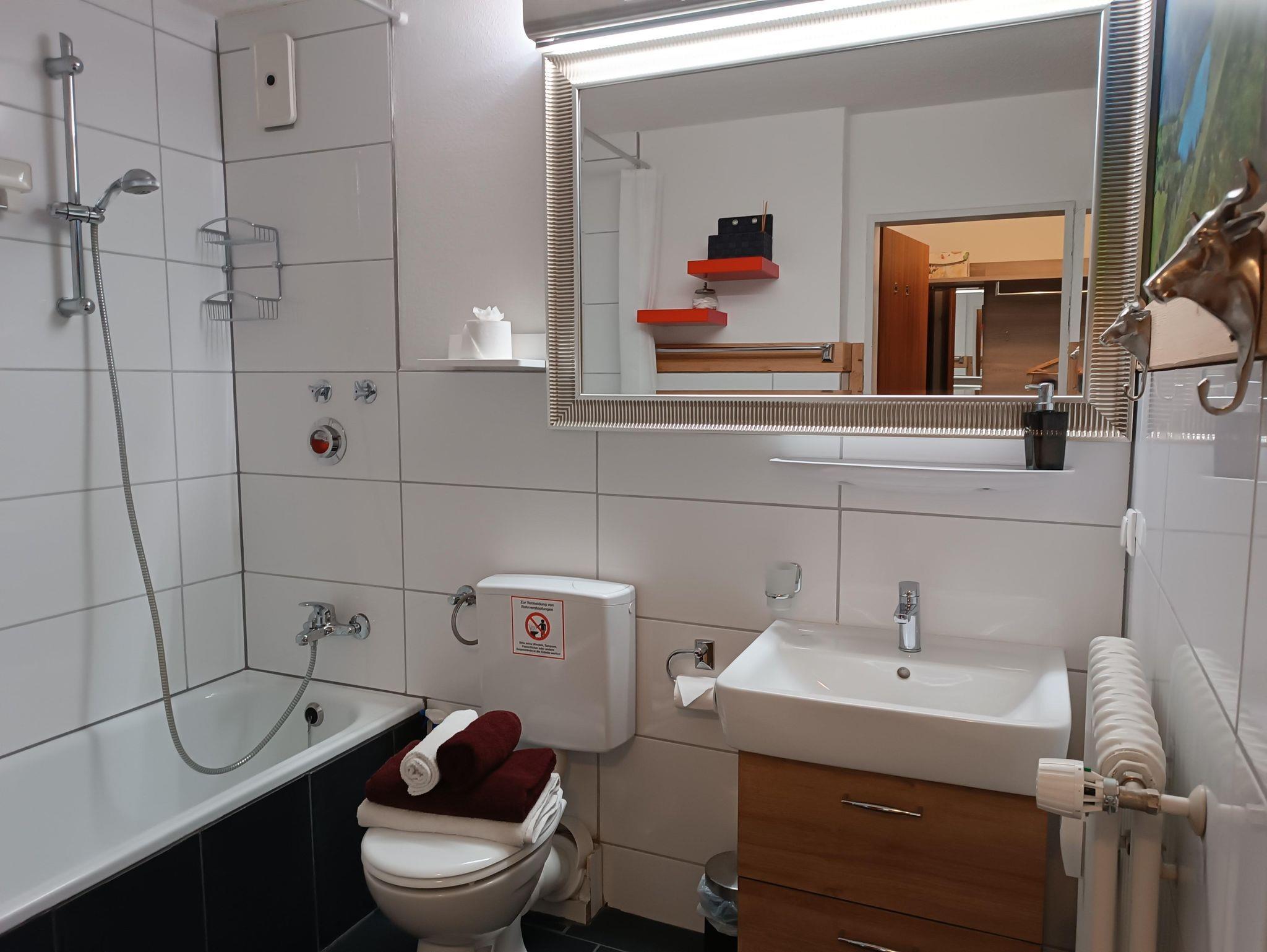 Sonnige 1-Raum Ferienwohnung im 1. OG, 48qm für 1-3 Personen, offene Küche, Bad mit Duschbadewanne, Südbalkon, kostenloser PKW-Stellplatz am Haus, Waschmaschine im Keller, Sauna, kostenloses Hallenbad, WLAN