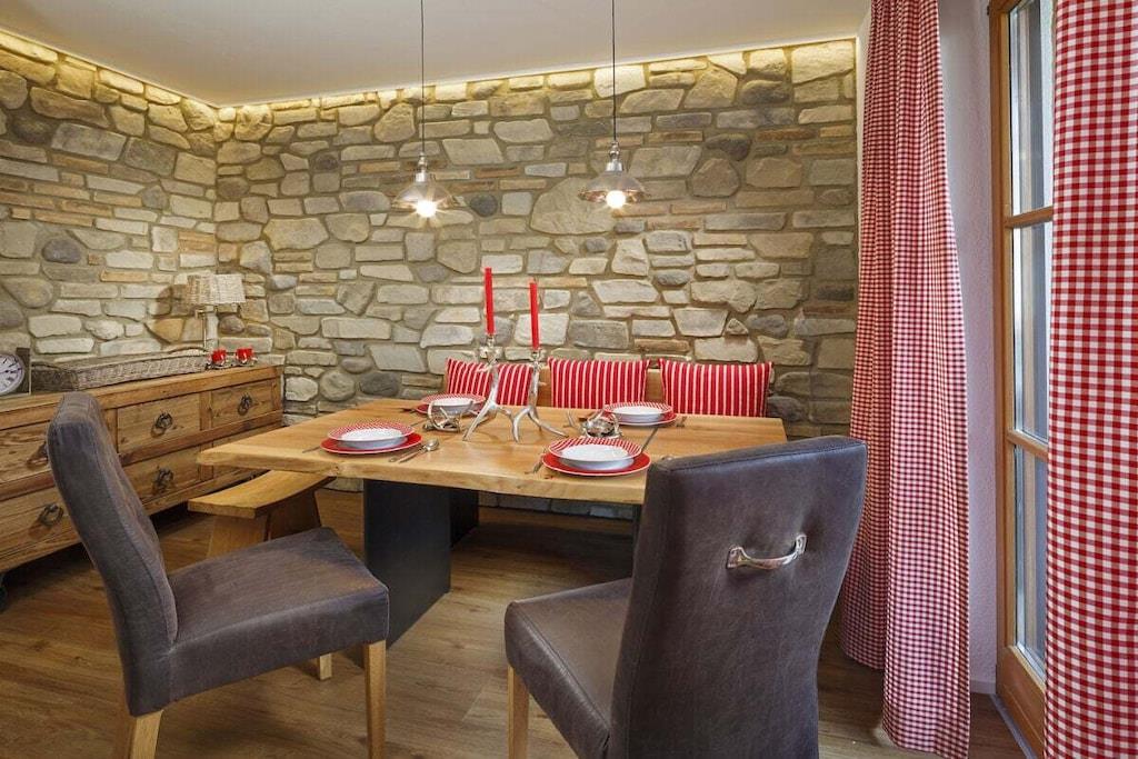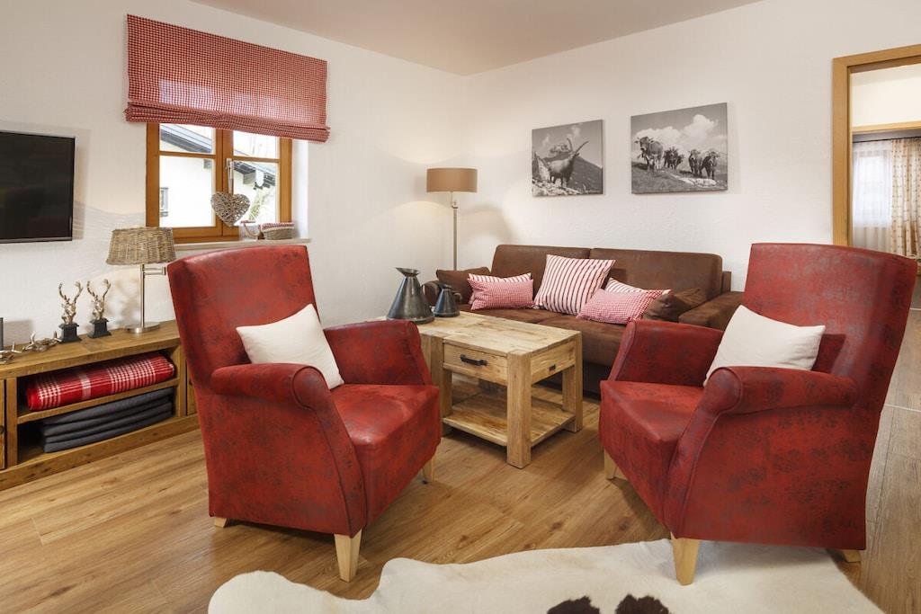 2-Zimmer-Ferienwohnung, ca. 62 m², 1.OG, hochwertig und exklusiv im modernen Alpenstil eingerichtet (vom DTV mit 4-Sternen klassifiziert). Die Ferienwohnung wird von Rottönen dominiert, die mit Stein und Holz eine heimelige Atmosphäre schaffen. Highlight des Wohnzimmers ist die originelle Steinwand. Behagliche Wohnecke mit hochwertiger Schlaf-Couch und 2 Sessel. Schlafzimmer mit Bettpaneel aus Eichenholz, gemütlicher Beleuchtung u. originell gestaltetem Kleiderschrank. Die moderne Landhaus-Küche ist voll ausgestattet mit Geschirrspülmaschine, Kühl-und Gefrierschrank,Backofen, Kaffee-u. Nespressomaschine. Exklusives Badezimmer mit Dusche, aus Naturstein. Großzügiger Balkon. Flachbildschirm mit Kabelanschluss, Apple-TV, kostenloser WLAN-Anschluss.