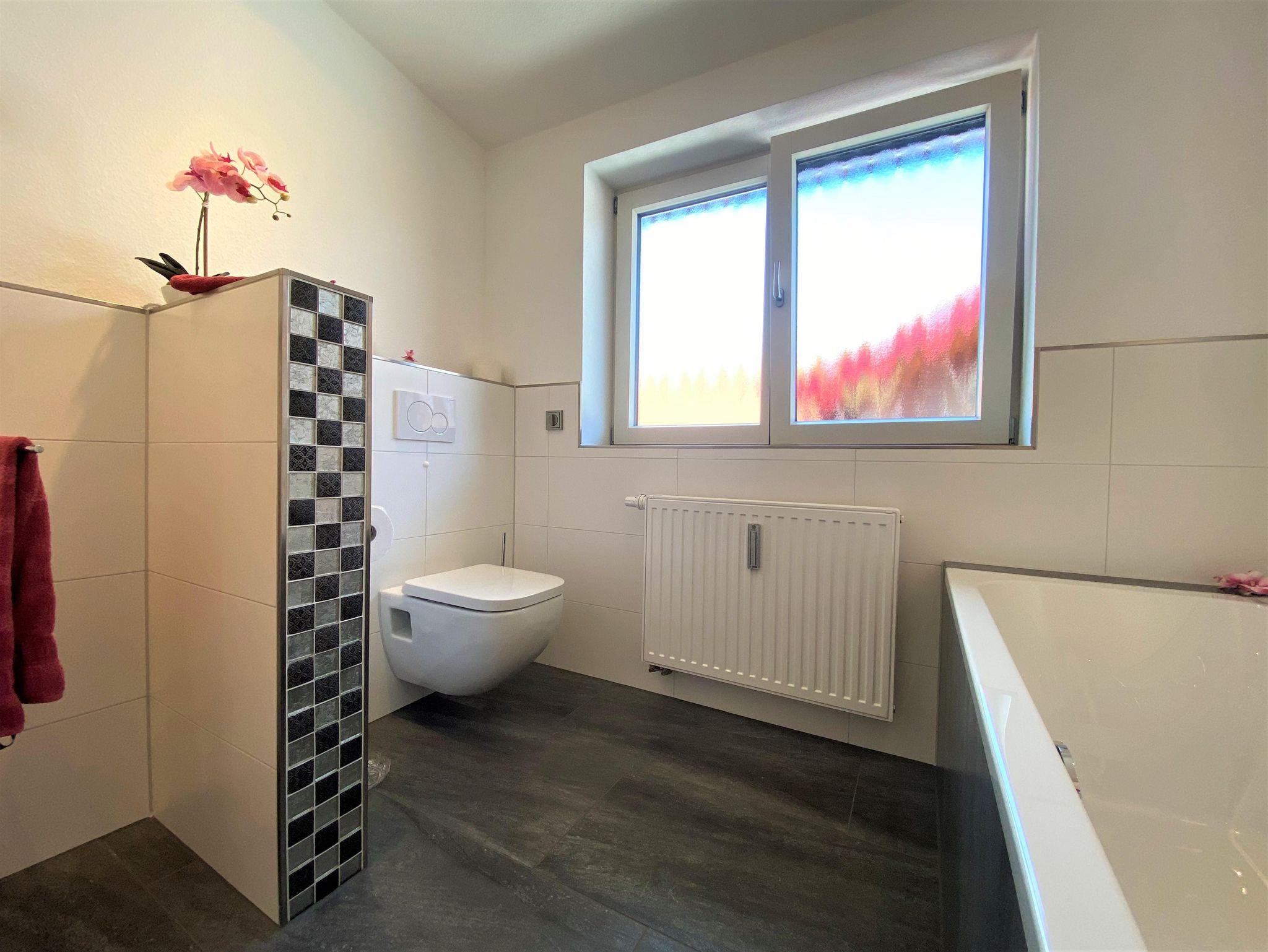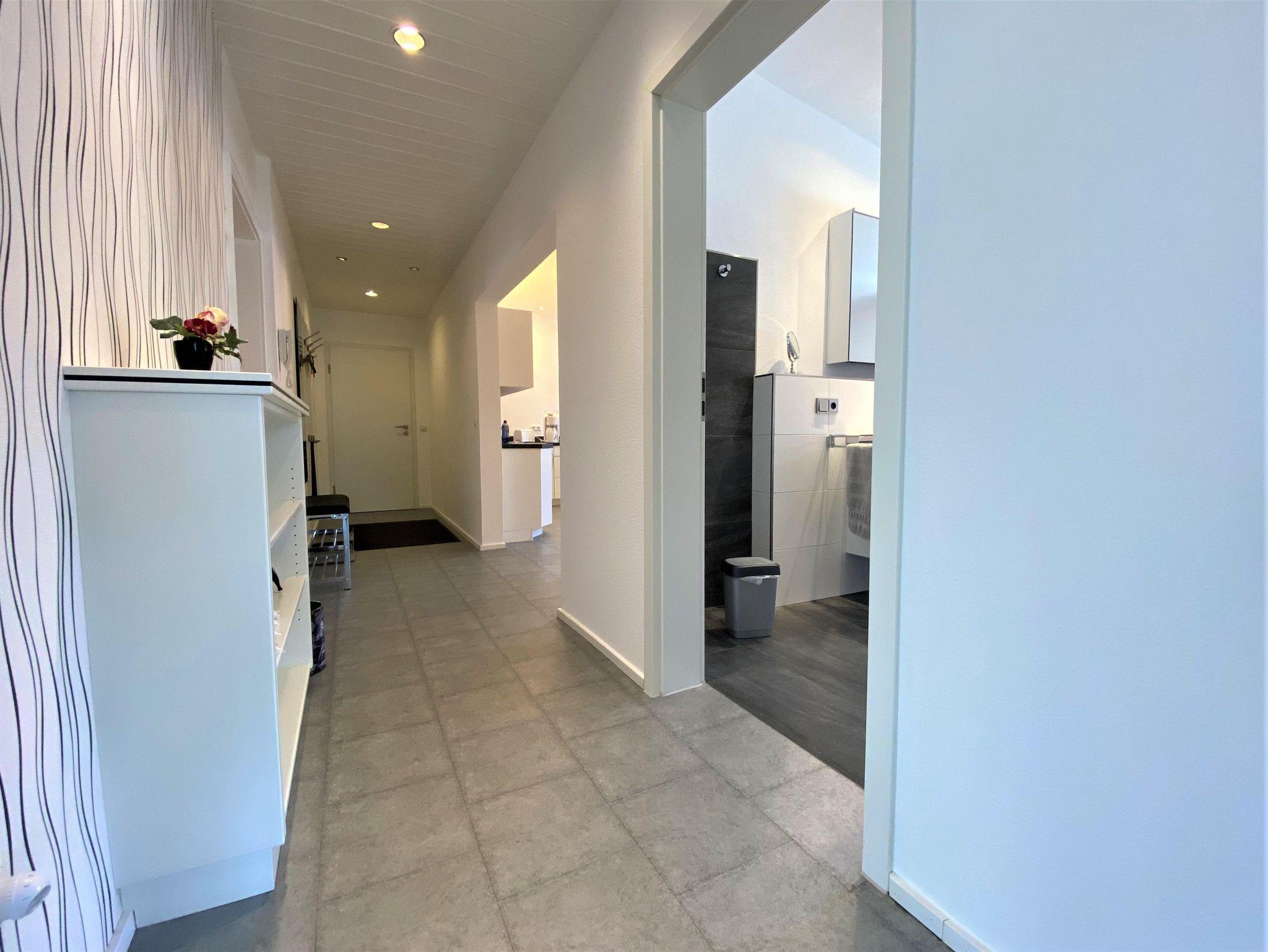 Bad mit großer flacher Duschwanne, Badewanne, Toilette, Waschtisch, Spiegelschrank, Ablage und Handtuchwärmer. Diele mit Garderobe und Schuhschrank.