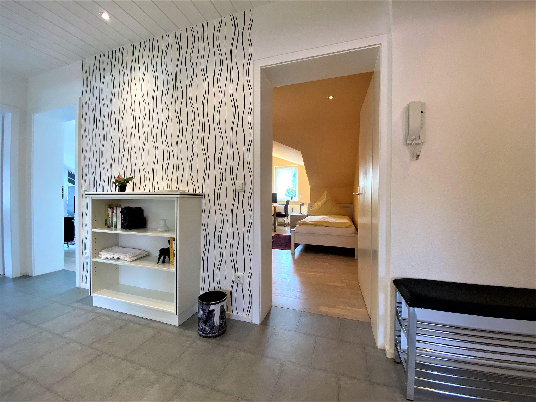 Schlafzimmer mit Parkettboden, Doppelbett 2x2 m und großem Kleiderschrank. Weiteres Zimmer mit Parkettboden, Schreibtisch, Einzelbett 2x1m und Kleiderschrank. Kabel-TV-Anschluß, Durchwahltelefon und LAN u.WLAN-Internetzugang.