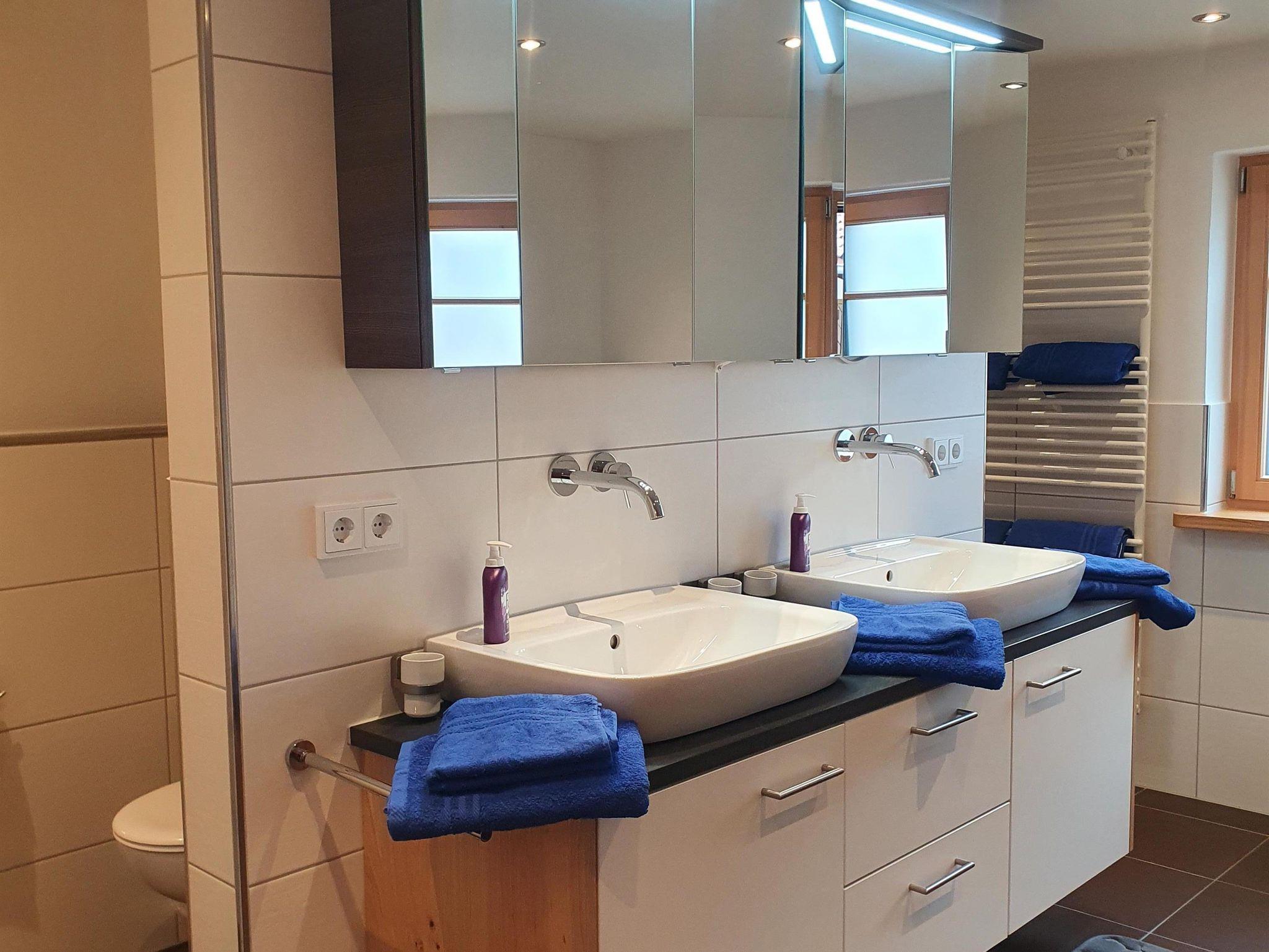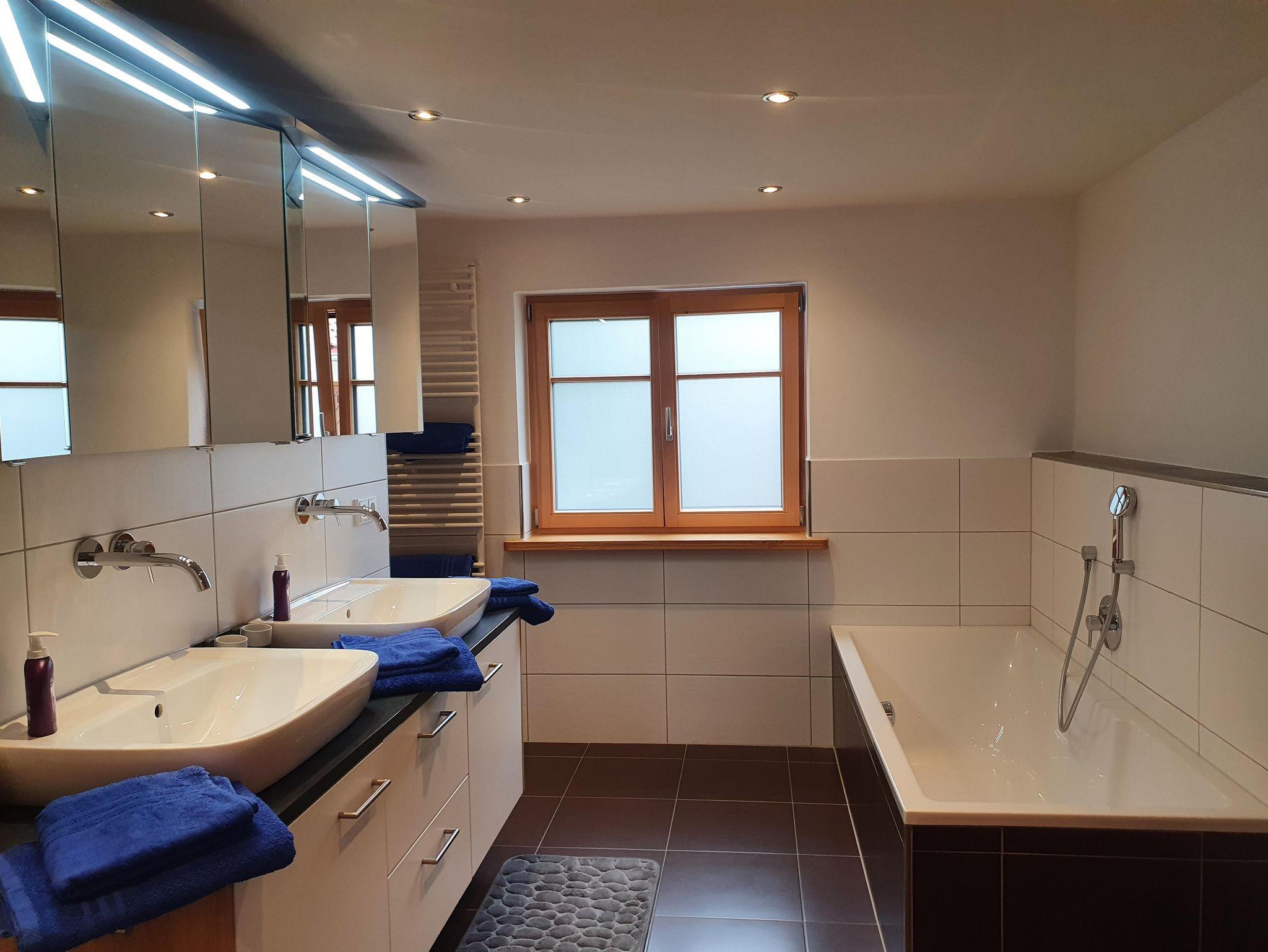 Das geräumige Tageslichtbad bietet Ihnen eine ebenerdige Dusche, eine Badewanne und eine Toilette. Die Ausstattung beinhaltet einen großen Spiegelschrank, 2 Waschbecken mit Unterschrank.
