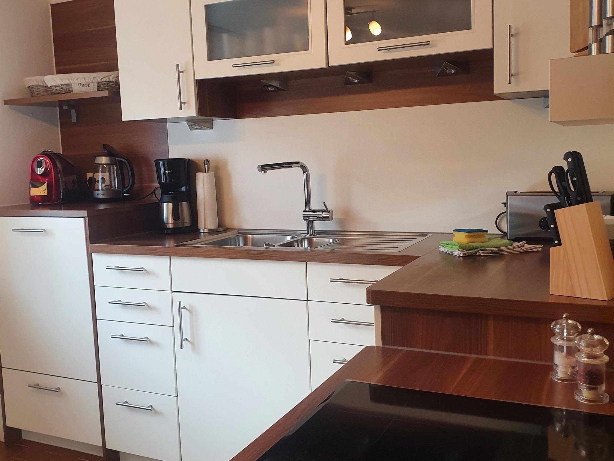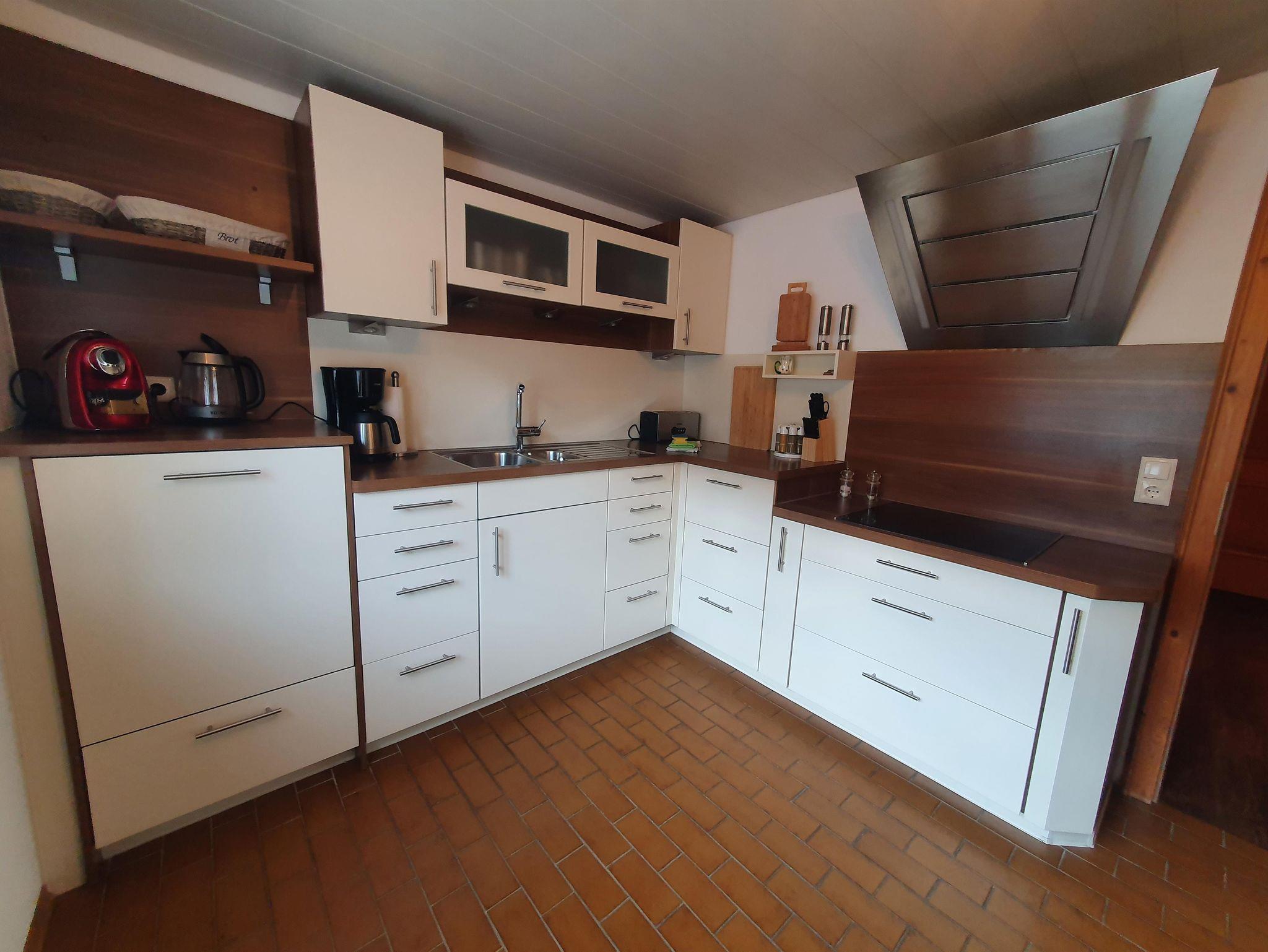 Die speziell angefertigte Küche ist mit moderner Technik, Cerankochfeld mit Dunstabzug, Backofen, Mikrowelle, Spülmaschine, großem Kühlschrank sowie vielen anderen Geräten-wie Kaffeemaschinen (Filter und Nespresso) u.s.w. ausgestattet.