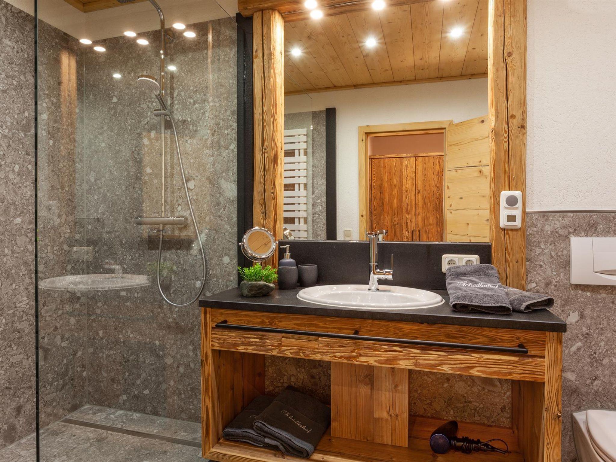 • Badezimmer mit Dusche und WC, Föhn, Schminkspiegel und Handtuchwärmer