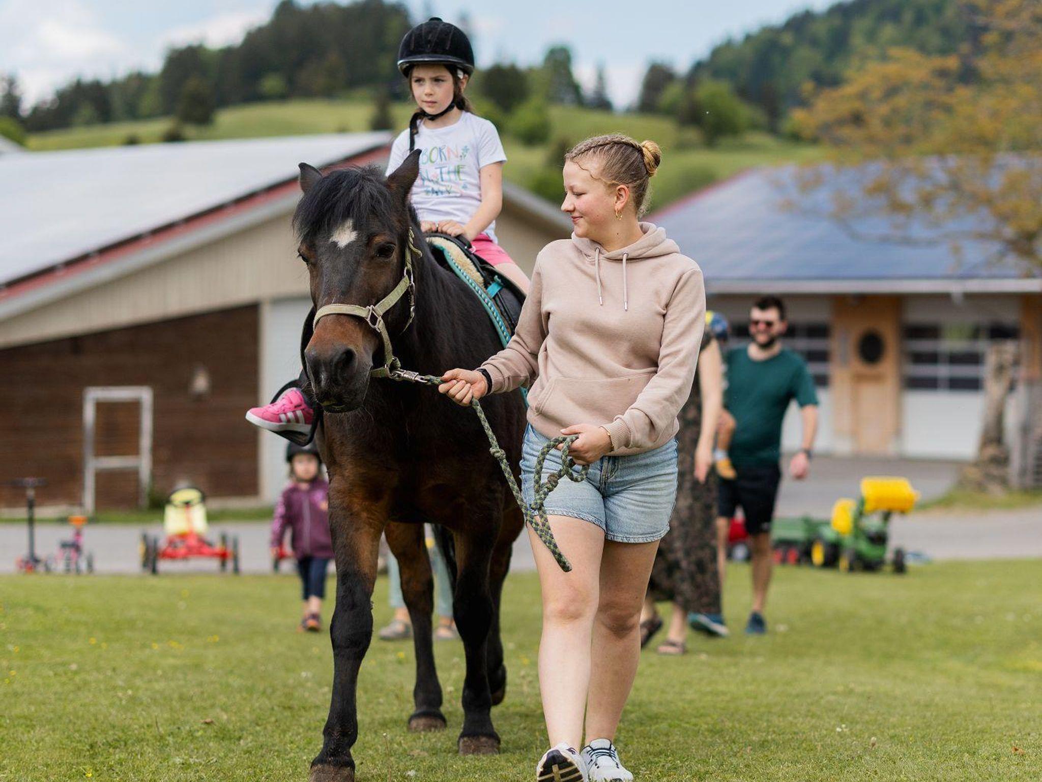 Hier dürfen Kinder noch richtig Kind sein: Ponyreiten, Pferde auf die Koppel bringen, Hasen füttern, mit Kater Fredi kuscheln. Spielplatz, Fahrzeuge, Klettergerüst und viele Tiere warten – und das Schönste ist die gemeinsame Zeit. Jeder Tag wird zum kleinen Abenteuer.