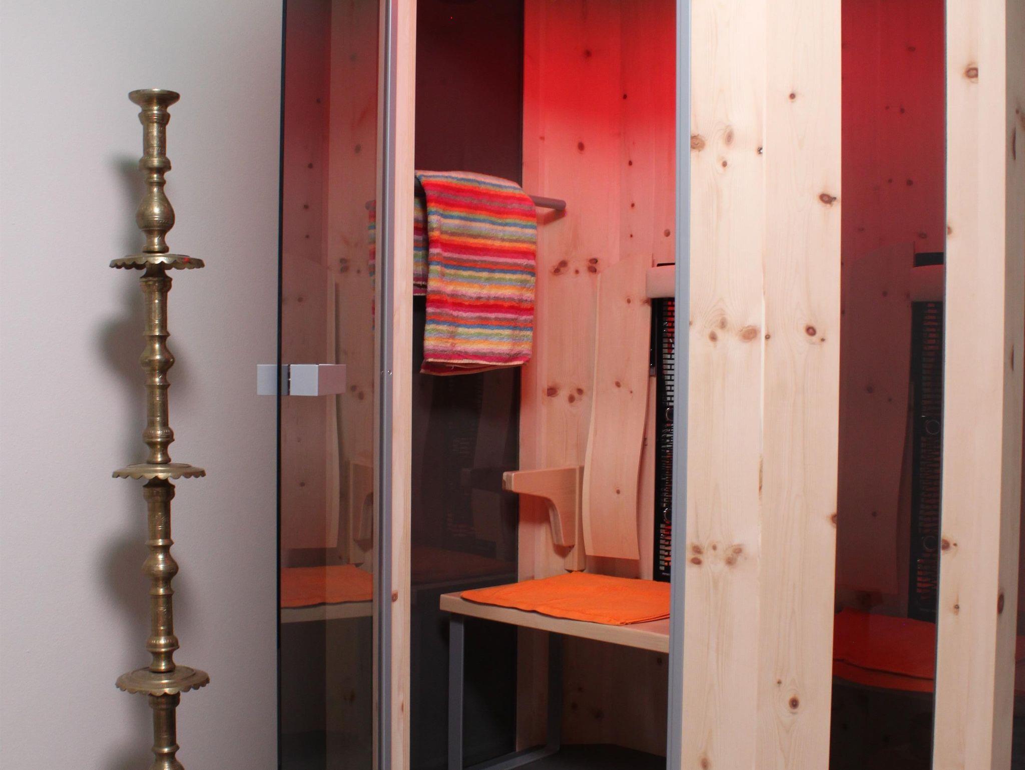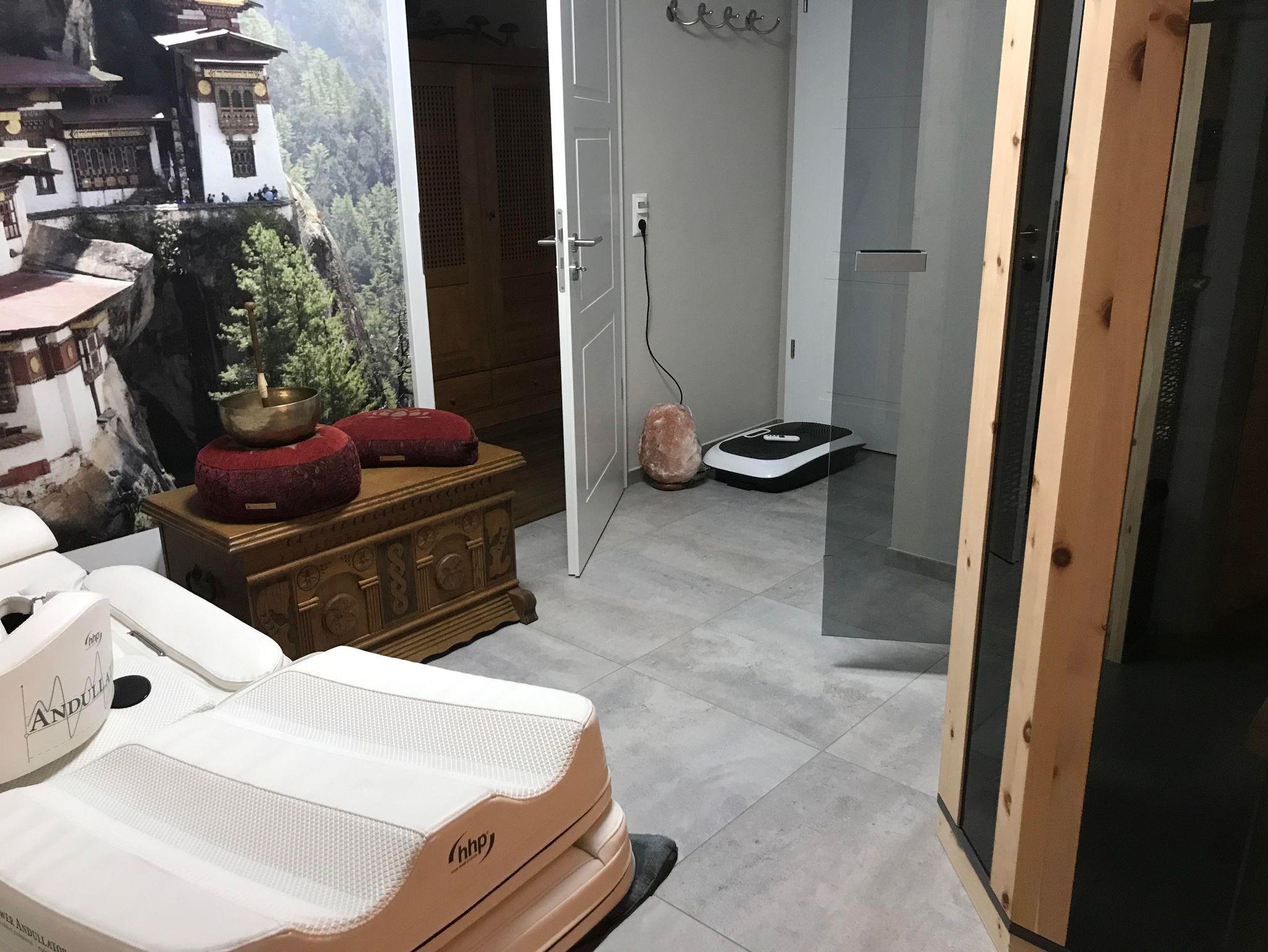 Desweiteren können Sie nach Absprache unseren kleinen Wellnessbereich benutzen. Dieser besteht aus einer Physiotherm Infrarot-Sauna einer HHP-Massageliege und einer hochwertigen Vibrationsplatte.