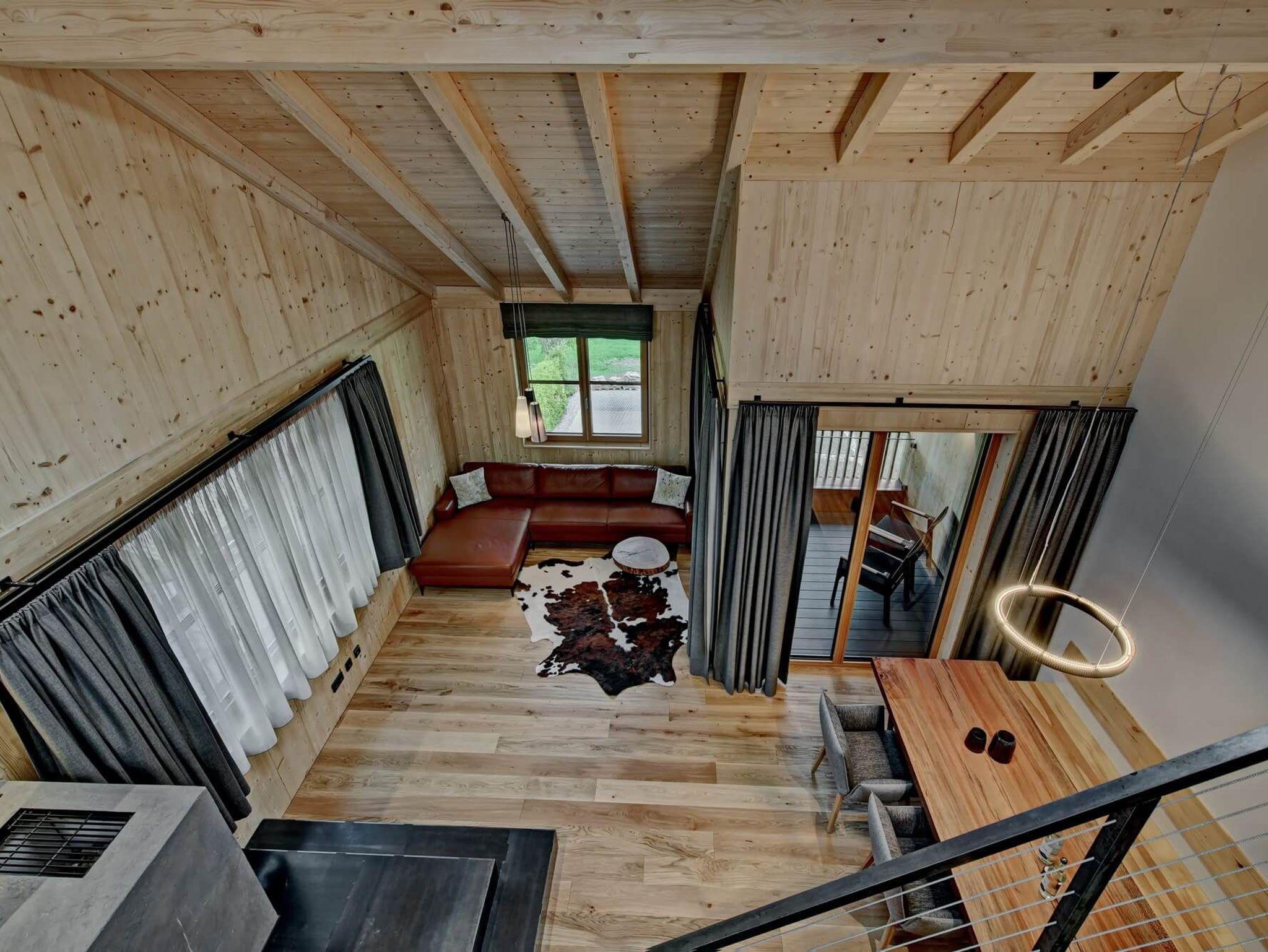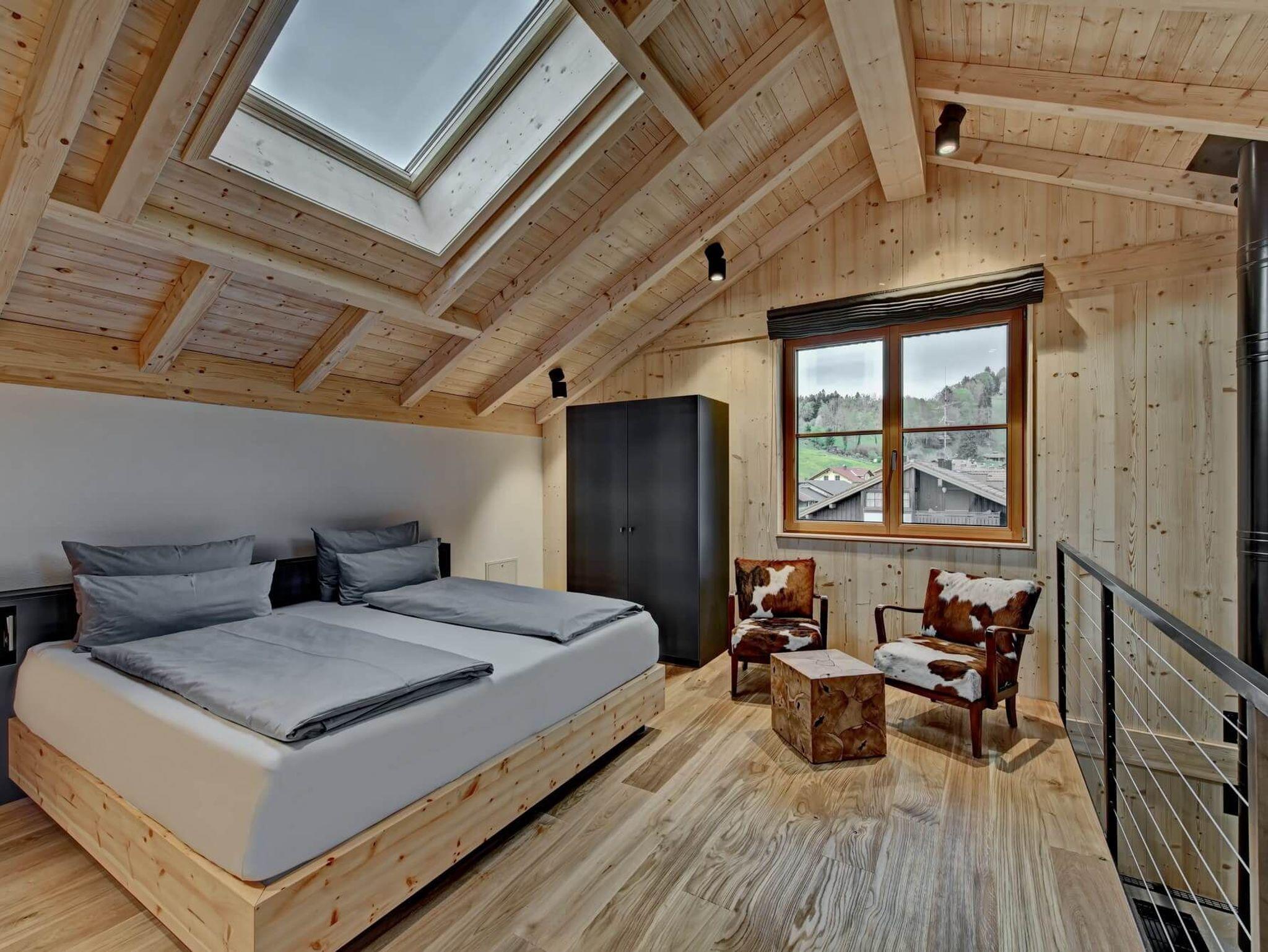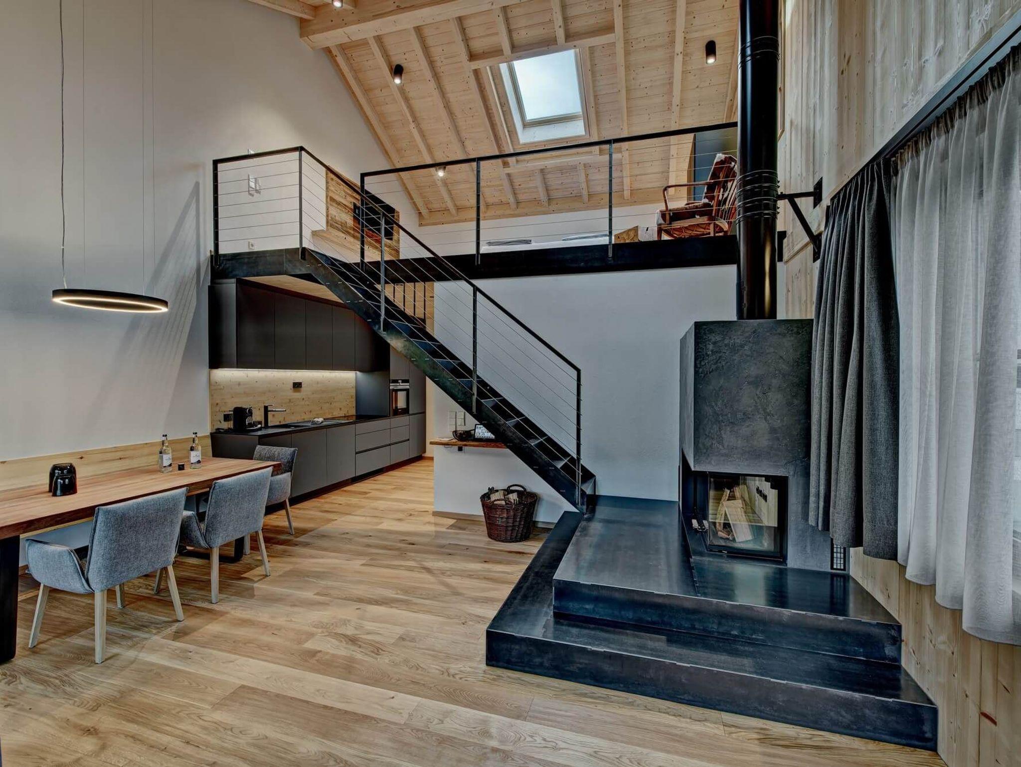 Die Architektur und Gestaltung dieses Chalets auf zwei Ebenen ist einzigartig. Der luftige Wohnraum öffnet sich zur Natur und der Loggia mit einzigartigem Blick. Über eine elegante Stahltreppe gelangen Sie auf die Galerie zu unserem Einzigartigen Schlafplatz in luftiger Höhe, ausgestattet mit einem King-Size Doppelbett (200x200) als Zirbelholz-Boxspringbett.