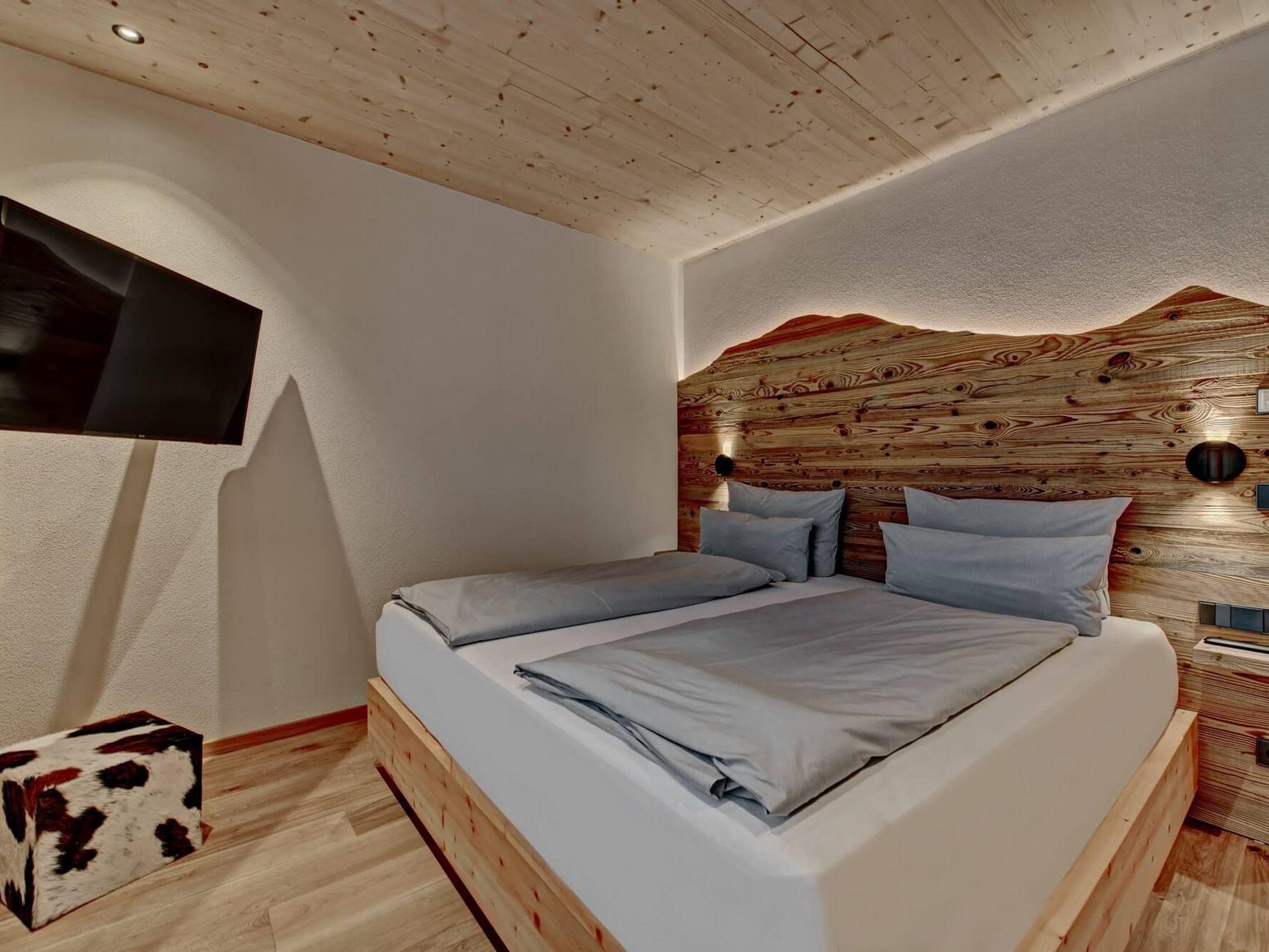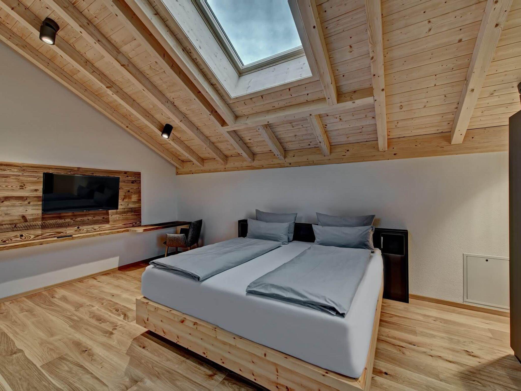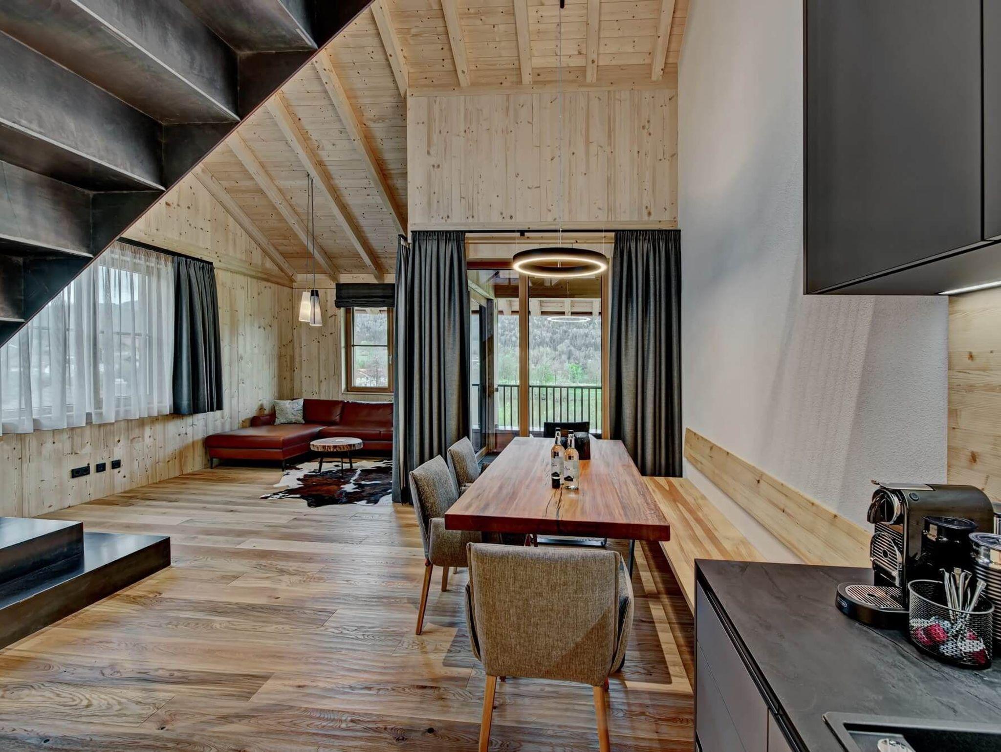 Die Architektur und Gestaltung dieses Chalets auf zwei Ebenen ist einzigartig. Der luftige Wohnraum öffnet sich zur Natur und der Loggia mit einzigartigem Blick. Über eine elegante Stahltreppe gelangen Sie auf die Galerie zu unserem Einzigartigen Schlafplatz in luftiger Höhe, ausgestattet mit einem King-Size Doppelbett (200x200) als Zirbelholz-Boxspringbett.