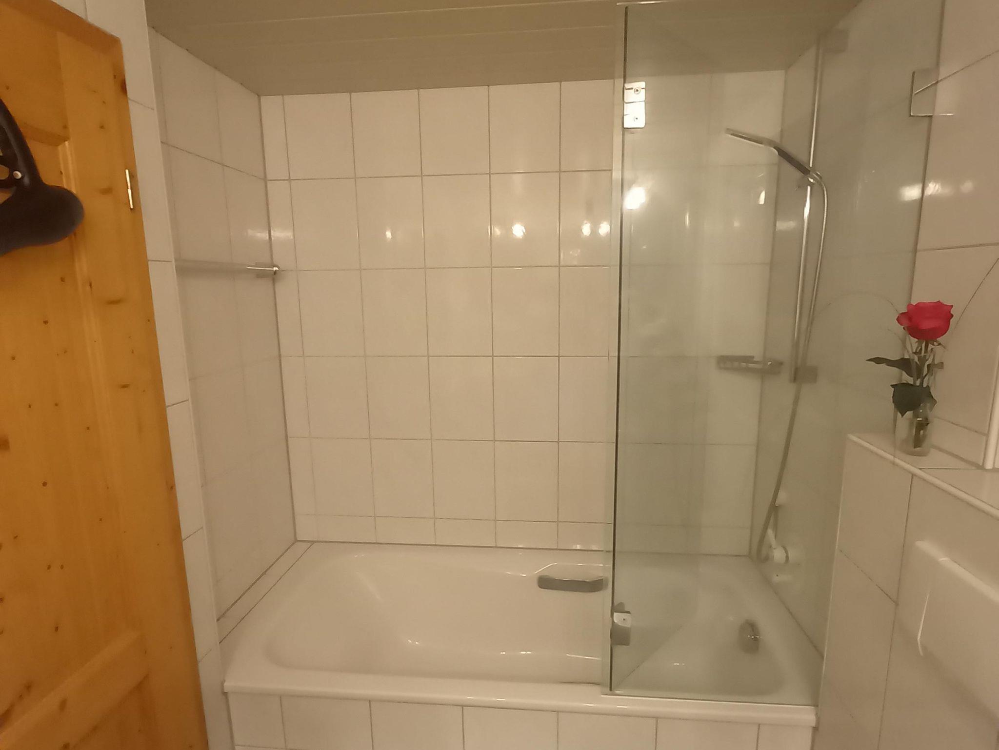 Im Erdgeschoss befinden sich das große helle Wohnzimmer mit Eckbank im Essbereich, kleiner Bar, gemütlichem Kachelofen mit Holzbank, mehrteiliger Sofasitzgruppe mit Glastisch, schwenkbarem Amazon TV und großem Schrank mit Spielen und Büchern. Hier sind 2 ausziehbare Schlafsofas vorhanden. Dieser Bereich hat ca.75m². Neben dem oberen Schlafzimmer befindet sich das Bad mit Doppelwaschbecken und einer Dusch- Badewannenkombination.