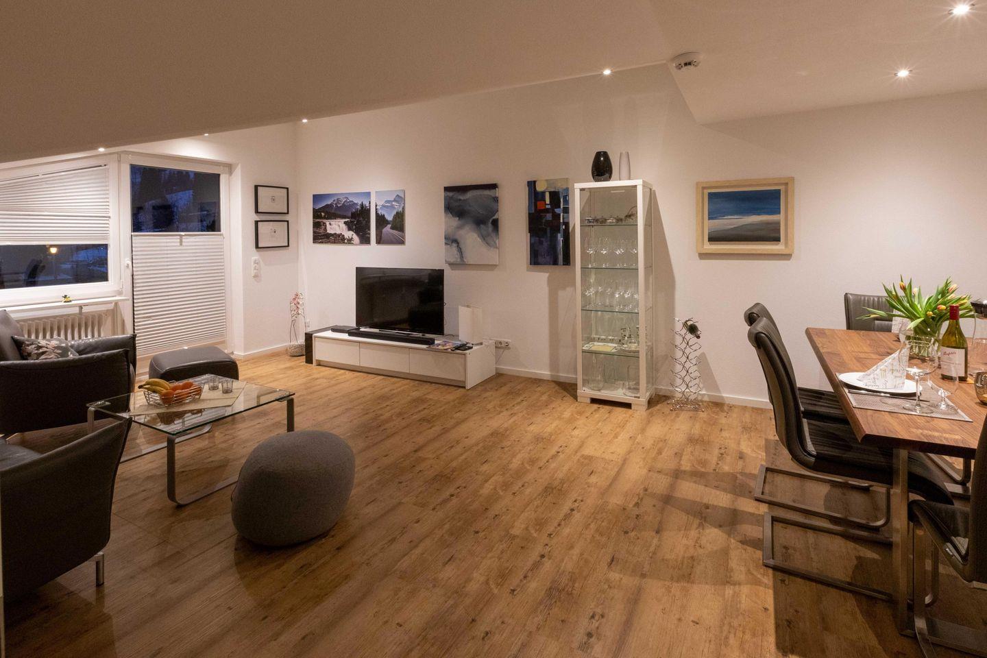 Machen Sie es sich gemütlich am großen Esstisch oder in der Ledersitzgruppe vor dem großen Flachbildfernseher mit Blue-Ray-Player. Ihre eigene Musik hören Sie mittels verschiedener Bluetooth-Lösungen im Wohnzimmer und in der Küche.