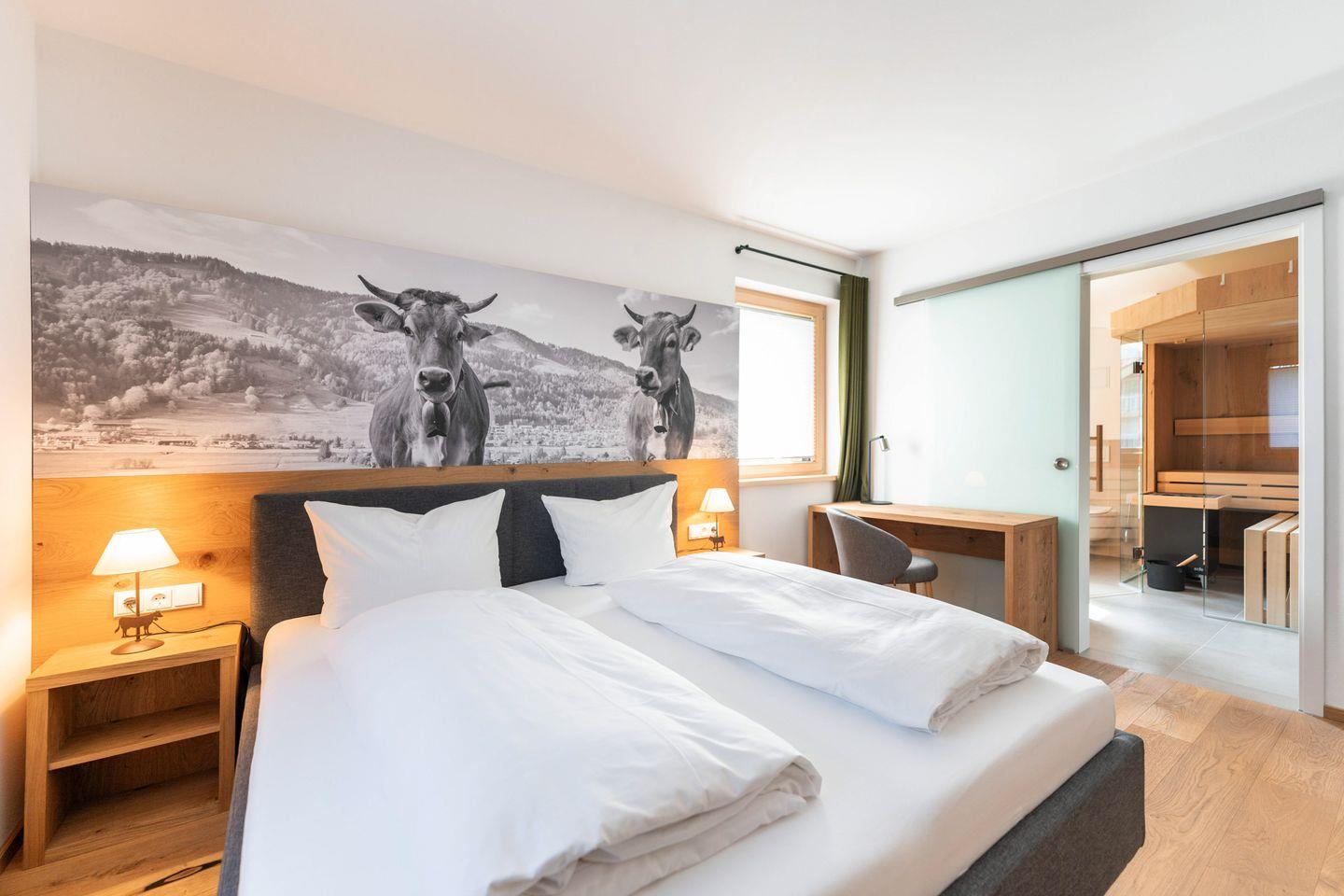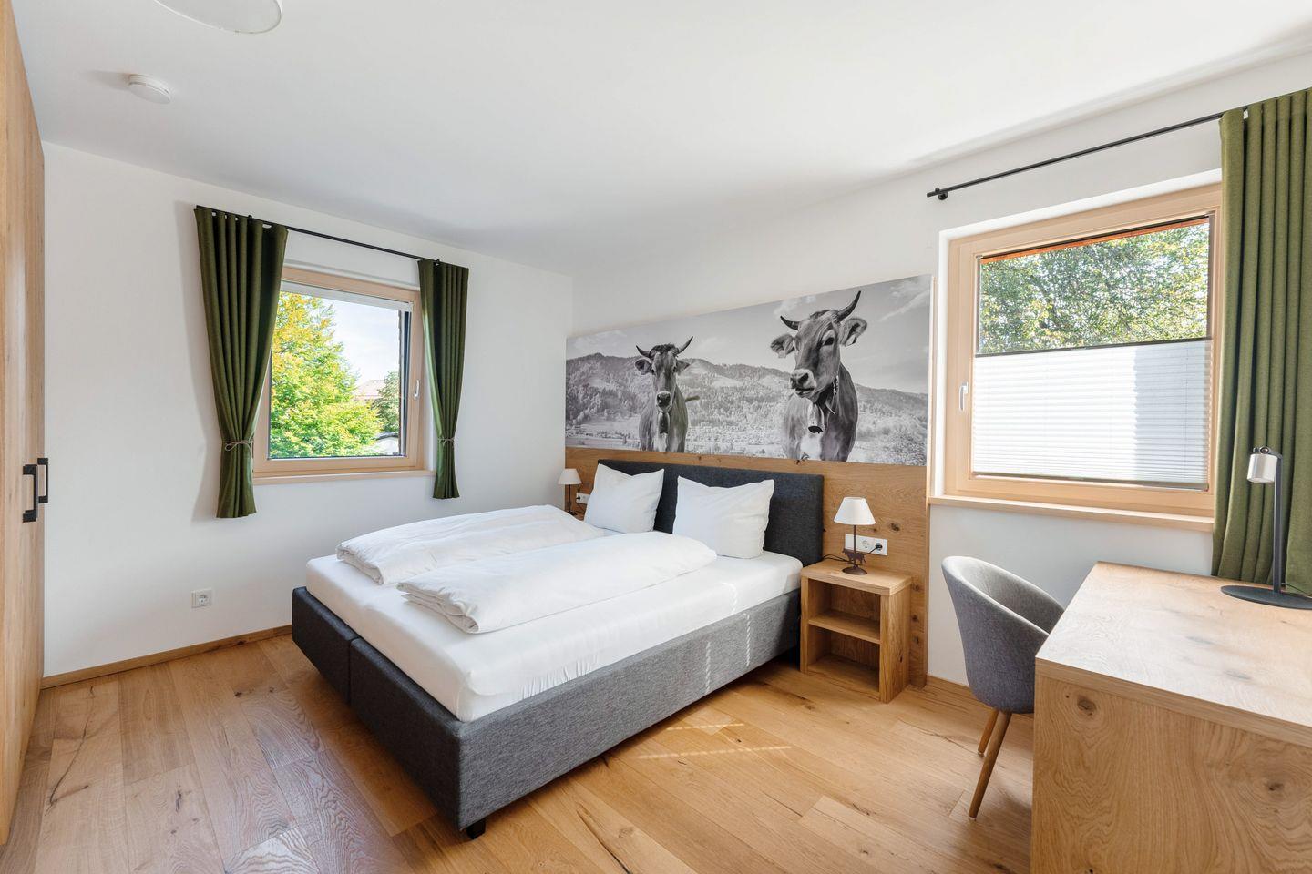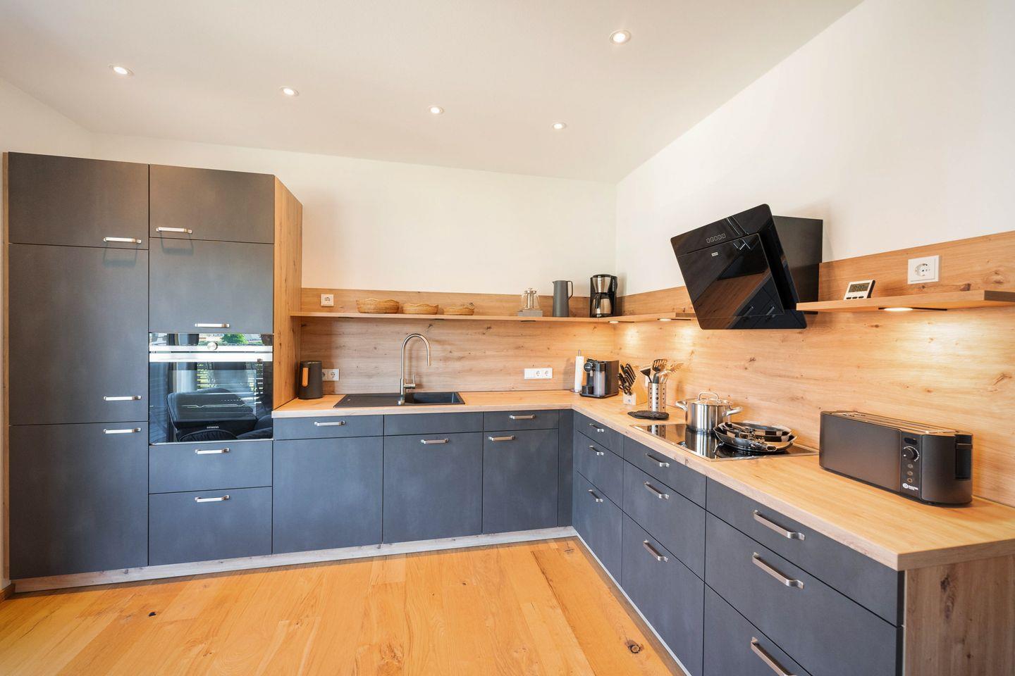 Seit Bezugsfertigkeit im Dezember 2023 erwartet Sie in unserer Ferienwohnung "Allgäuliebe", auf über 100 m² Grundfläche eine Wohnung zum Wohlfühlen mit einer exklusiven und hochwertigen Ausstattung: Echtholzparkett, Einbaumöbel und Altholzdekore vom lokalen Schreiner, sowie Boxspringbetten lassen keine Wünsche offen. Die barrierefreie Wohnung ist mit einem Aufzug im 1. Obergeschoss zu erreichen.