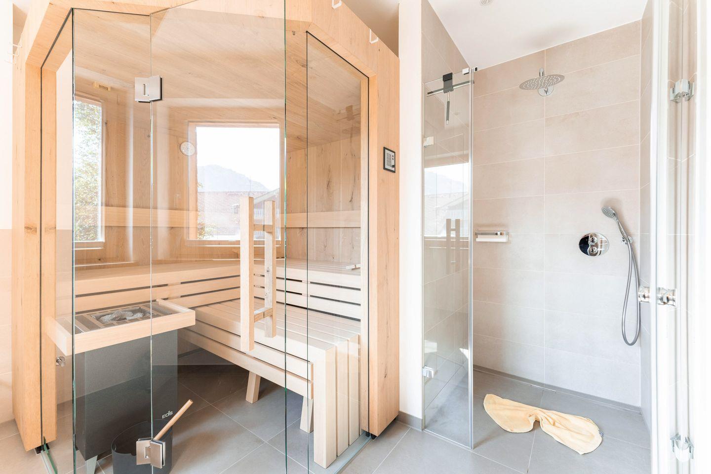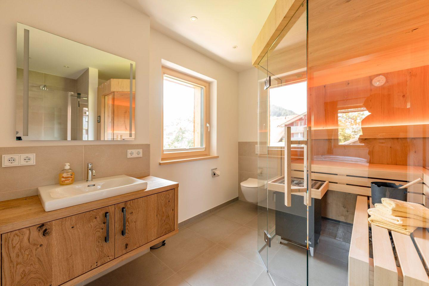 Entspannen Sie auf der großzügigen Sonnenterrasse, vor dem Kaminofen, in der eigenen Sauna oder genießen einfach nur die wunderschöne Landschaft.