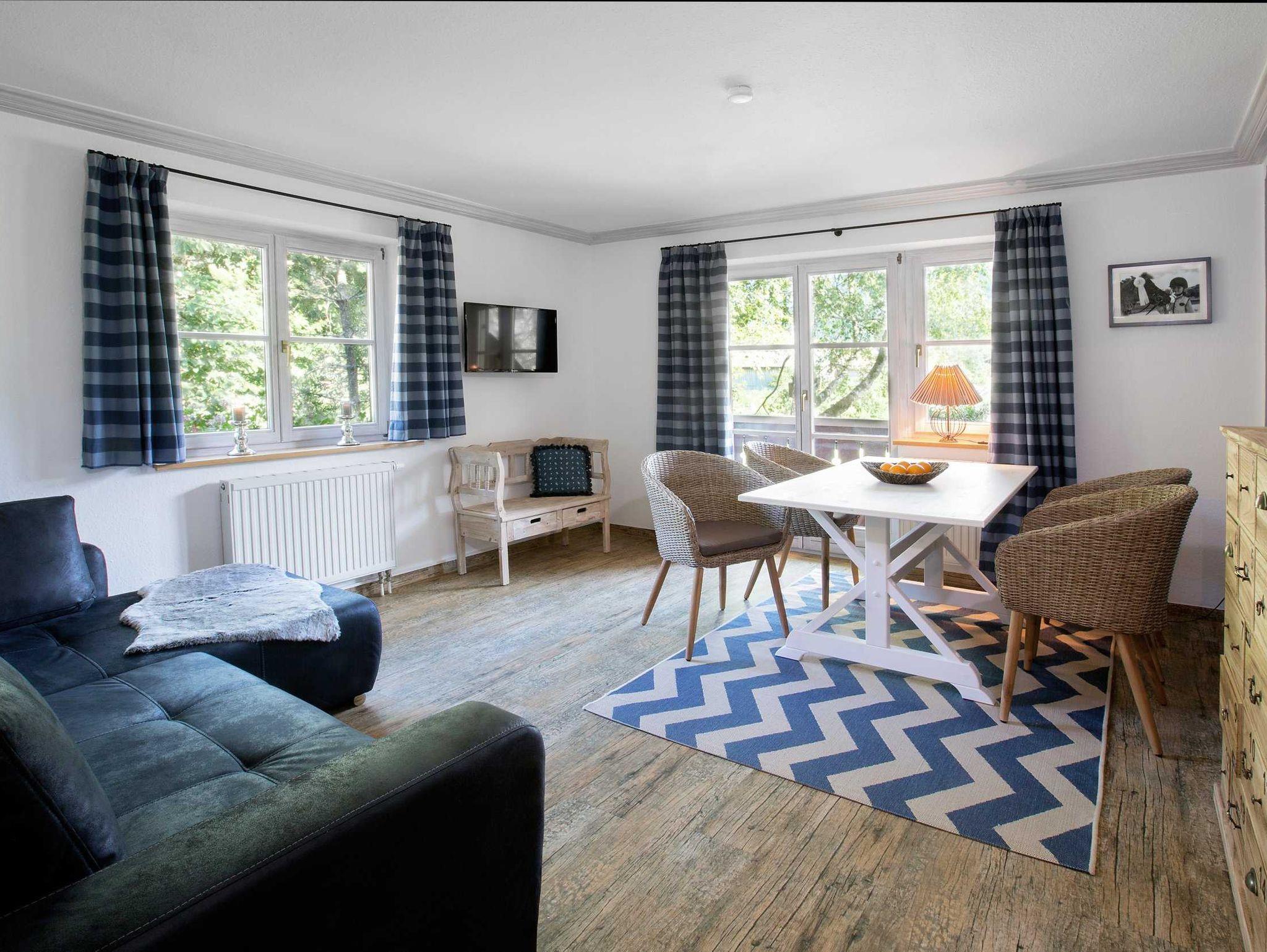 Die helle 5-Sterne-Ferienwohnung Rosmarin liegt im Erdgeschoss und hat eine sonnige Süd-Terrasse mit Blick über Wiesen bis in die Berge. Zwei Schlafzimmer und eine große Küche mit Esstisch im Landhausstil laden zum Entspannen ein.