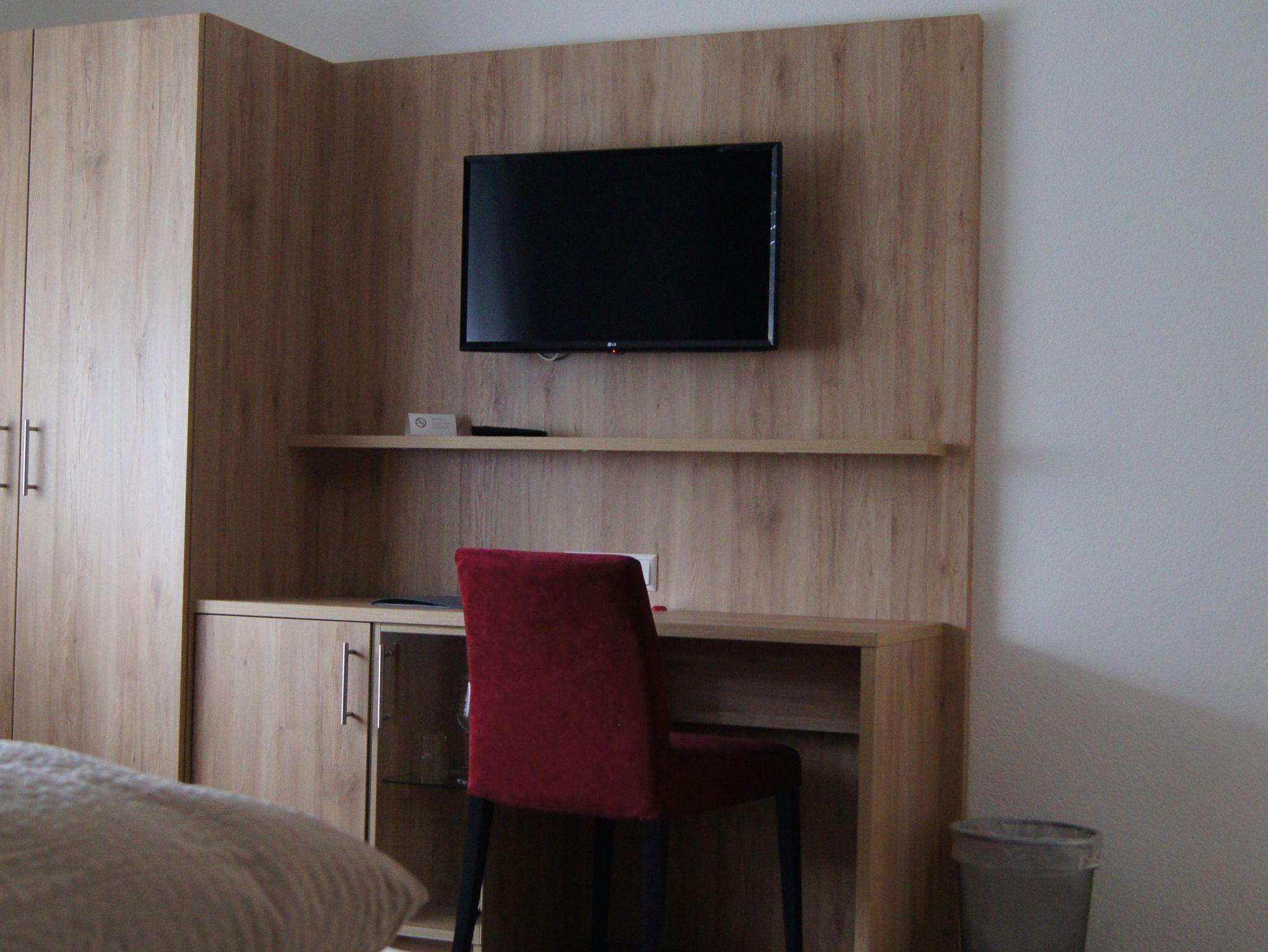 Aussattung: Doppelbett, Schreibtisch, Fernseher und ein Tresor.