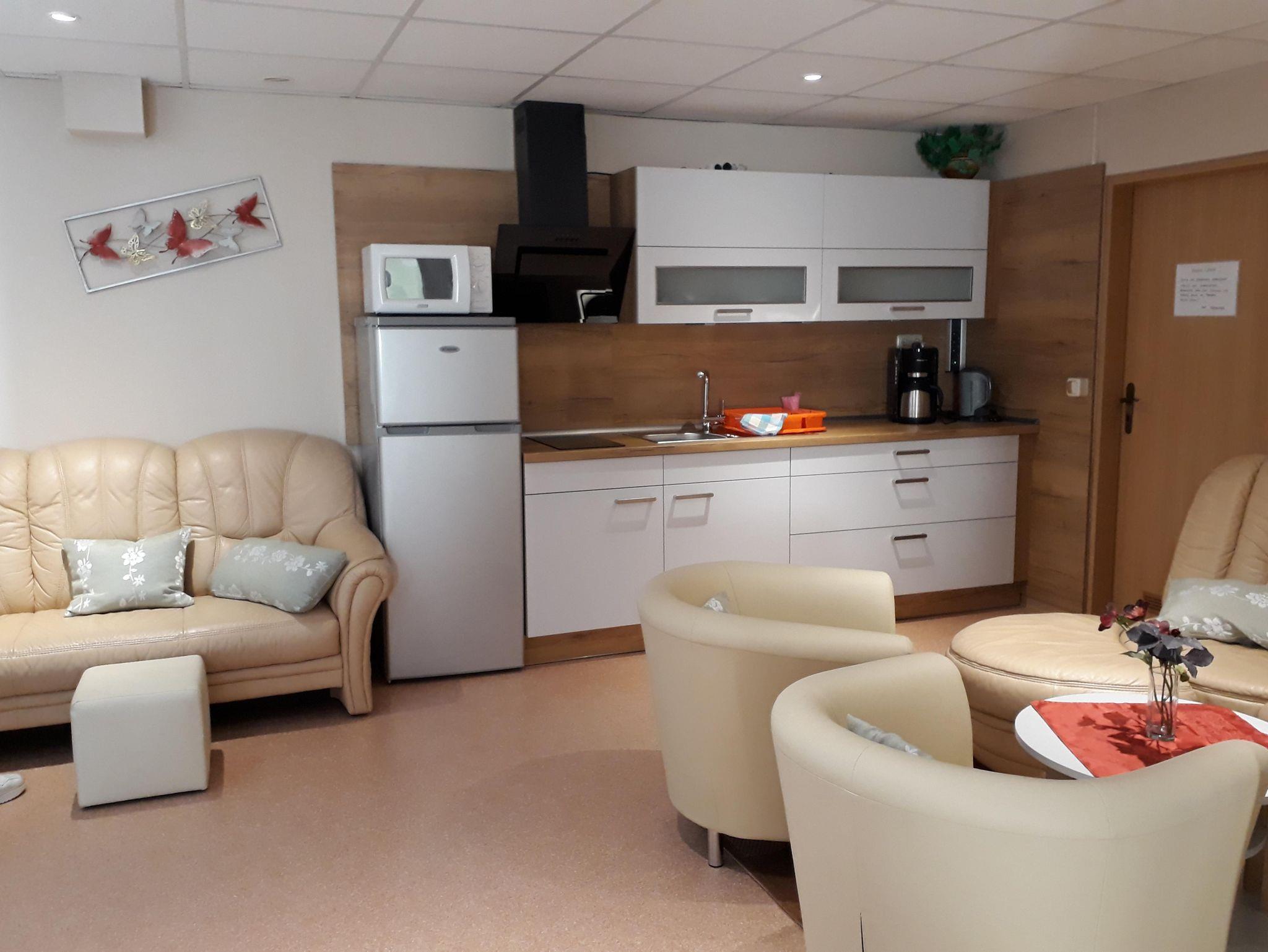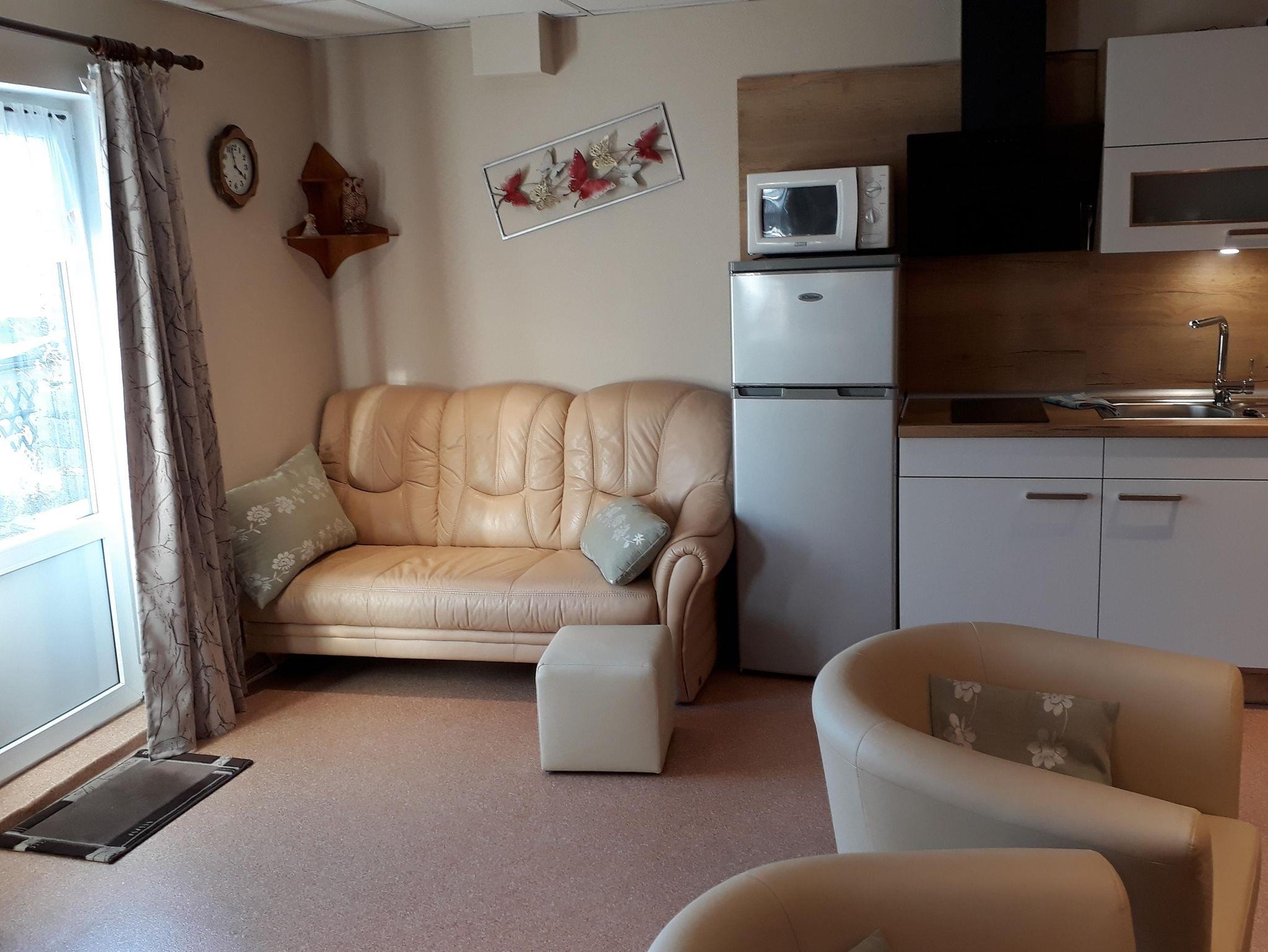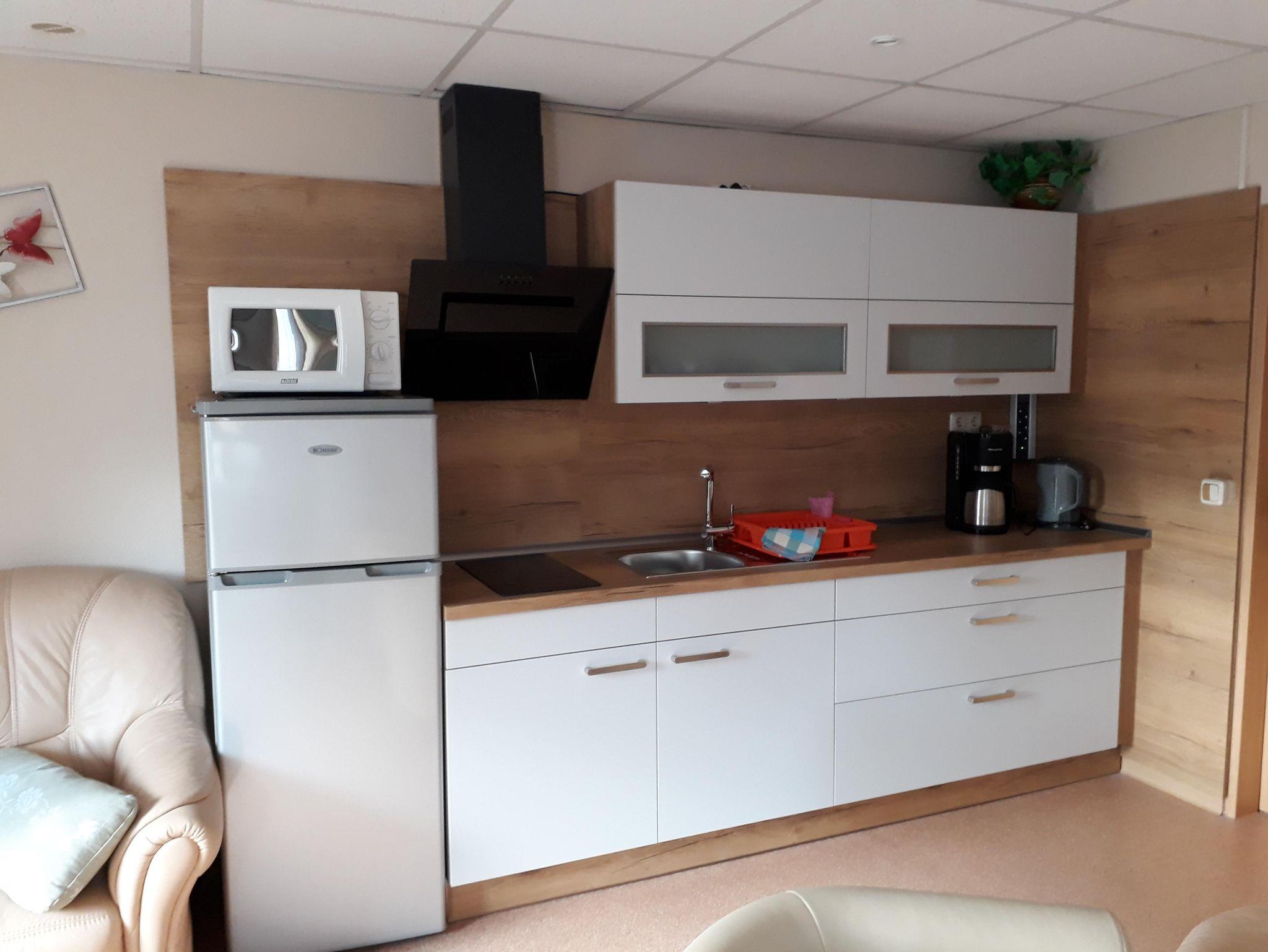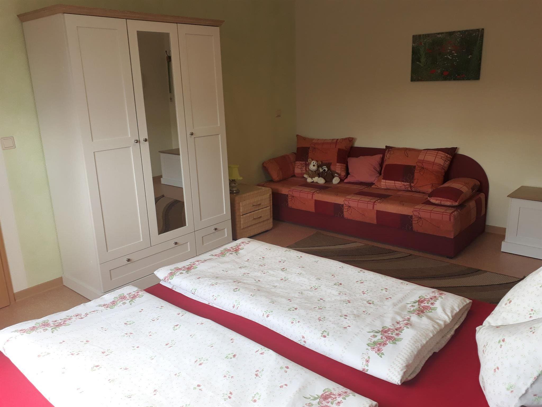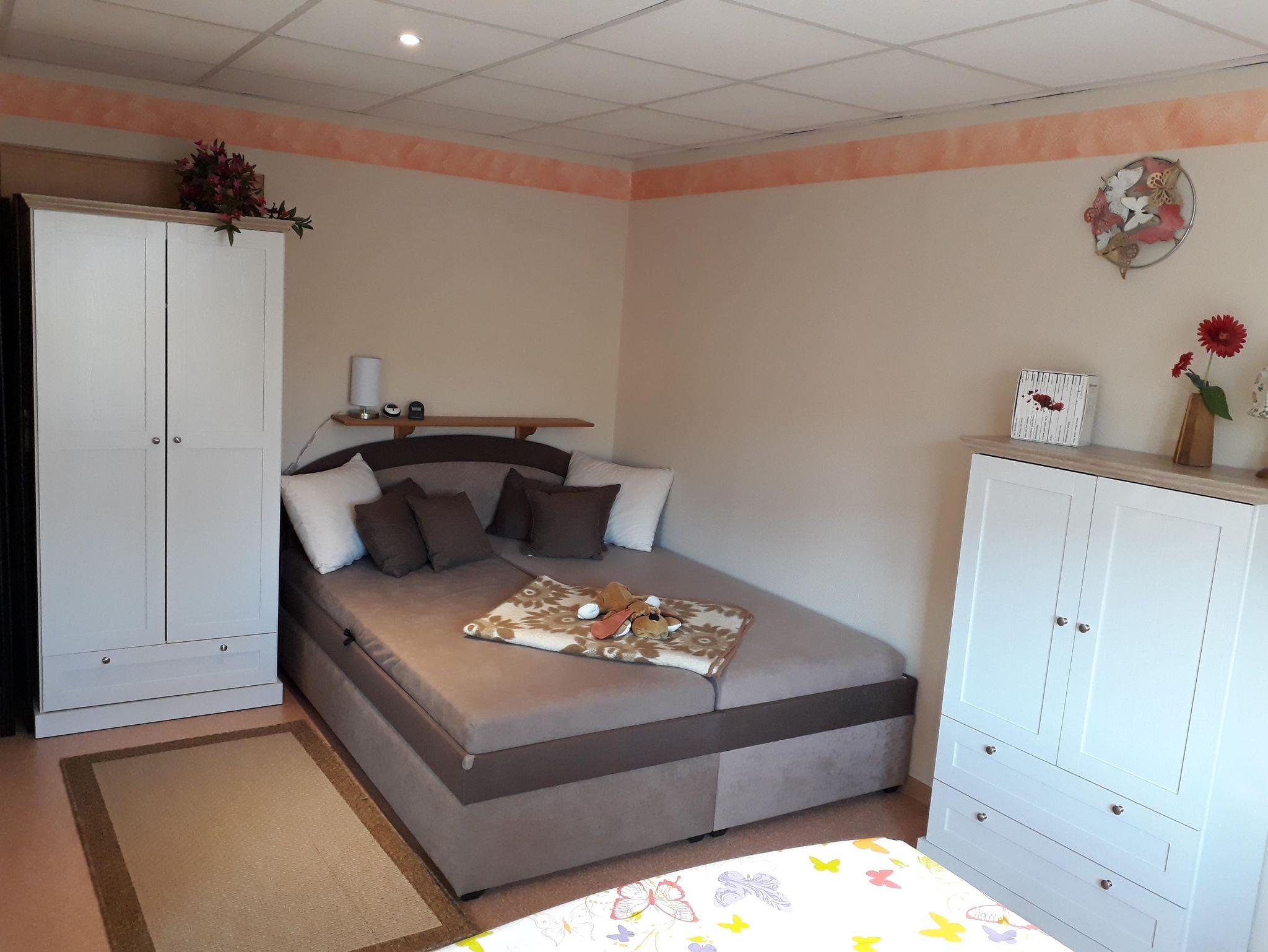 Die Wohnung ist mit einem separatem Schlafraum mit Doppelbett (160x200) und Kinderbett /Aufbettung für eine Person auf Anfrage. Im großen Wohnraum finden Sie ein Doppelbett (160x200), eine gemütliche Sitzgelegenheit, Fernseher, Essbereich und Küchenzeile. Küche und Essbereich sind komplett ausgestattet mit Kühl- und Gefrierschrank, 2 Elektro-Kochplatte, Kaffeemaschine, Wasserkocher, Mikrowelle, Toaster und komplettem Geschirr. Das Bad verfügt über eine Dusche und WC. Vom Wohnzimmer gelangen Sie von Frühling bis Herbst auf die schöne Süd-Terrasse, mit Außensitz.