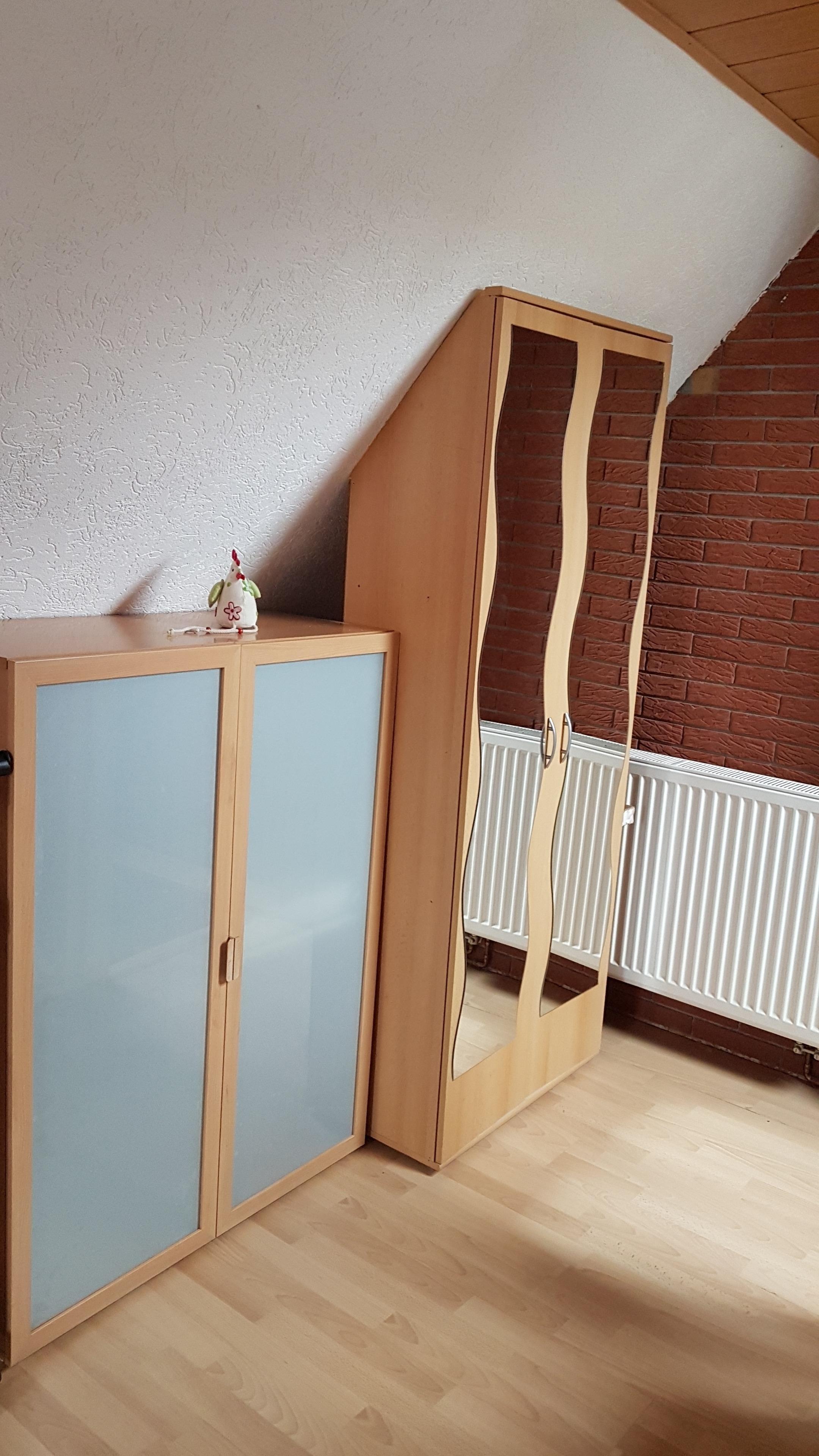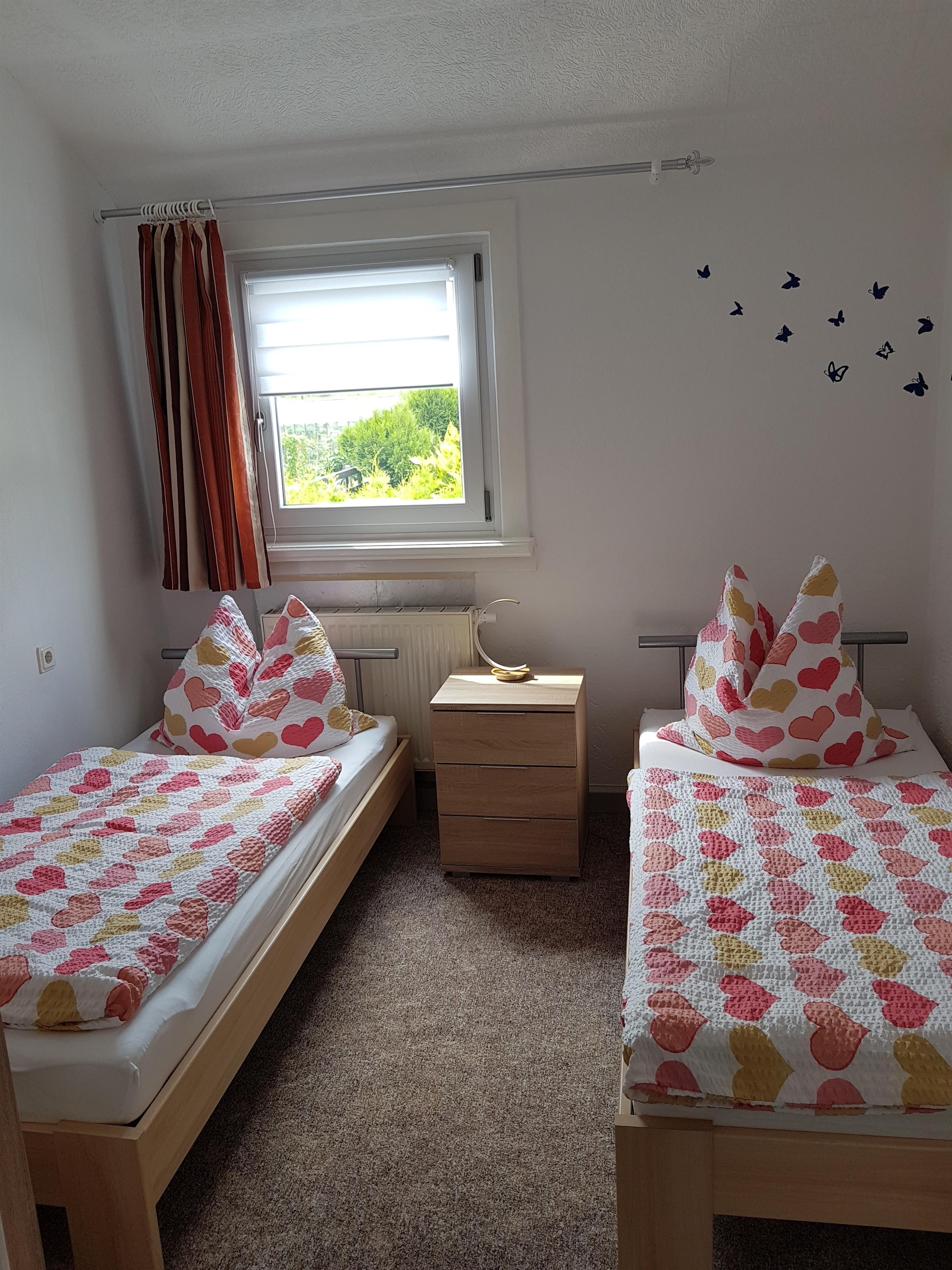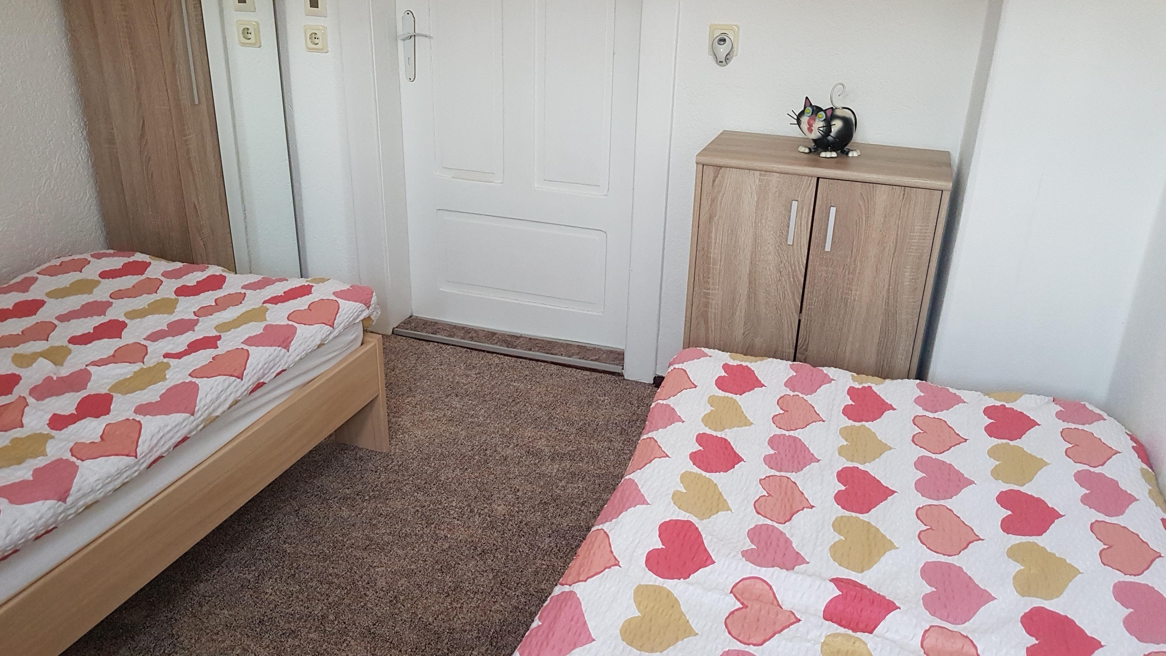 Das Schlafzimmer ist mit einem Doppelbett und einem Einzelbett ausgestattet. Das Doppelbett kann in zwei Einzelbetten umgewandelt werden. Ein Kleiderschrank mit Spiegel ist vorhanden. Das Schlafzimmer befindet sich unter dem Dach. Bei sommerlichen Temperaturen heizt sich dieser Raum natürlich etwas auf.