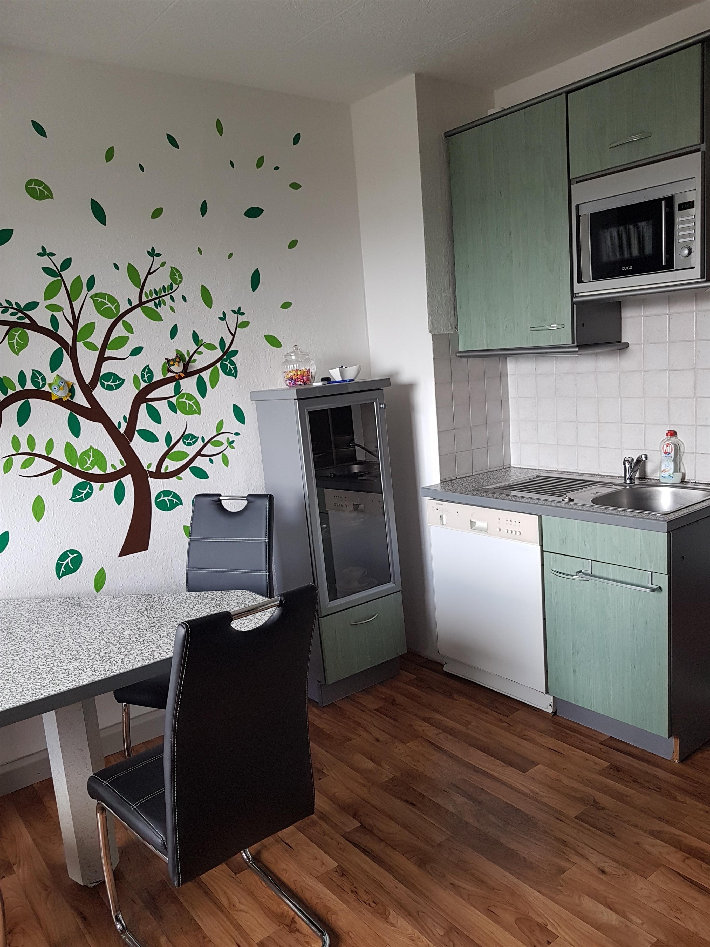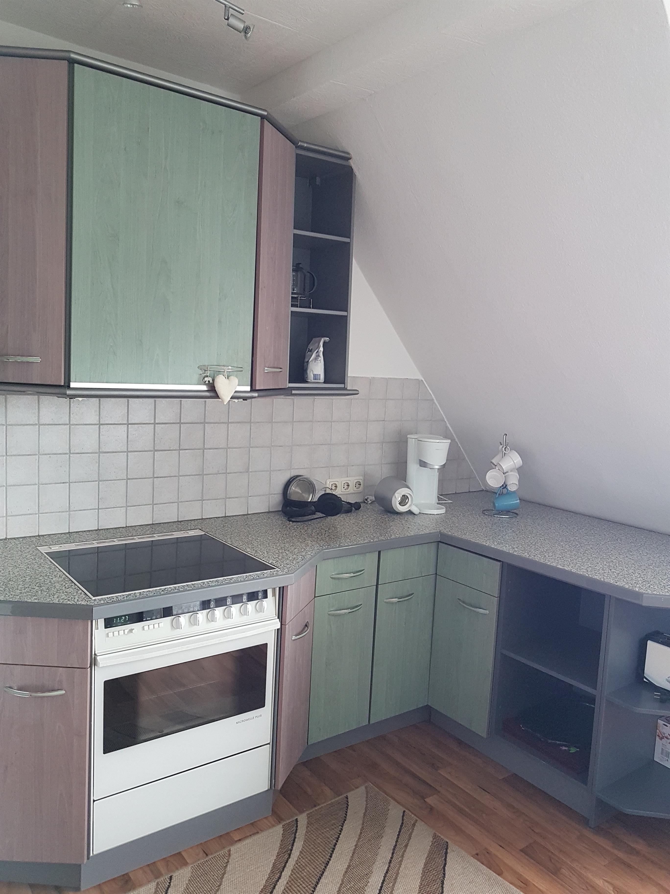 Die Küche bietet Backofen mit integrierter Mikrowelle, Cerankochfeld, Kühl- Gefrierkombination und Geschirrspülmaschine. Vorhanden sind ebenfalls Kaffeèmaschine, Mikrowelle (Einzelgerät) bzw. Wasserkocher und Eierkocher.
