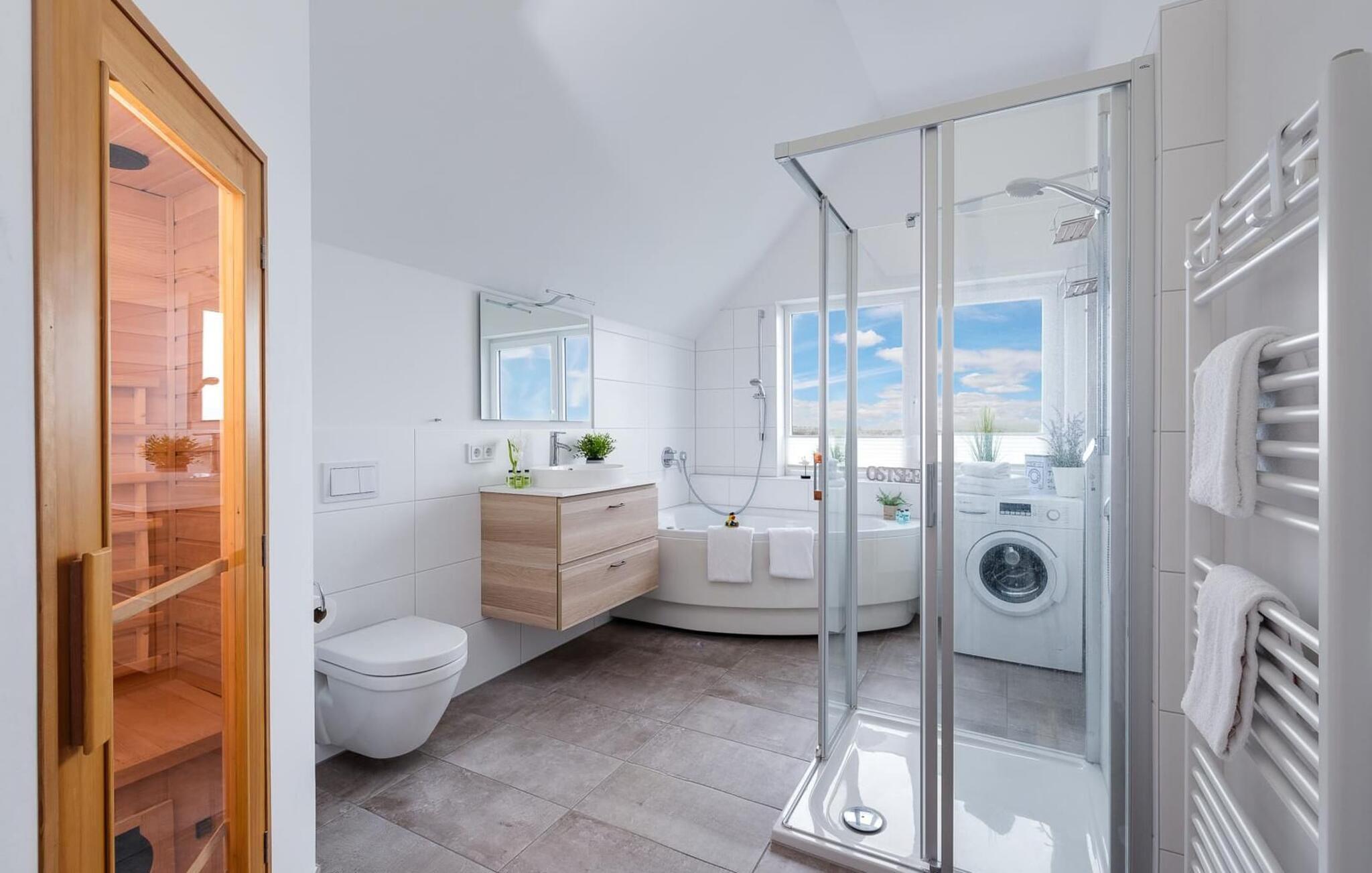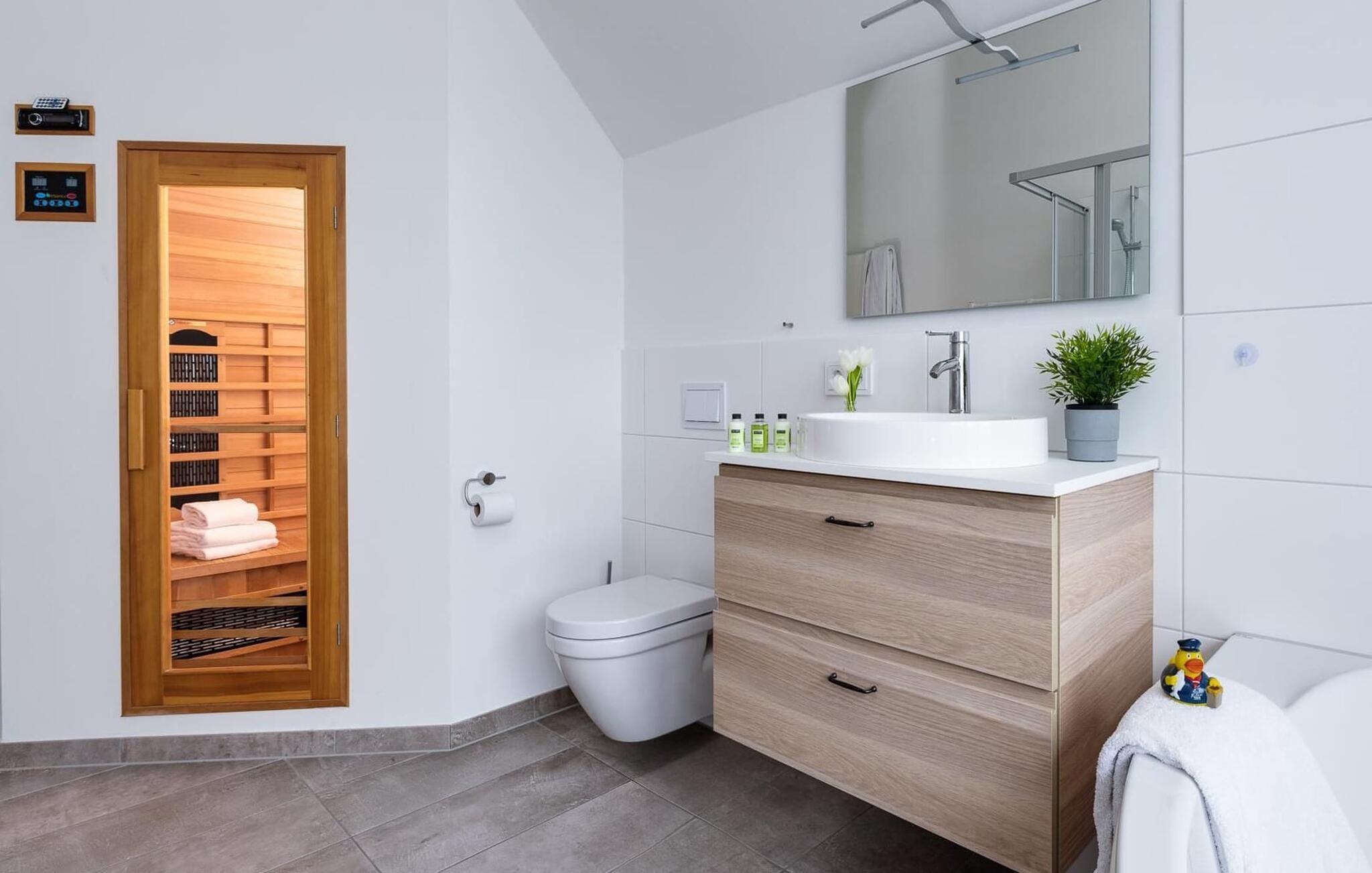 Det private velværeområdet innbyr til avslapping: En infrarød varmekabine med hi-fi-lydanlegg og LED-fargelysterapi samt et stort, avslappende boblebad med utsikt over vannet står til disposisjon etter en tur på stranden.