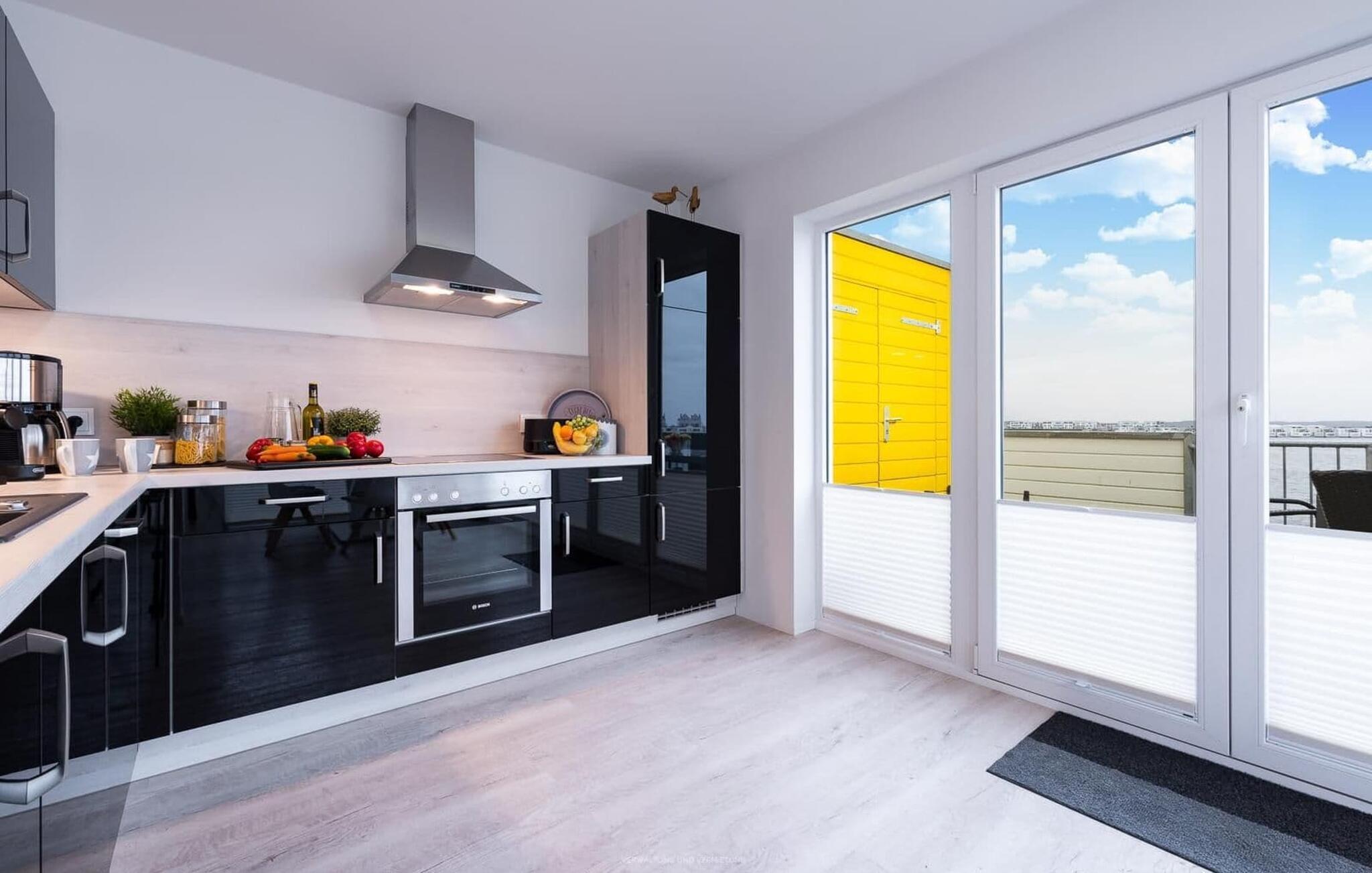 Leiligheten har en lys stue/spisestue med panoramavinduer fra gulv til tak som vender ut mot de tilstøtende terrassene på begge sider. Terrassen ved siden av spisestuen har fantastisk utsikt over seil- og sportsbåthavnen i OstseeResort Olpenitz. Her er det garantert havnekino og romantiske solnedganger, og du kan også slappe av med en god bok.