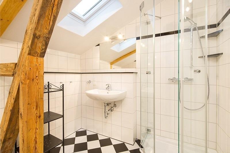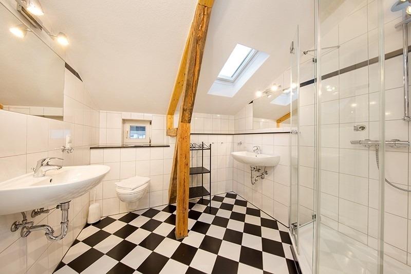 Badezimmer mit Fenster, Glasdusche, 2 Waschbecken, Spiegel, WC, Handtuchheizkörper und Föhn (Dachschräge)