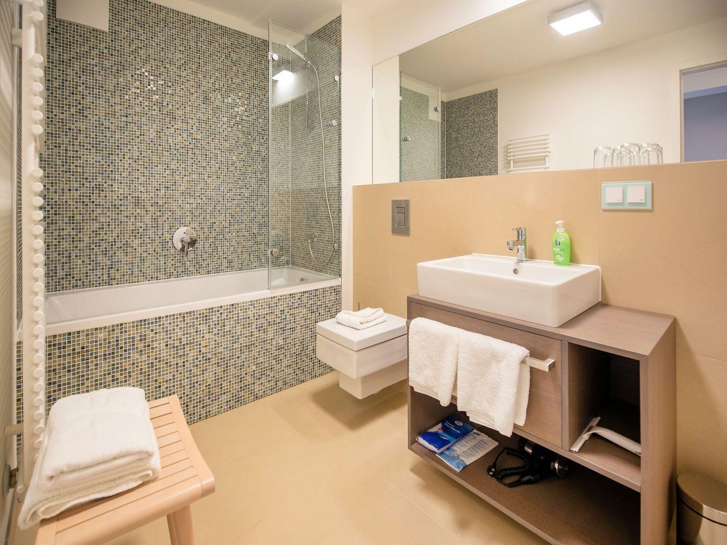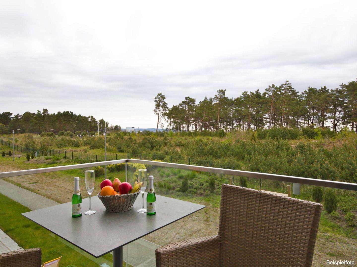 Dünenresidenz Neues Prora, Wohnzimmer mit LCD-TV, Balkon mit Meerblick, eingerichtete Küchenzeile mit Geschirrspüler und Backofen, Nespresso - Kaffeemaschine, 1 Schlafzimmer mit Doppelbett und Fernseher, ein Schlafzimmer mit 2 Einzelbetten, Bad mit Badewanne, Gäste-WC, kostenfreier WLAN-Anschluss, Haustiere nicht erlaubt, Nichtraucher, eigener Strandkorb (Mai - September) inklusive, max. 4 Personen