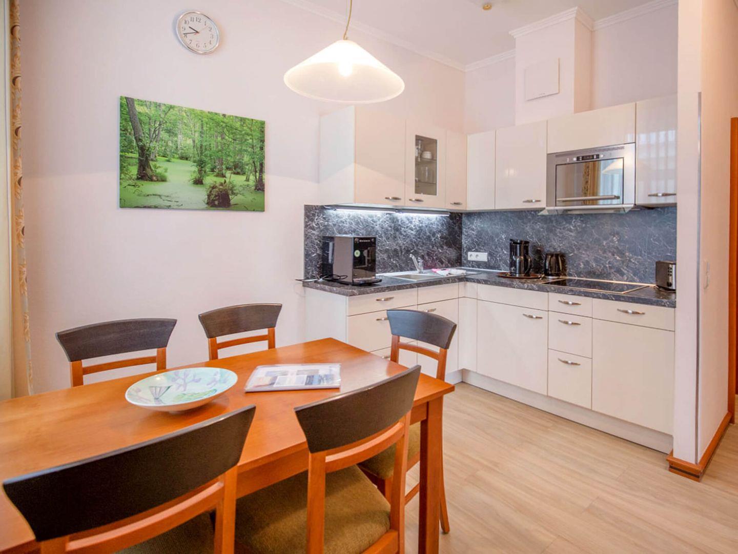 Die Besonderheit dieser hübschen Ferienwohnung ist das Wohnzimmer mit seeseitiger Fensterfront. Hier stehen ein Schlafsofa, wie auch ein SMART- TV, ein DVD-Player und eine Stereo-Anlage. Küche und Essbereich liegen separat, hier gibt es ein Cerankochfeld, einen Geschirrspüler, eine Mikrowelle, einen Melitta Kaffeevollautomat CAFFEO® SOLO®, einen Wasserkocher und einen Toaster ausgestattet. Im Kinderschlafzimmer steht ein Doppelstockbett, das Elternschlafzimmer bietet ein Doppelbett und einen LCD-Fernseher. Das Badezimmer überzeugt mit einer geräumigen Dusche, einem Waschbecken, einem WC und einem großen Spiegel. Das Apartment hat alternativ eine Verbindungstür zum Apartment 707 und bietet somit durchaus viel Platz und Freiraum für bis zu 8 Personen. In der Zeit von Mai bis September ist ein eigener Strandkorb am Strand gegen Aufpreis buchbar.