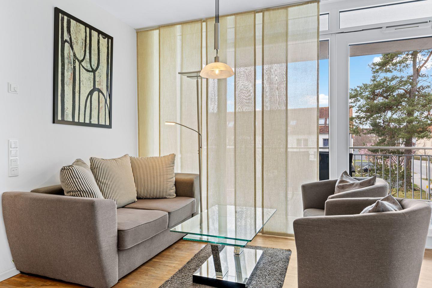 Das Apartment befindet sich im 1. Obergeschoss der Apartmentanlage – in sonniger Südwestlage und nur 150 Meter vom Ostseestrand und der Binzer Seebrücke entfernt.