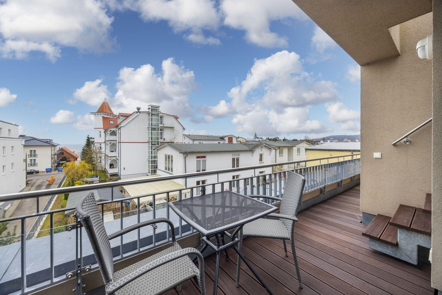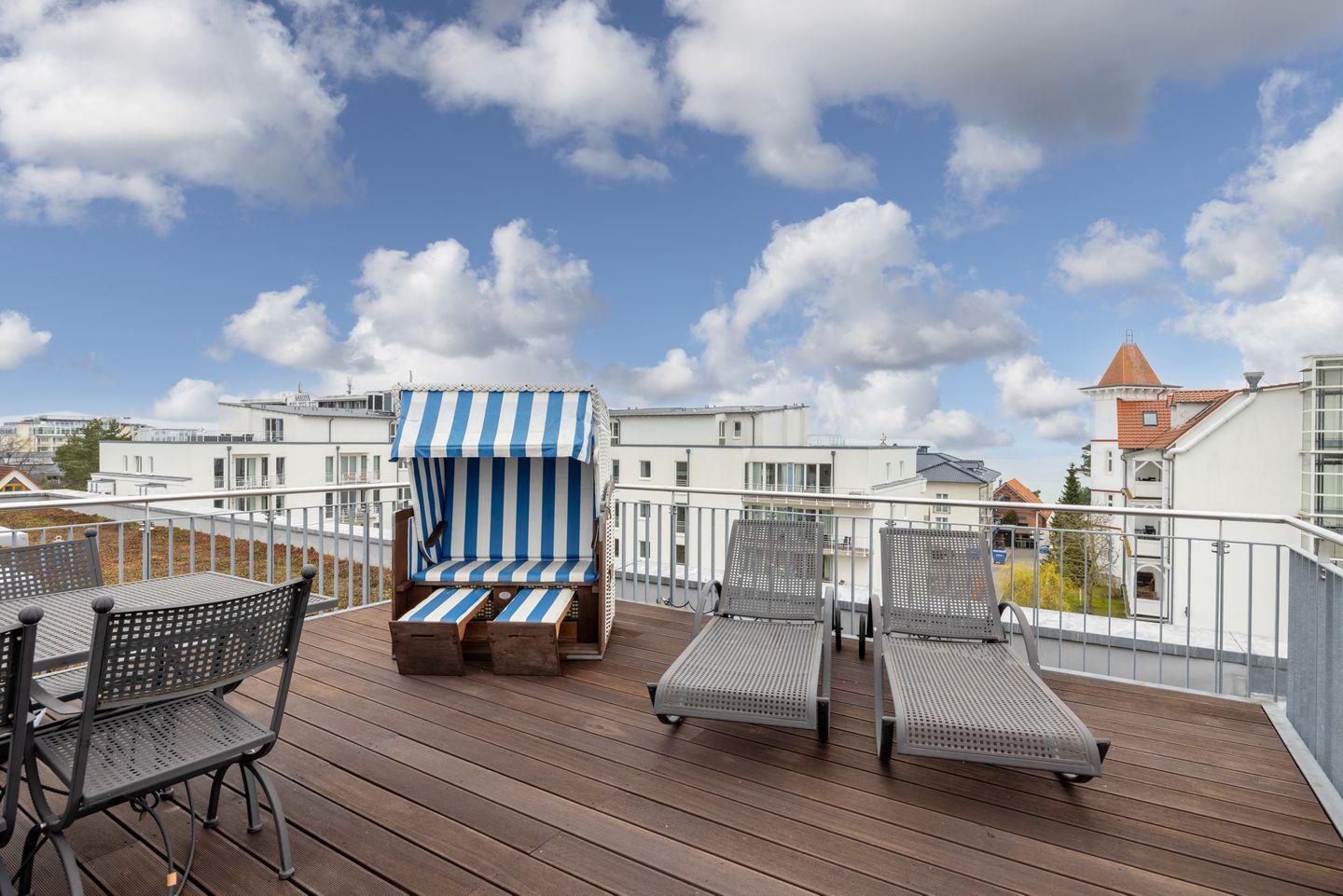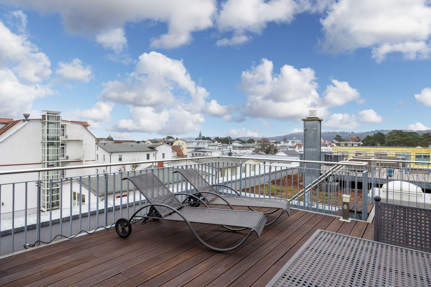 Von der Dachterrasse, erreichbar über eine Treppe, genießt ihr einen wundervollen Blick auf die Ostsee, den See- und Granitzwald sowie das Zentrum von Binz. Ein weiteres Highlight ist die private Sauna, die euch zum Entspannen einlädt.