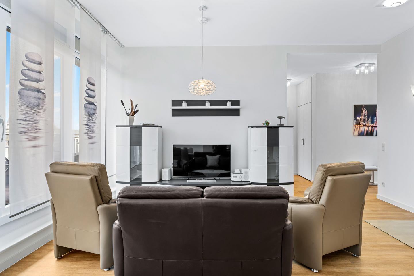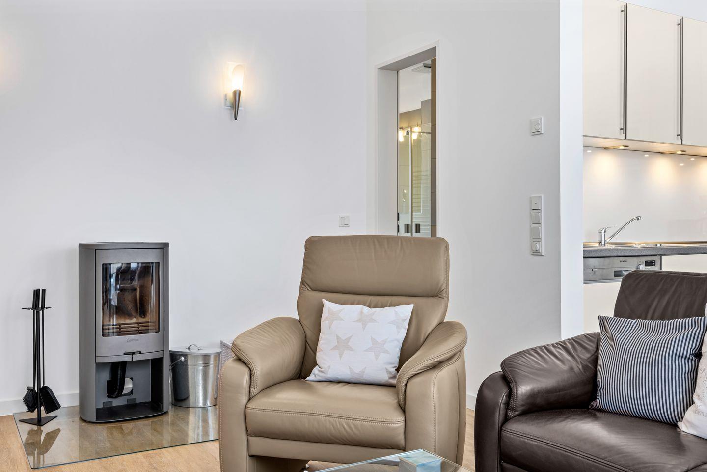 Das modern eingerichtete Apartment mit kostenfreiem WLAN verfügt über zwei Schlafzimmer mit einem Doppelbett bzw. zwei Einzelbetten. Im Wohnzimmer mit Ostseeblick sorgt ein Kaminofen für behagliche Gemütlichkeit (Kaminholz ist nicht inbegriffen). Die Ausstattung ergibt sich weiterhin aus einem hochwertigen Bad mit Dusche, Kosmetikspiegel und Föhn, einem separaten WC, Waschmaschine sowie einer voll ausgestatteten, offenen Küche mit Backofen, Geschirrspüler und Mikrowelle.