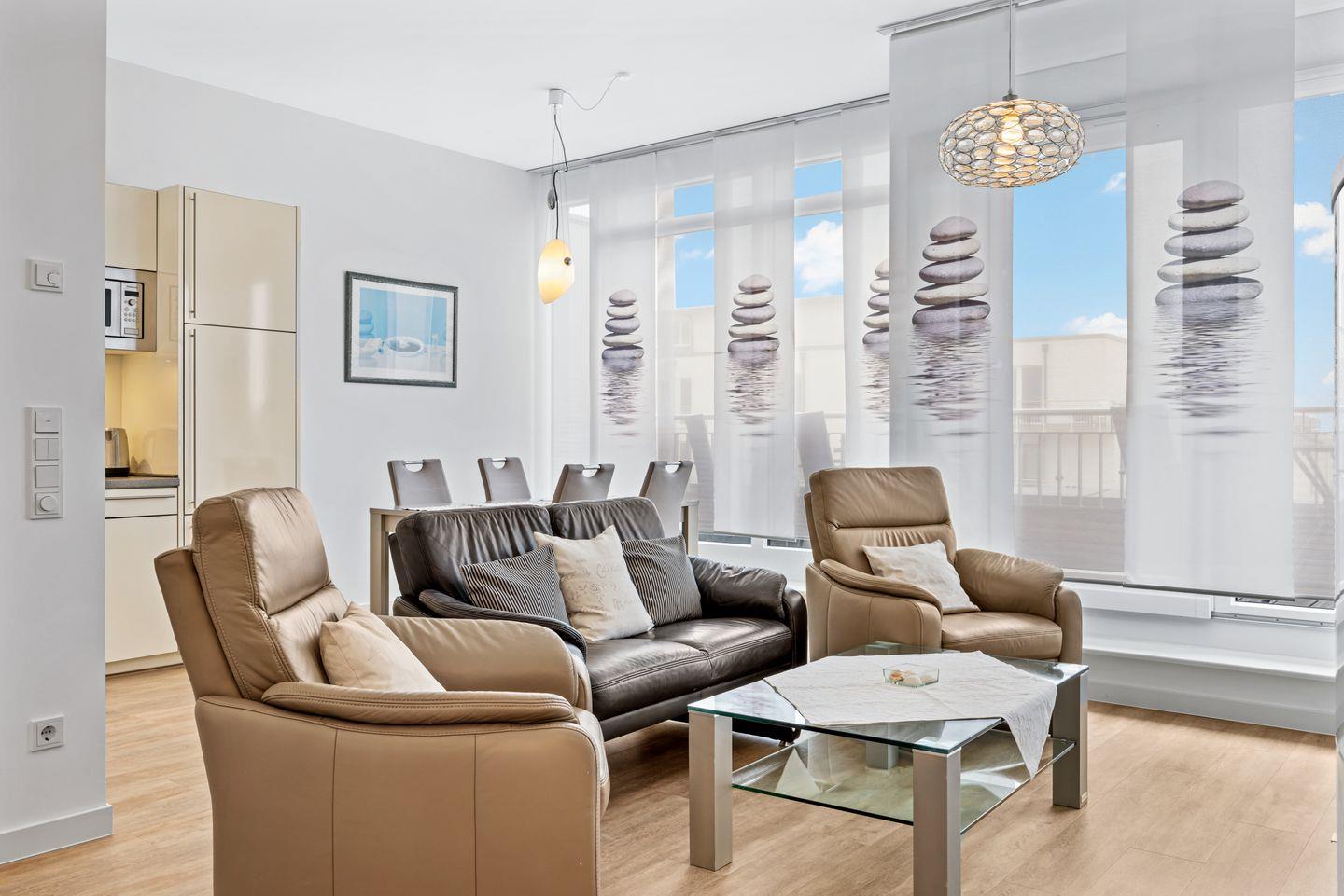 Das 112 qm große und exklusive 3-Zimmer-Penthaus mit Meerblick, Kaminofen, Sauna, Dachterrasse und Balkon in unmittelbarer Strandnähe begrüßt euch mit bis zu 4 Personen. Genießt das wohltuende Meeresklima im stilvollem Ambiente des erstklassig gelegenen Dünenresorts in Binz.
