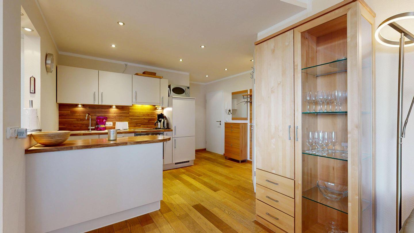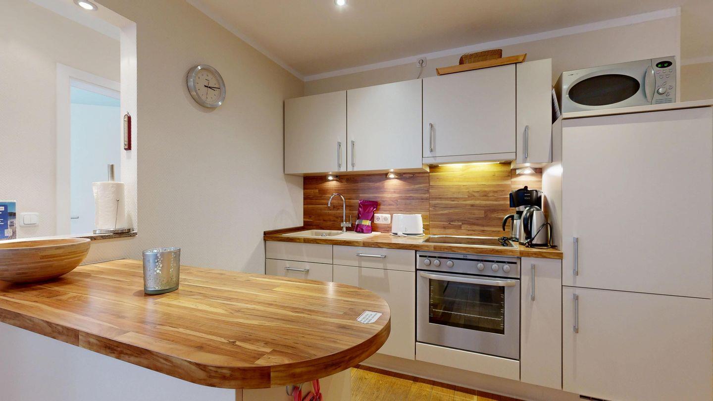 * Küche: Moderne Küchenzeile, E-Herd mit Backofen, Spülmaschine, Mikrowelle, Kaffeemaschine, Wasserkocher und Toaster
