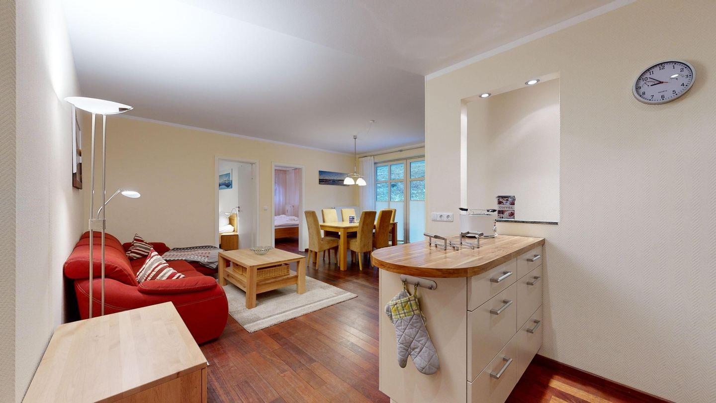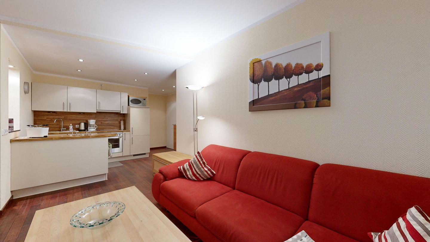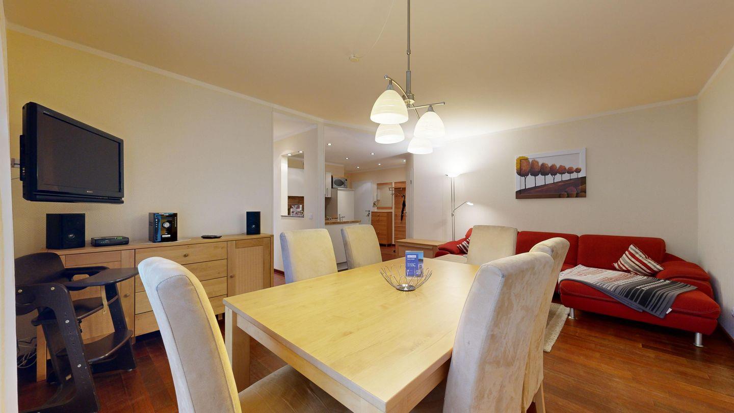 * Wohnzimmer: Echtholzparkett-Böden, große Couch, Kabel-TV, CD-Player, WLAN-Internetanschluss, Essplatz